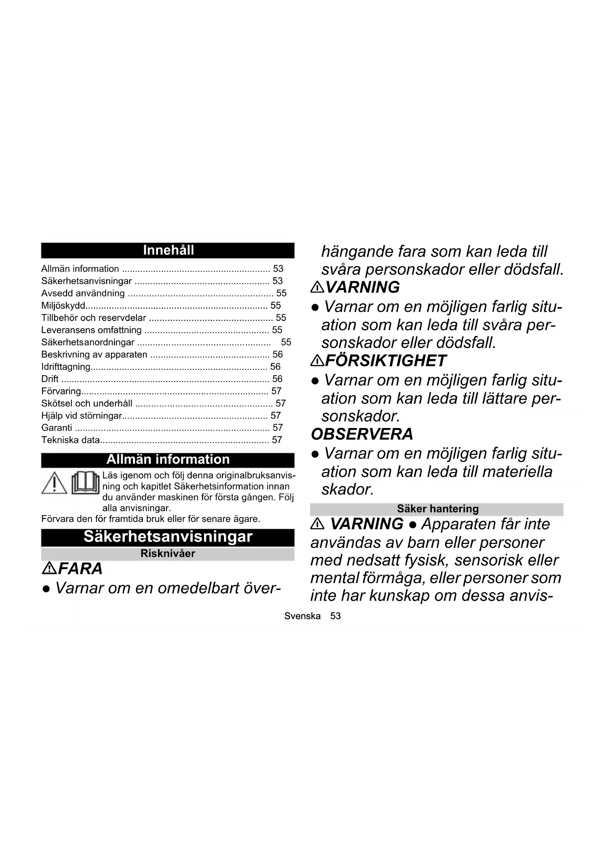 - dB(A) 68Svenska 53 Innehåll Allmän information Läs igenom och följ denna originalbruksanvis- ning och kapitlet Säkerhetsinformation innan du använder maskinen för första gången. Följ alla anvisningar. Förvara den för framtida bruk eller för senare ägare. Säkerhetsanvisningar Risknivåer FARA ● Varnar om en omedelbart över- hängande fara som kan leda till svåra personskador eller dödsfall. 몇 VARNING ● Varnar om en möjligen farlig situ- ation som kan leda till svåra per- sonskador eller dödsfall. 몇 FÖRSIKTIGHET ● Varnar om en möjligen farlig situ- ation som kan leda till lättare per- sonskador. OBSERVERA ● Varnar om en möjligen farlig situ- ation som kan leda till materiella skador. Säker hantering 몇 VARNING ● Apparaten får inte användas av barn eller personer med nedsatt fysisk, sensorisk eller mental förmåga, eller personer som inte har kunskap om dessa anvis- Allmän information p. 53