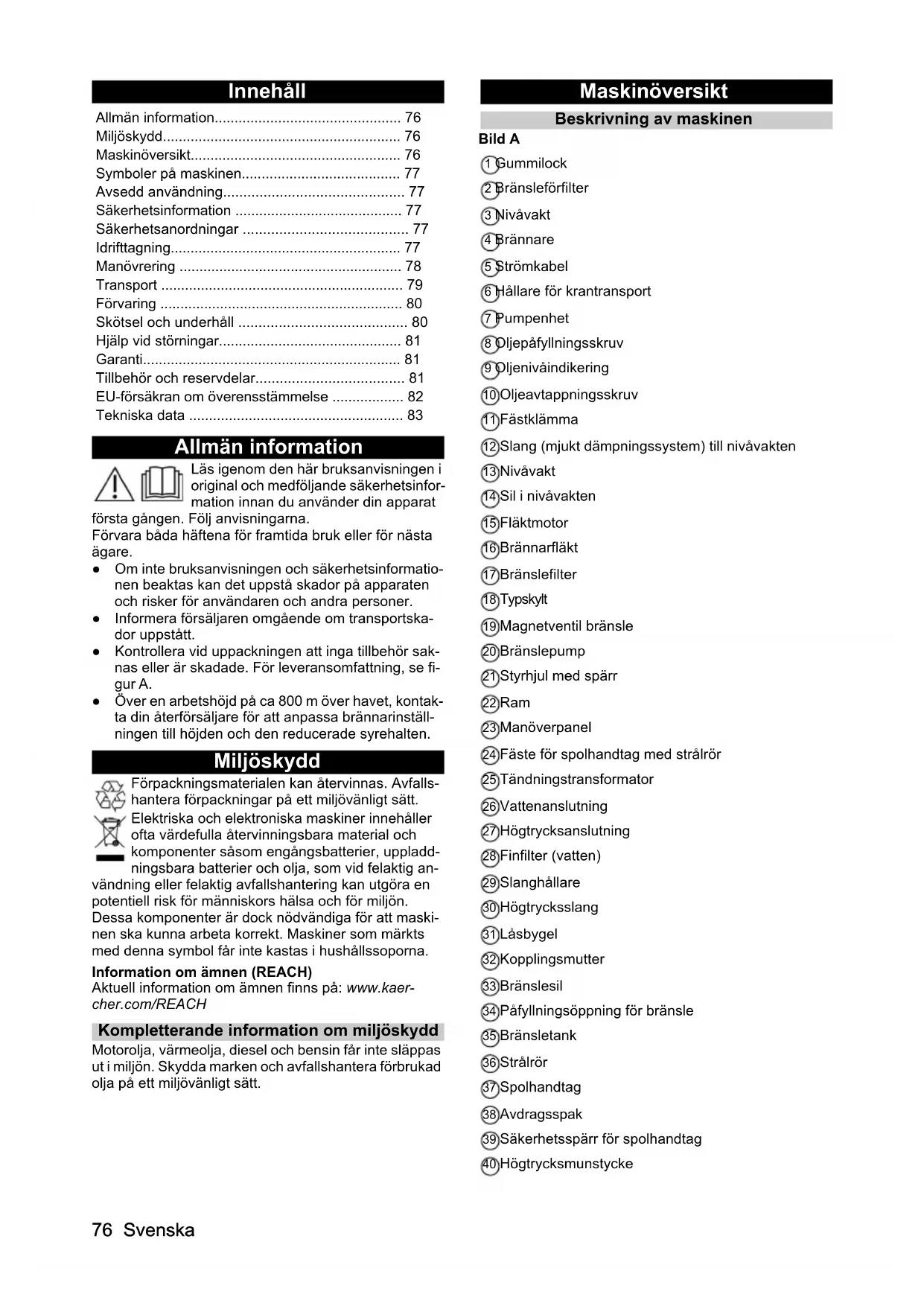- 1,576 Svenska Innehåll Allmän information Läs igenom den här bruksanvisningen i original och medföljande säkerhetsinfor- mation innan du använder din apparat första gången. Följ anvisningarna. Förvara båda häftena för framtida bruk eller för nästa ägare. ● Om inte bruksanvisningen och säkerhetsinformatio- nen beaktas kan det uppstå skador på apparaten och risker för användaren och andra personer. ● Informera försäljaren omgående om transportska- dor uppstått. ● Kontrollera vid uppackningen att inga tillbehör sak- nas eller är skadade. För leveransomfattning, se fi- gur A. ● Över en arbetshöjd på ca 800 m över havet, kontak- ta din återförsäljare för att anpassa brännarinställ- ningen till höjden och den reducerade syrehalten. Miljöskydd Förpackningsmaterialen kan återvinnas. Avfalls- hantera förpackningar på ett miljövänligt sätt. Elektriska och elektroniska maskiner innehåller ofta värdefulla återvinningsbara material och komponenter såsom engångsbatterier, uppladd- ningsbara batterier och olja, som vid felaktig an- vändning eller felaktig avfallshantering kan utgöra en potentiell risk för människors hälsa och för miljön. Dessa komponenter är dock nödvändiga för att maski- nen ska kunna arbeta korrekt. Maskiner som märkts med denna symbol får inte kastas i hushållssoporna. Information om ämnen (REACH) Aktuell information om ämnen finns på: www.kaer- cher.com/REACH Kompletterande information om miljöskydd Motorolja, värmeolja, diesel och bensin får inte släppas ut i miljön. Skydda marken och avfallshantera förbrukad olja på ett miljövänligt sätt. Maskinöversikt Beskrivning av maskinen Bild A 1 Gummilock 2 Bränsleförfilter 3 Nivåvakt 4 Brännare 5 Strömkabel 6 Hållare för krantransport 7 Pumpenhet 8 Oljepåfyllningsskruv 9 Oljenivåindikering 10 Oljeavtappningsskruv 11 Fästklämma 12 Slang (mjukt dämpningssystem) till nivåvakten 13 Nivåvakt 14 Sil i nivåvakten 15 Fläktmotor 16 Brännarfläkt 17 Bränslefilter 18 Typskylt 19 Magnetventil bränsle 20 Bränslepump 21 Styrhjul med spärr 22 Ram 23 Manöverpanel 24 Fäste för spolhandtag med strålrör 25 Tändningstransformator 26 Vattenanslutning 27 Högtrycksanslutning 28 Finfilter (vatten) 29 Slanghållare 30 Högtrycksslang 31 Låsbygel 32 Kopplingsmutter 33 Bränslesil 34 Påfyllningsöppning för bränsle 35 Bränsletank 36 Strålrör 37 Spolhandtag 38 Avdragsspak 39 Säkerhetsspärr för spolhandtag 40 Högtrycksmunstycke Allmän information p. 76