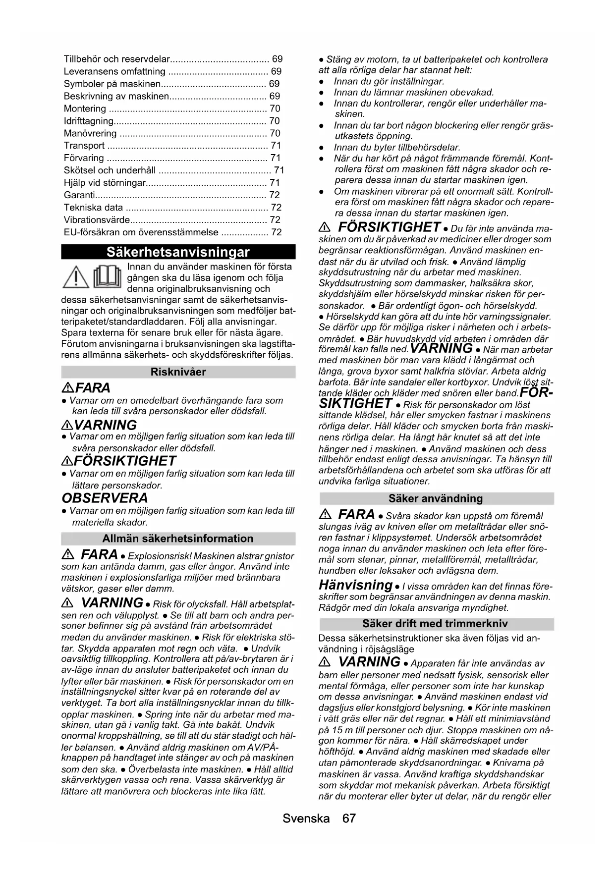 - Chairman of the Board of ManagementDirector Regulatory Affairs & Certification H. Jenner S. ReiserSvenska 67 Säkerhetsanvisningar Innan du använder maskinen för första gången ska du läsa igenom och följa denna originalbruksanvisning och dessa säkerhetsanvisningar samt de säkerhetsanvis- ningar och originalbruksanvisningen som medföljer bat- teripaketet/standardladdaren. Följ alla anvisningar. Spara texterna för senare bruk eller för nästa ägare. Förutom anvisningarna i bruksanvisningen ska lagstifta- rens allmänna säkerhets- och skyddsföreskrifter följas. Risknivåer FARA ● Varnar om en omedelbart överhängande fara som kan leda till svåra personskador eller dödsfall. 몇 VARNING ● Varnar om en möjligen farlig situation som kan leda till svåra personskador eller dödsfall. 몇 FÖRSIKTIGHET ● Varnar om en möjligen farlig situation som kan leda till lättare personskador. OBSERVERA ● Varnar om en möjligen farlig situation som kan leda till materiella skador. Allmän säkerhetsinformation FARA ● Explosionsrisk! Maskinen alstrar gnistor som kan antända damm, gas eller ångor. Använd inte maskinen i explosionsfarliga miljöer med brännbara vätskor, gaser eller damm. 몇 VARNING ● Risk för olycksfall. Håll arbetsplat- sen ren och välupplyst. ● Se till att barn och andra per- soner befinner sig på avstånd från arbetsområdet medan du använder maskinen. ● Risk för elektriska stö- tar. Skydda apparaten mot regn och väta. ● Undvik oavsiktlig tillkoppling. Kontrollera att på/av-brytaren är i av-läge innan du ansluter batteripaketet och innan du lyfter eller bär maskinen. ● Risk för personskador om en inställningsnyckel sitter kvar på en roterande del av verktyget. Ta bort alla inställningsnycklar innan du tillk- opplar maskinen. ● Spring inte när du arbetar med ma- skinen, utan gå i vanlig takt. Gå inte bakåt. Undvik onormal kroppshållning, se till att du står stadigt och hål- ler balansen. ● Använd aldrig maskinen om AV/PÅ- knappen på handtaget inte stänger av och på maskinen som den ska. ● Överbelasta inte maskinen. ● Håll alltid skärverktygen vassa och rena. Vassa skärverktyg är lättare att manövrera och blockeras inte lika lätt. ● Stäng av motorn, ta ut batteripaketet och kontrollera att alla rörliga delar har stannat helt: ● Innan du gör inställningar. ● Innan du lämnar maskinen obevakad. ● Innan du kontrollerar, rengör eller underhåller ma- skinen. ● Innan du tar bort någon blockering eller rengör gräs- utkastets öppning. ● Innan du byter tillbehörsdelar. ● När du har kört på något främmande föremål. Kont- rollera först om maskinen fått några skador och re- parera dessa innan du startar maskinen igen. ● Om maskinen vibrerar på ett onormalt sätt. Kontroll- era först om maskinen fått några skador och repare- ra dessa innan du startar maskinen igen. 몇 FÖRSIKTIGHET ● Du får inte använda ma- skinen om du är påverkad av mediciner eller droger som begränsar reaktionsförmågan. Använd maskinen en- dast när du är utvilad och frisk. ● Använd lämplig skyddsutrustning när du arbetar med maskinen. Skyddsutrustning som dammasker, halksäkra skor, skyddshjälm eller hörselskydd minskar risken för per- sonskador. ● Bär ordentligt ögon- och hörselskydd. ● Hörselskydd kan göra att du inte hör varningssignaler. Se därför upp för möjliga risker i närheten och i arbets- området. ● Bär huvudskydd vid arbeten i områden där föremål kan falla ned. VARNING ● När man arbetar med maskinen bör man vara klädd i långärmat och långa, grova byxor samt halkfria stövlar. Arbeta aldrig barfota. Bär inte sandaler eller kortbyxor. Undvik löst sit- tande kläder och kläder med snören eller band. FÖR- SIKTIGHET ● Risk för personskador om löst sittande klädsel, hår eller smycken fastnar i maskinens rörliga delar. Håll kläder och smycken borta från maski- nens rörliga delar. Ha långt hår knutet så att det inte hänger ned i maskinen. ● Använd maskinen och dess tillbehör endast enligt dessa anvisningar. Ta hänsyn till arbetsförhållandena och arbetet som ska utföras för att undvika farliga situationer. Säker användning FARA ● Svåra skador kan uppstå om föremål slungas iväg av kniven eller om metalltrådar eller snö- ren fastnar i klippsystemet. Undersök arbetsområdet noga innan du använder maskinen och leta efter före- mål som stenar, pinnar, metallföremål, metalltrådar, hundben eller leksaker och avlägsna dem. Hänvisning ● I vissa områden kan det finnas före- skrifter som begränsar användningen av denna maskin. Rådgör med din lokala ansvariga myndighet. Säker drift med trimmerkniv Dessa säkerhetsinstruktioner ska även följas vid an- vändning i röjsågsläge 몇 VARNING ● Apparaten får inte användas av barn eller personer med nedsatt fysisk, sensorisk eller mental förmåga, eller personer som inte har kunskap om dessa anvisningar. ● Använd maskinen endast vid dagsljus eller konstgjord belysning. ● Kör inte maskinen i vått gräs eller när det regnar. ● Håll ett minimiavstånd på 15 m till personer och djur. Stoppa maskinen om nå- gon kommer för nära. ● Håll skärredskapet under höfthöjd. ● Använd aldrig maskinen med skadade eller utan påmonterade skyddsanordningar. ● Knivarna på maskinen är vassa. Använd kraftiga skyddshandskar som skyddar mot mekanisk påverkan. Arbeta försiktigt när du monterar eller byter ut delar, när du rengör eller Tillbehör och reservdelar p. 69