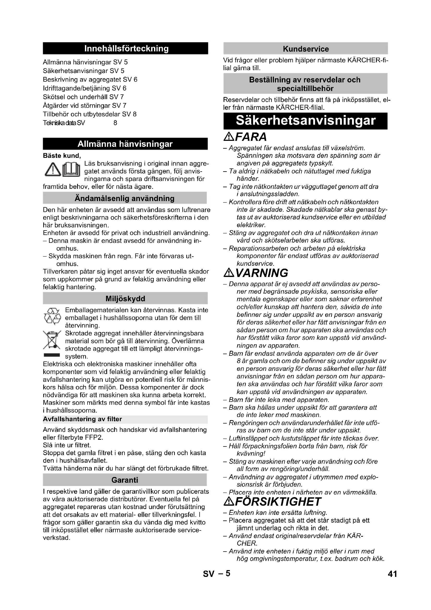 dB(A) dB(A) dB(A) 40 NO– 5 Bäste kund, Läs bruksanvisning i original innan aggre- gatet används första gången, följ anvis- ningarna och spara driftsanvisningen för framtida behov, eller för nästa ägare. Den här enheten är avsedd att användas som luftrenare enligt beskrivningarna och säkerhetsföreskrifterna i den här bruksanvisningen. Enheten är avsedd för privat och industriell användning. – Denna maskin är endast avsedd för användning in- omhus. – Skydda maskinen från regn. Får inte förvaras ut- omhus. Tillverkaren påtar sig inget ansvar för eventuella skador som uppkommer på grund av felaktig användning eller felaktig hantering. Emballagematerialen kan återvinnas. Kasta inte emballaget i hushållssoporna utan för dem till återvinning. Skrotade aggregat innehåller återvinningsbara material som bör gå till återvinning. Överlämna skrotade aggregat till ett lämpligt återvinnings- system. Elektriska och elektroniska maskiner innehåller ofta komponenter som vid felaktig användning eller felaktig avfallshantering kan utgöra en potentiell risk för männis- kors hälsa och för miljön. Dessa komponenter är dock nödvändiga för att maskinen ska kunna arbeta korrekt. Maskiner som märkts med denna symbol får inte kastas i hushållssoporna. Använd skyddsmask och handskar vid avfallshantering eller filterbyte FFP2. Slå inte ur filtret. Stoppa det gamla filtret i en påse, stäng den och kasta den i hushållsavfallet. Tvätta händerna när du har slängt det förbrukade filtret. I respektive land gäller de garantivillkor som publicerats av våra auktoriserade distributörer. Eventuella fel på aggregatet repareras utan kostnad under förutsättning att det orsakats av ett material- eller tillverkningsfel. I frågor som gäller garantin ska du vända dig med kvitto till inköpsstället eller närmaste auktoriserade service- verkstad. Vid frågor eller problem hjälper närmaste KÄRCHER-fi- lial gärna till. Reservdelar och tillbehör finns att få på inköpsstället, el- ler från närmaste KÄRCHER-filial. FARA – Aggregatet får endast anslutas till växelström. Spänningen ska motsvara den spänning som är angiven på aggregatets typskylt. – Ta aldrig i nätkabeln och nätuttaget med fuktiga händer. – Tag inte nätkontakten ur vägguttaget genom att dra i anslutningssladden. – Kontrollera före drift att nätkabeln och nätkontakten inte är skadade. Skadade nätkablar ska genast by- tas ut av auktoriserad kundservice eller en utbildad elektriker. – Stäng av aggregatet och dra ut nätkontaken innan vård och skötselarbeten ska utföras. – Reparationsarbeten och arbeten på elektriska komponenter får endast utföras av auktoriserad kundservice. VARNING – Denna apparat är ej avsedd att användas av perso- ner med begränsade psykiska, sensoriska eller mentala egenskaper eller som saknar erfarenhet och/eller kunskap att hantera den, såvida de inte befinner sig under uppsikt av en person ansvarig för deras säkerhet eller har fått anvisningar från en sådan person om hur apparaten ska användas och har förstått vilka faror som kan uppstå vid använd- ningen av apparaten. – Barn får endast använda apparaten om de är över 8 år gamla och om de befinner sig under uppsikt av en person ansvarig för deras säkerhet eller har fått anvisningar från en sådan person om hur appara- ten ska användas och har förstått vilka faror som kan uppstå vid användningen av apparaten. – Barn får inte leka med apparaten. – Barn ska hållas under uppsikt för att garantera att de inte leker med maskinen. – Rengöringen och användarunderhållet får inte utfö- ras av barn om de inte står under uppsikt. – Luftinsläppet och lustutsläppet får inte täckas över. – Håll förpackningsfolien borta från barn, risk för kvävning! – Stäng av maskinen efter varje användning och före all form av rengöring/underhåll. – Användning av aggregatet i utrymmen med explo- sionsrisk är förbjuden. – Placera inte enheten i närheten av en värmekälla. FÖRSIKTIGHET – Enheten kan inte ersätta luftning. – Placera aggregatet så att det står stadigt på ett jämnt underlag och rikta in det. – Använd endast originalreservdelar från KÄR- CHER. – Använd inte enheten i fuktig miljö eller i rum med hög omgivningstemperatur, t.ex. badrum och kök. Innehållsförteckning Allmänna hänvisningar SV 5 Säkerhetsanvisningar SV 5 Beskrivning av aggregatet SV 6 Idrifttagande/betjäning SV 6 Skötsel och underhåll SV 7 Åtgärder vid störningar SV 7 Tillbehör och utbytesdelar SV 8 Tekniska data SV 8 Allmänna hänvisningar Ändamålsenlig användning Miljöskydd Avfallshantering av filter Garanti Kundservice Beställning av reservdelar och specialtillbehör Säkerhetsanvisningar 41SV– 6 FARA Varnar om en omedelbart överhängande fara som kan leda till svåra personskador eller dödsfall. 몇 VARNING Varnar om en möjligen farlig situation som kan leda till svåra personskador eller döden. 몇 FÖRSIKTIGHET Varnar om en möjligen farlig situation som kan leda till lättare personskador. OBSERVERA Varnar om en möjligen farlig situation som kan leda till materiella skador. Kontrollera vid uppackningen att inga tillbehör saknas eller är skadade. Kontakta återförsäljaren om skador uppkommit vid transporten. Figurer och bilder finns på kartongens utfällbara sidor! 1 Filterlock fram 2 Förfilter 3 Huvudfilter 4 Filterlock bak 5 Luftutsläpp 6 Digitaldisplay 7 Användningsområde 8 Luftkvalitetsindikering 9 Filterlockens handtag 10 Luftkvalitetssensorns skydd 11 Nätförsörjning 12 Strömbrytare 13 Knapp för manuellt läge 14 Knapp för automatiskt läge 15 Knapp för nattläge 16 Indikering filterbyte OBSERVERA Använd alltid enheten med insatta för- och finfilter. Bild Före första användningen måste finfiltren, som re- dan är insatta i enheten, packas upp. Anslut strömkabeln till enheten Stick i
