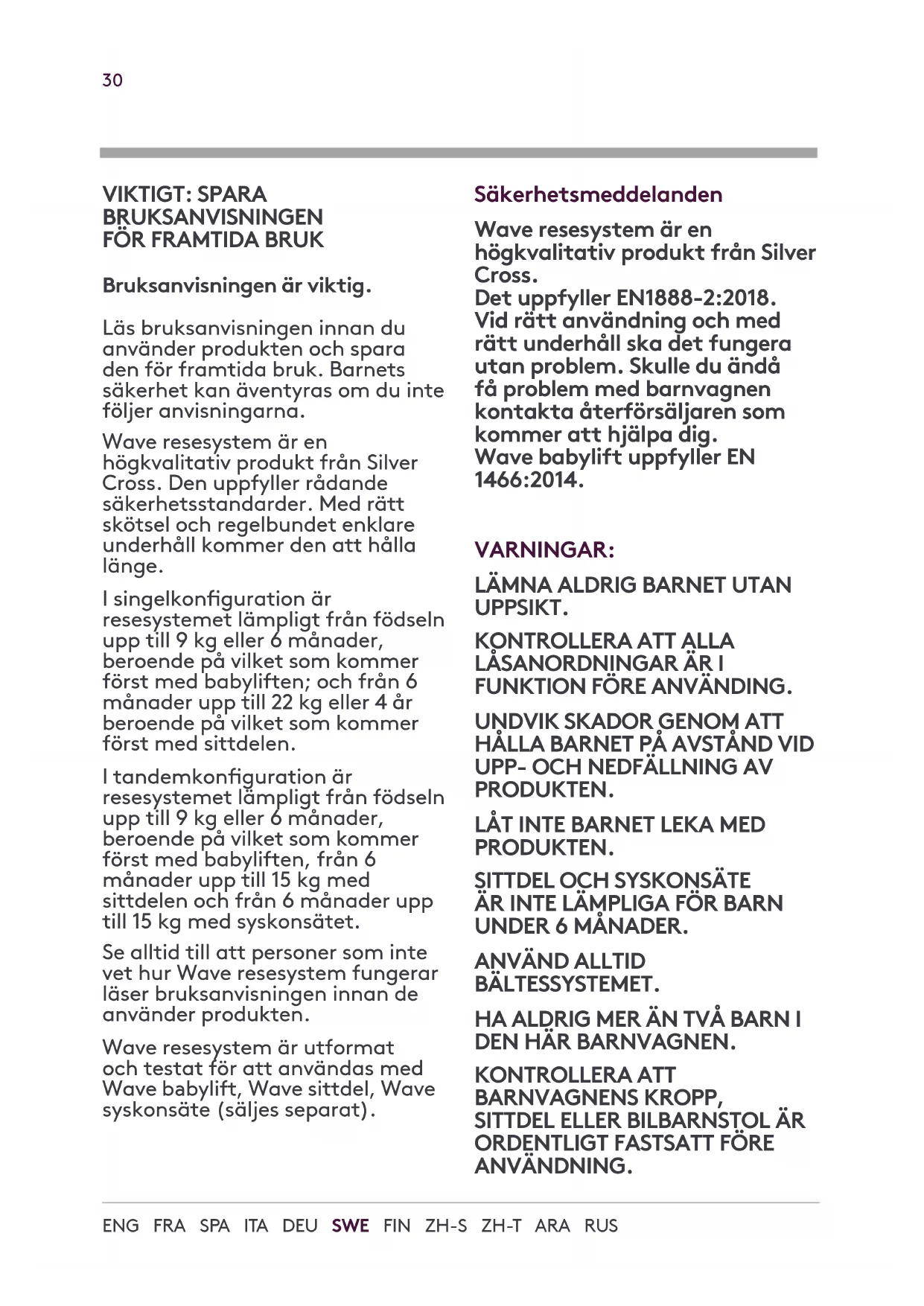 Bruksanvisningen är viktig. Läs bruksanvisningen innan du använder produkten och spara den för framtida bruk. Barnets säkerhet kan äventyras om du inte följer anvisningarna. Wave resesystem är en högkvalitativ produkt från Silver Cross. Den uppfyller rådande säkerhetsstandarder. Med rätt skötsel och regelbundet enklare underhåll kommer den att hålla länge. I singelkonguration är resesystemet lämpligt från födseln upp till 9 kg eller 6 månader, beroende på vilket som kommer först med babyliften; och från 6 månader upp till 22 kg eller 4 år beroende på vilket som kommer först med sittdelen. I tandemkonguration är resesystemet lämpligt från födseln upp till 9 kg eller 6 månader, beroende på vilket som kommer först med babyliften, från 6 månader upp till 15 kg med sittdelen och från 6 månader upp till 15 kg med syskonsätet. Se alltid till att personer som inte vet hur Wave resesystem fungerar läser bruksanvisningen innan de använder produkten. Wave resesystem är utformat och testat för att användas med Wave bbylift, Wave sittdel, Wave syskonsäte (säljes separat). Säkerhetsmeddelanden Wave resesystem är en högkvalitativ produkt från Silver Cross. Det uppfyller EN1888-2:2018. Vid rätt användning och med rätt underhåll ska det fungera utan problem. Skulle du ändå få problem med barnvagnen kontakta återförsäljaren som kommer att hjälpa dig. Wave babylift uppfyller EN 1466:2014. VARNINGAR: