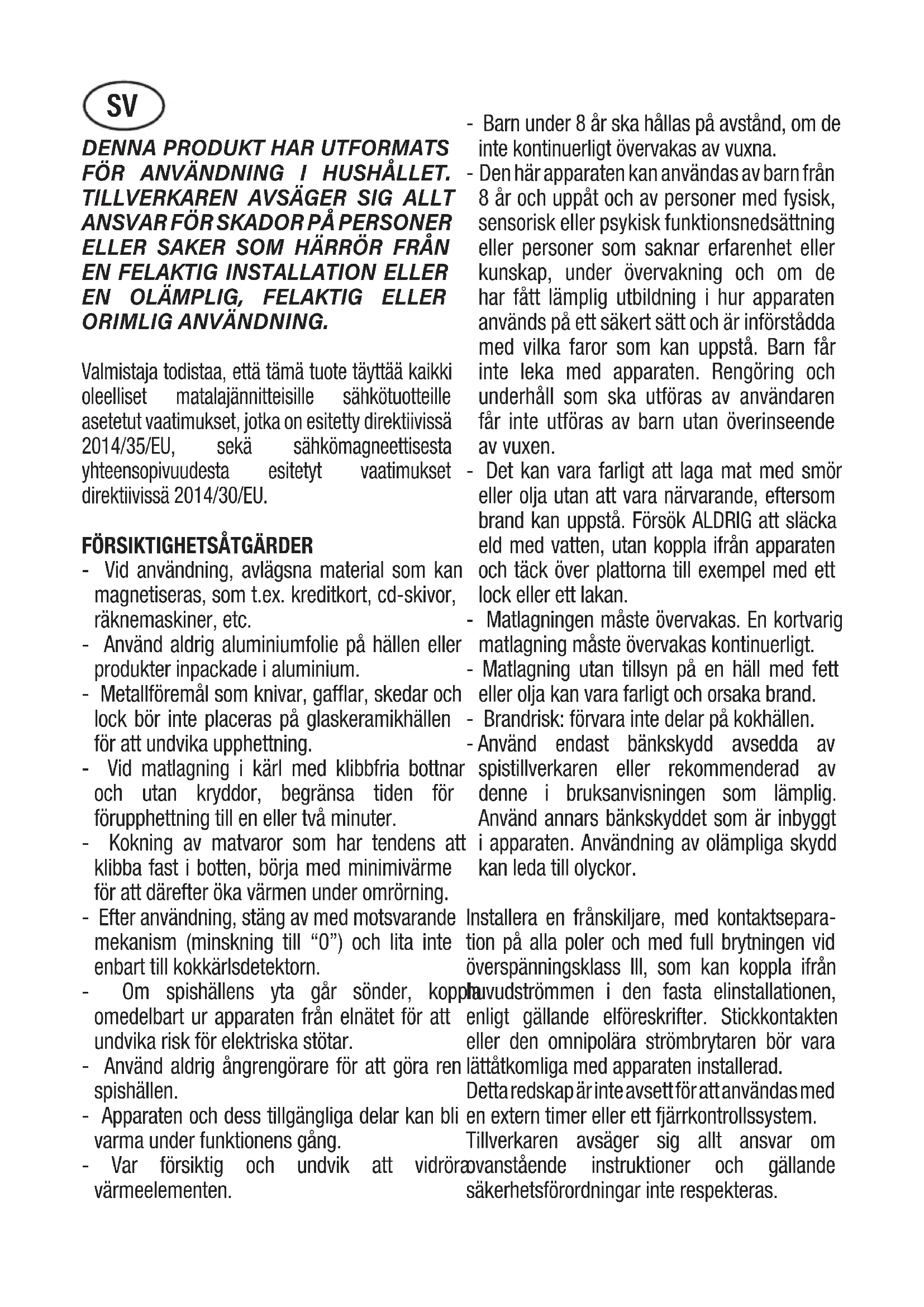 - Vid användning, avlägsna material som kan magnetiseras, som t.ex. kreditkort, cd-skivor, räknemaskiner, etc. - Använd aldrig aluminiumfolie på hällen eller produkter inpackade i aluminium. - Metallföremål som knivar, gafflar, skedar och lock bör inte placeras på glaskeramikhällen för att undvika upphettning. - Vid matlagning i kärl med klibbfria bottnar och utan kryddor, begränsa tiden för förupphettning till en eller två minuter. - Kokning av matvaror som har tendens att klibba fast i botten, börja med minimivärme för att därefter öka värmen under omrörning. - Efter användning, stäng av med motsvarande mekanism (minskning till “0”) och lita inte enbart till kokkärlsdetektorn. - Om spishällens yta går sönder, koppla omedelbart ur apparaten från elnätet för att undvika risk för elektriska stötar. - Använd aldrig ångrengörare för att göra ren spishällen. - Apparaten och dess tillgängliga delar kan bli varma under funktionens gång. - Var försiktig och undvik att vidröra värmeelementen. - Barn under 8 år ska hållas på avstånd, om de inte kontinuerligt övervakas av vuxna. - Den här apparaten kan användas av barn från 8 år och uppåt och av personer med fysisk, sensorisk eller psykisk funktionsnedsättning eller personer som saknar erfarenhet eller kunskap, under övervakning och om de har fått lämplig utbildning i hur apparaten används på ett säkert sätt och är införstådda med vilka faror som kan uppstå. Barn får inte leka med apparaten. Rengöring och underhåll som ska utföras av användaren får inte utföras av barn utan överinseende av vuxen. - Det kan vara farligt att laga mat med smör eller olja utan att vara närvarande, eftersom brand kan uppstå. Försök ALDRIG att släcka eld med vatten, utan koppla ifrån apparaten och täck över plattorna till exempel med ett lock eller ett lakan. - Matlagningen måste övervakas. En kortvarig matlagning måste övervakas kontinuerligt. - Matlagning utan tillsyn på en häll med fett eller olja kan vara farligt och orsaka brand. - Brandrisk: förvara inte delar på kokhällen. - Använd endast bänkskydd avsedda av spistillverkaren eller rekommenderad av denne i bruksanvisningen som lämplig. Använd annars bänkskyddet som är inbyggt i apparaten. Användning av olämpliga skydd kan leda till olyckor. Installera en frånskiljare, med kontaktsepara- tion på alla poler och med full brytningen vid överspänningsklass III, som kan koppla ifrån huvudströmmen i den fasta elinstallationen, enligt gällande elföreskrifter. Stickkontakten eller den omnipolära strömbrytaren bör vara lättåtkomliga med apparaten installerad. Detta redskap är inte avsett för att användas med en extern timer eller ett fjärrkontrollssystem. Tillverkaren avsäger sig allt ansvar om ovanstående instruktioner och gällande säkerhetsförordningar inte respekteras. SVOm strömkabeln skadas, be att få den utbytt av tillverkaren, av en auktoriserad teknisk service eller en tekniker av liknande kompetens, i syfte att undvika alla slags risker. FUNKTIONSPRINCIPER (Fig. 1) Dessa grundar sig på de elektromagnetiska egenskaperna som huvuddelen av våra kokkärl innesitter. Den elektroniska kretsen styr funktionen av spolen (induktoren), vilken skapar ett magnetfält. Värmen överförs från själva kokärlet till livsmedlet. Kokningen sker som beskrivs nedan: - minimal spridning (hög prestation) - avlägsnandet av kokkärlet (eller enbart dess upplyftande) framkallar automatiskt blockeringen av systemet - det elektroniska systemet möjliggör en maximal flexibilitet och en höggradig fininställning. (Fig. 1) 1 Kokkärl 2 Induktionsström 3 Magnetfält 4 Induktor 5 Elektronisk krets 6 Eltillförsel Bruksanvisningar (Fig. 2) 1 PÅ/AV 2 Minus – 3 Plus + 4 Kokzon 5 Nivåinställningsskärm 6 Zonvalsljus Installation Alla operationer i samband med installationen (elektrisk anslutning) bör utföras av kvalificerad personal i enlighet med gällande förordningar. Beträffande specifika instruktioner hänvisas till anvisningarna för installatören. ON/OFF av Touch Control-systemet Efter anslutningen till det elektriska nätet, tar det ungefär en sekund innan Touchkontrollsystemet fungerar. Efter anslutningen av systemet, blinkar alla displayer och kontrolljus under ungefär en sekund. Därefter slocknar alla displayer och kontrolljus, och Touchkontrollen kvarstår i Standby (väntläge). Tryck på PÅ/AV (1)-knappen för att slå på touch-kontrollen. Displayerna till kokzonerna visar på “0“. I händelse att en kokzon bränns (hög temperatur), visar displayen “H“ istället för “0“. Ljuspunkten som befinner sig nedanför till höger om samtliga displayer till kokzonerna, blinkar under en sekund för att ange att ditintills har ingen kokzon valts. Efter påsättningen kvarstår Touch Control aktiverat under 20 sekunder. Om ingen kokzon eller Timer väljs under den tiden, återvänder Touchkontrollsystemet till Standby (väntläge). Touch Control sätts på endast genom att trycka på ON/OFF-kontrollen. I händelse man trycker på ON/OFF samtidigt som på andra kontroller, erhålls ingen effekt och Touch Control kvarstår i Standby. Om säkerhetsmekanismen för barn är aktiverad uner påsättningen, visar displayen till alla kokzonerna “L“ (Låst). Om kokzonerna är mycket heta, kommer displayen att visa växelvis “L“ och “H“ (Het). Touch Control kan stängas av när som helst med ON/OFF-kontrollen. Detta gäller även när kontrollknappen har blockerats med hjälp av säkerhetsmekanismen för barn. ON/OFF-kontrollen har alltid prioritet vid avstängningsfunktionen. Automatisk avstängning När Touch Control-systemet är aktiverat, stängs det av automatiskt efter 20 sekunder om ingen funktion väljs. Efter att ha valt en kokzon, delas tiden för automatisk avstängning upp i 10 sekunder, efter vilka kokzonen avaktiveras, och ytterligare 10 sekunder, efter vilka Touch Co