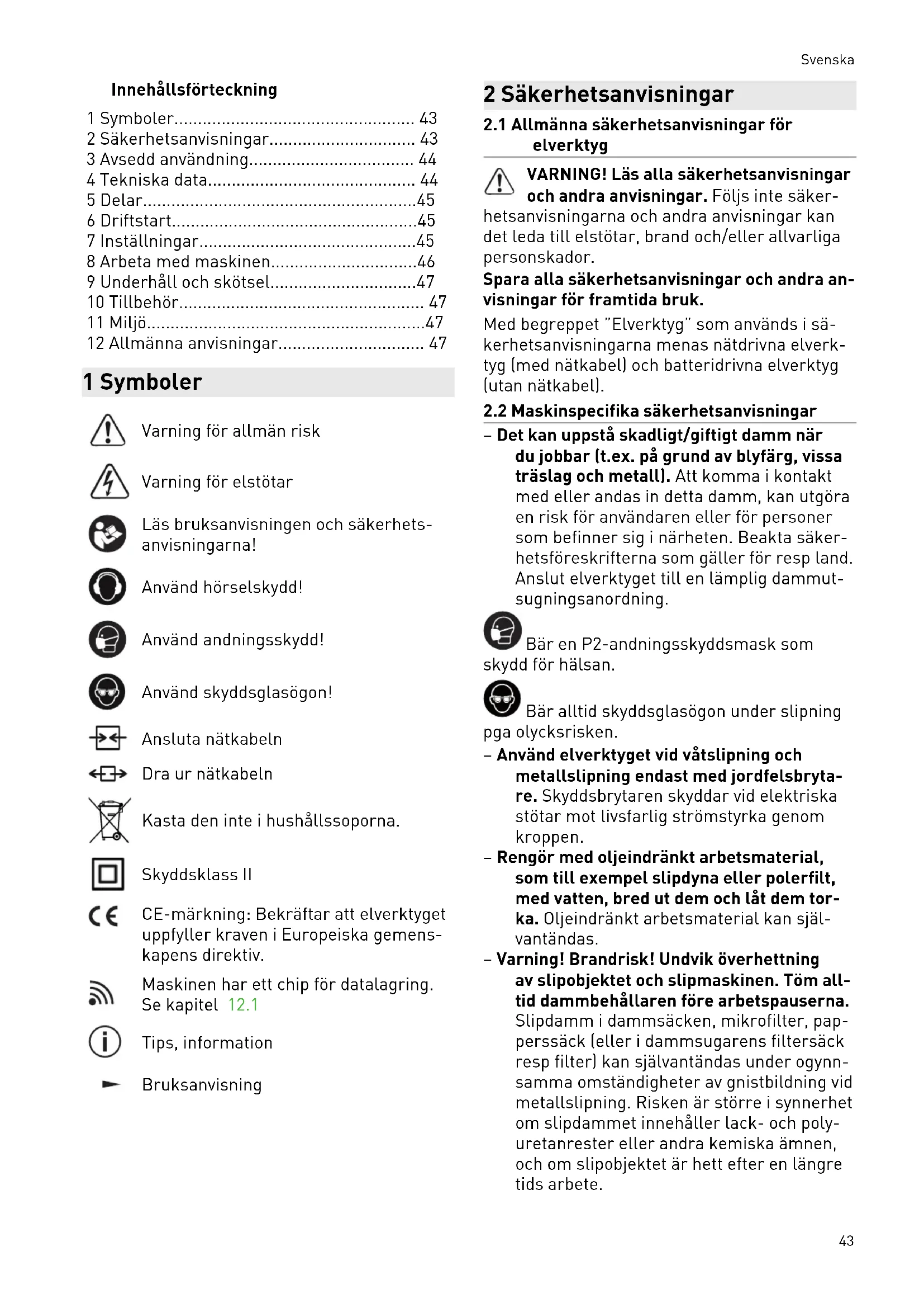 – Det kan uppstå skadligt/giftigt damm när du jobbar (t.ex. på grund av blyfärg, vissa träslag och metall). Att komma i kontakt med eller andas in detta damm, kan utgöra en risk för användaren eller för personer som befinner sig i närheten. Beakta säker hetsföreskrifterna som gäller för resp land. Anslut elverktyget till en lämplig dammut sugningsanordning. Bär en P2-andningsskyddsmask som skydd för hälsan. Bär alltid skyddsglasögon under slipning pga olycksrisken. – Använd elverktyget vid våtslipning och metallslipning endast med jordfelsbryta re. Skyddsbrytaren skyddar vid elektriska stötar mot livsfarlig strömstyrka genom kroppen. – Rengör med oljeindränkt arbetsmaterial, som till exempel slipdyna eller polerfilt, med vatten, bred ut dem och låt dem tor ka. Oljeindränkt arbetsmaterial kan själ vantändas. – Varning! Brandrisk! Undvik överhettning av slipobjektet och slipmaskinen. Töm all tid dammbehållaren före arbetspauserna. Slipdamm i dammsäcken, mikrofilter, pap perssäck (eller i dammsugarens filtersäck resp filter) kan självantändas under ogynn samma omständigheter av gnistbildning vid metallslipning. Risken är större i synnerhet om slipdammet innehåller lack- och poly uretanrester eller andra kemiska ämnen, och om slipobjektet är hett efter en längre tids arbete. Svenska 43– Använd endast Festool original-slipplat tor. Slipplattor från andra tillverkare är inte avstämda efter slipmaskinens varvtal och kan gå sönder. – Om elverktyget faller ner på golvet, kon trollera att verktyget och slipplattan inte har skadats. Demontera slipplattan och kontrollera noga. Skadade delar måste repareras före användning. Defekta slipp lattor och skadade verktyg kan leda till skador och göra att verktyget inte är säkert att använda.
