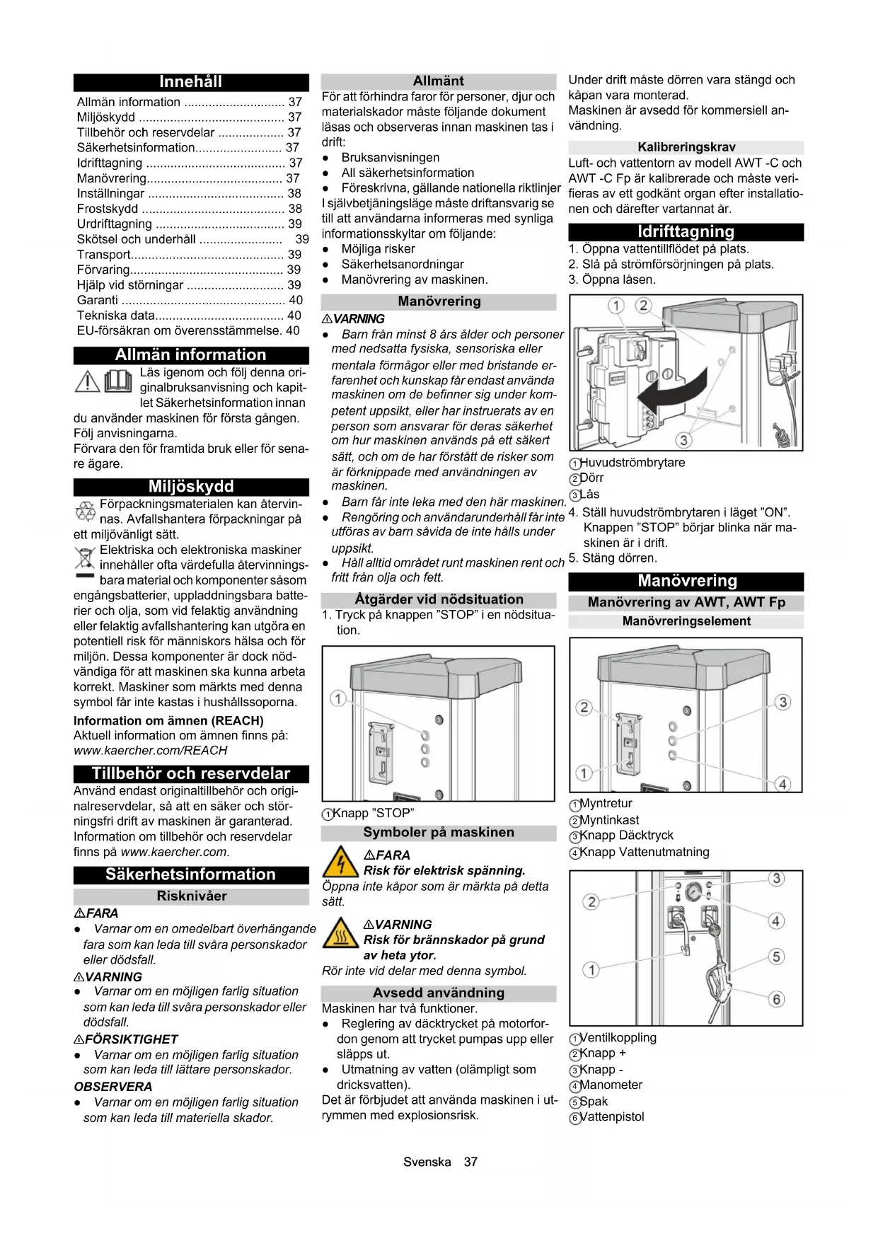 tion. 1 Knapp ”STOP” Symboler på maskinen FARA Risk för elektrisk spänning. Öppna inte kåpor som är märkta på detta sätt. 몇VARNING Risk för brännskador på grund av heta ytor. Rör inte vid delar med denna symbol. Avsedd användning Maskinen har två funktioner. ● Reglering av däcktrycket på motorfor- don genom att trycket pumpas upp eller släpps ut. ● Utmatning av vatten (olämpligt som dricksvatten). Det är förbjudet att använda maskinen i ut- rymmen med explosionsrisk. Under drift måste dörren vara stängd och kåpan vara monterad. Maskinen är avsedd för kommersiell an- vändning. Kalibreringskrav Luft- och vattentorn av modell AWT -C och AWT -C Fp är kalibrerade och måste veri- fieras av ett godkänt organ efter installatio- nen och därefter vartannat år. Idrifttagning