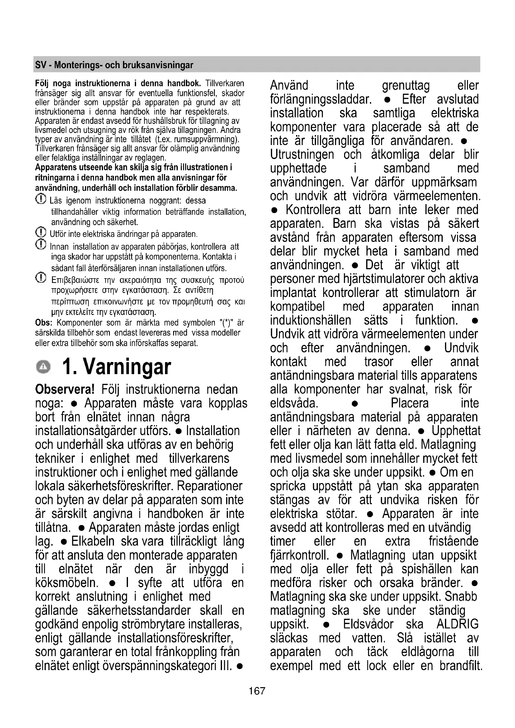 Στην περίπτωση που η βλάβη παραμένει -μετά τη διενέργεια των παραπάνω ελέγχων- επικοινωνήστε με το πλησιέστερο Τμήμα Τεχνικής Υποστήριξης.167 SV - Monterings- och bruksanvisningar Följ noga instruktionerna i denna handbok. Tillverkaren frånsäger sig allt ansvar för eventuella funktionsfel, skador eller bränder som uppstår på apparaten på grund av att instruktionerna i denna handbok inte har respekterats. Apparaten är endast avsedd för hushållsbruk för tillagning av livsmedel och utsugning av rök från själva tillagningen. Andra typer av användning är inte tillåtet (t.ex. rumsuppvärmning). Tillverkaren frånsäger sig allt ansvar för olämplig användning eller felaktiga inställningar av reglagen. Apparatens utseende kan skilja sig från illustrationen i ritningarna i denna handbok men alla anvisningar för användning, underhåll och installation förblir desamma. Läs igenom instruktionerna noggrant: dessa tillhandahåller viktig information beträffande installation, användning och säkerhet. Utför inte elektriska ändringar på apparaten. Innan installation av apparaten påbörjas, kontrollera att inga skador har uppstått på komponenterna. Kontakta i sådant fall återförsäljaren innan installationen utförs. Επιβεβαιώστε την ακεραιότητα της συσκευής προτού προχωρήσετε στην εγκατάσταση. Σε αντίθετη περίπτωση επικοινωνήστε με τον προμηθευτή σας και μην εκτελείτε την εγκατάσταση. Obs: Komponenter som är märkta med symbolen "(*)" är särskilda tillbehör som endast levereras med vissa modeller eller extra tillbehör som ska införskaffas separat.