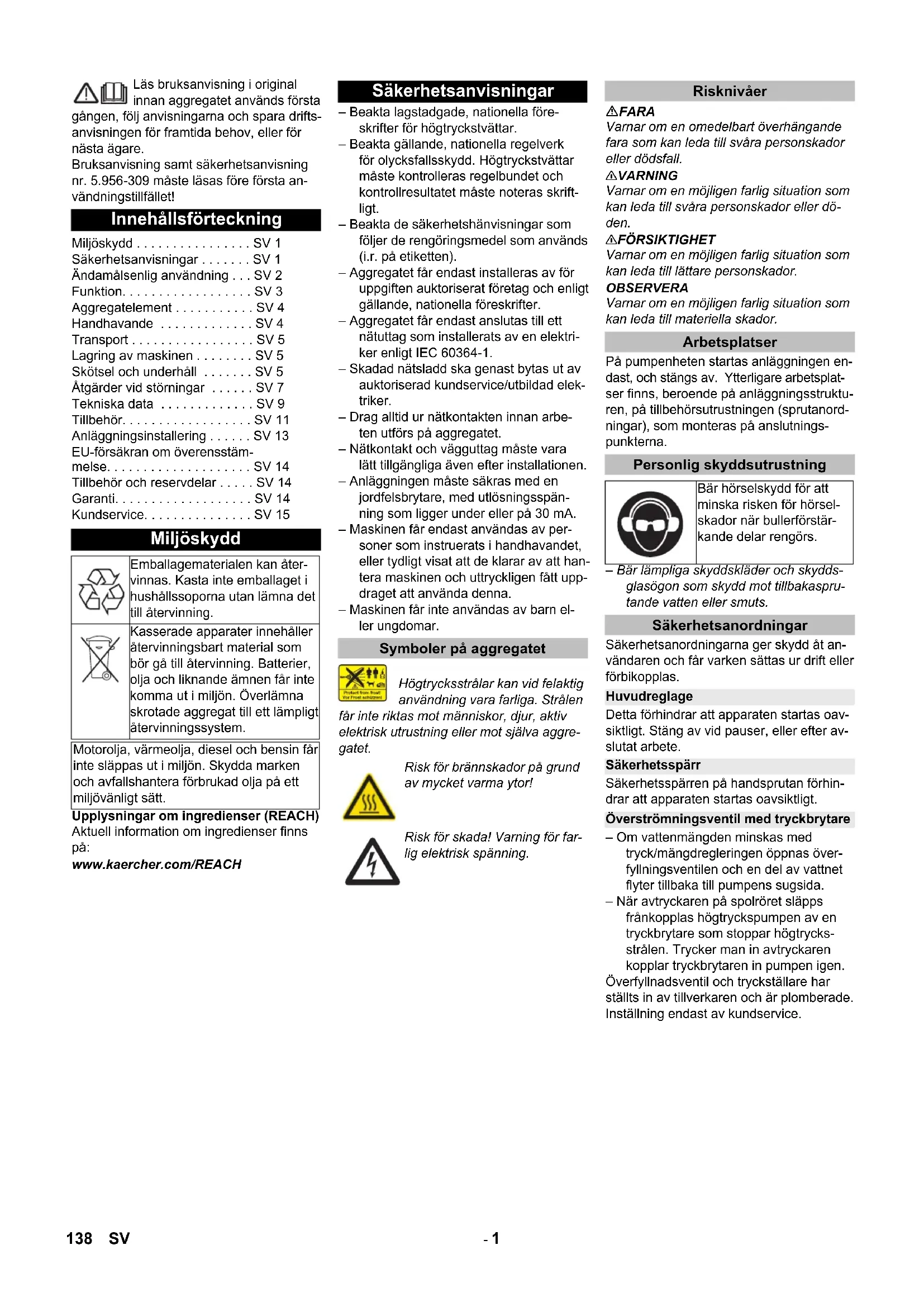 135NO- 14 Still beredskapstiden inn med spen- ningsmåleren på styringselektronikken. Fabrikkinnstilling: 10 Minuten Tiden kan stilles inn mellom 5 og 120 mi- nutter. Det er trykket en enkel skala mer retningsgivende verdier på kretskortet. Som forkalkningsvern ved varmtvannsdrift med hardt vann. Doserer avherdingsmiddel til vannet. Doseringsmengden kan tilpas- ses vannets hardhetsgrad. Fyll beholderen med Kärcher-bløtemid- del RM 110 (best.nr. 2.780-001). Undersøk lokal vannhardhet: – Ifølge opplysninger fra det lokale vann- verket, – Ved hjelp av apparat for måling av hard- hetsgrad (best.nr. 6.768-004). FARE Farlig elektrisk spenning! Innstilling er kun tillatt utført av autorisert elektriker. Innstill dreiepotensiometeret på kretskortet til vannavherderen, avhen- gig av vannets hardhetsgrad. Skalaen viser hardhetsområder 1 til 4. Skru av dyse. La maskinen gå til vannet kommer uten bobler. Eventuelt la maskinen gå i 10 sekunder – koble fra. Gjenta prosessen flere gan- ger. Slå av maskinen og skru på dysen igjen. Vi erklærer hermed at maskinen angitt ned- enfor oppfyller de grunnleggende sikker- hets- og helsekravene i de relevante EU-di- rektivene, med hensyn til både design, kon- struksjon og type markedsført av oss. Ved endringer på maskinen som er utført uten vårt samtykke, mister denne erklæringen sin gyldighet. De undertegnede handler på oppdrag fra, og med fullmakt fra selskapsledelsen. Dokumentasjonsansvarlig: S. Reiser Alfred Kärcher GmbH & Co. KG Alfred-Kärcher-Str. 28 - 40 71364 Winnenden (Germany) Tlf: +49 7195 14-0 Faks: +49 7195 14-2212 Winnenden, 2016/11/01 Bruk bare originalt tilbehør og originale re- servedeler; de garanterer for en sikker og problemfri drift av maskinen. Informasjon om tilbehør og reservedeler finner du på www.kaercher.com. Vår ansvarlige salgsorganisasjon for det enkelte land har utgitt garantibetingelsene som gjelder i det aktuelle landet. Eventuelle feil på apparatet repareres gratis innenfor garantitiden dersom årsaken er en materi- al- eller produksjonsfeil. Garantien trer kun i kraft dersom forhandle- ren sender inn vedlagte svarkort fullstendig utfylt, stemplet og underskrevet og sender til importøren i det enkelte land. Ved behov for garantireparasjoner, venn- ligst henvend deg med kjøps- og tilbe- hørskvitteringen til din forhandler eller den nærmeste autoriserte kundeservice. Beredskapstid påbyggingssett vannavherder (tilleggsutstyr) Luft maskinen EU-samsvarserklæring Produkt: Høytrykksvasker Type: 1.524-xxx Relevante EU-direktiver 2006/42/EF (+2009/127/EF) 2014/30/EU Anvendte overensstemmende normer EN 55014–1: 2006+A1: 2009+A2: 2011 EN 55014–2: 2015 EN 60335–1 EN 60335–2–79 EN 61000–3–2: 2006+A1: 2009+A2: 2009 EN 61000–3–3: 2013 EN 62233: 2008 CEO Head of Approbation Tilbehør og reservedeler Garanti 136 NO- 15 Kontroll gjennomført den: Funnet: Kontroll gjennomført den: Funnet: Kontroll gjennomført den: Funnet: Kontroll gjennomført den: Funnet: Kundetjeneste Anleggstype: Prodksjonsnr.: Tatt i bruk den: Underskrift Underskrift Underskrift Underskrift 137NO- 1 Läs bruksanvisning i original innan aggregatet används första gången, följ anvisningarna och spara drifts- anvisningen för framtida behov, eller för nästa ägare. Bruksanvisning samt säkerhetsanvisning nr. 5.956-309 måste läsas före första an- vändningstillfället! Upplysningar om ingredienser (REACH) Aktuell information om ingredienser finns på: www.kaercher.com/REACH – Beakta lagstadgade, nationella före- skrifter för högtryckstvättar. – Beakta gällande, nationella regelverk för olycksfallsskydd. Högtryckstvättar måste kontrolleras regelbundet och kontrollresultatet måste noteras skrift- ligt. – Beakta de säkerhetshänvisningar som följer de rengöringsmedel som används (i.r. på etiketten). – Aggregatet får endast installeras av för uppgiften auktoriserat företag och enligt gällande, nationella föreskrifter. – Aggregatet får endast anslutas till ett nätuttag som installerats av en elektri- ker enligt IEC 60364-1. – Skadad nätsladd ska genast bytas ut av auktoriserad kundservice/utbildad elek- triker. – Drag alltid ur nätkontakten innan arbe- ten utförs på aggregatet. – Nätkontakt och vägguttag måste vara lätt tillgängliga även efter installationen. – Anläggningen måste säkras med en jordfelsbrytare, med utlösningsspän- ning som ligger under eller på 30 mA. – Maskinen får endast användas av per- soner som instruerats i handhavandet, eller tydligt visat att de klarar av att han- tera maskinen och uttryckligen fått upp- draget att använda denna. – Maskinen får inte användas av barn el- ler ungdomar. Högtrycksstrålar kan vid felaktig användning vara farliga. Strålen får inte riktas mot människor, djur, aktiv elektrisk utrustning eller mot själva aggre- gatet. FARA Varnar om en omedelbart överhängande fara som kan leda till svåra personskador eller dödsfall. 몇 VARNING Varnar om en möjligen farlig situation som kan leda till svåra personskador eller dö- den. 몇 FÖRSIKTIGHET Varnar om en möjligen farlig situation som kan leda till lättare personskador. OBSERVERA Varnar om en möjligen farlig situation som kan leda till materiella skador. På pumpenheten startas anläggningen en- dast, och stängs av. Ytterligare arbetsplat- ser finns, beroende på anläggningsstruktu- ren, på tillbehörsutrustningen (sprutanord- ningar), som monteras på anslutnings- punkterna. – Bär lämpliga skyddskläder och skydds- glasögon som skydd mot tillbakaspru- tande vatten eller smuts. Säkerhetsanordningarna ger skydd åt an- vändaren och får varken sättas ur drift eller förbikopplas. Detta förhindrar att apparaten startas oav- siktligt. Stäng av vid pauser, eller efter av- slutat arbete. Säkerhetsspärren på handsprutan förhin- drar att apparaten startas oavsiktligt. – Om vattenmängden minskas med tryck/mängdregleringen öppnas ö