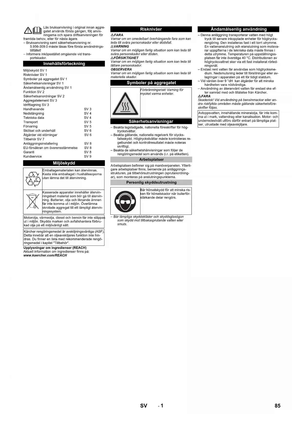 Kontrollampor Idrifttagning Handhavande Säkerhetsanvisningar 87SV- 4 FARALivsfara på grund av elektrisk stöt! Rikta inte vattenstrå-len mot följande anordningar:– elektriska apparater och anläggningar,– denna anläggning, – alla strömförande delar inom arbetsområdet.Vattenstrålen som kommer ur strålröret genererar en rekylkraft. Genom det vinklade strålröret skapas en uppåtverkande kraft. FARA– Risk för skada! Rekylkraften hos strålröret kan göra att man tappar balansen. Man kan ramla. Strålröret kan kastas omkring och skada personer. Leta upp stabilt underlag att stå på och håll fast handsprutan ordentligt. Kläm aldrig fast spaken på handsprutan.– Rikta inte strålen mot dig själv eller mot andra för att rengöra kläder eller skor.– Skaderisk genom ivägflygande delar! Ivägflygande brottstycken eller föremål kan skada personer eller djur. Rikta aldrig vattenstrålen mot föremål som lätt kan förstöras eller som är lösa.– Risk för olycksfall på grund av skador! Rengör däck och ventiler från ett minsta avstånd på 30 cm. FARAFara på grund av hälsovådliga substanser! Spola inte av följande material eftersom hälsovådliga substanser då kan virvla runt:– material som innehåller asbest,– material som kan innehålla hälsovådliga substanser. FARA– Risk för skador på grund av, eventuellt mycket varm, vattenstråle! Endast Kärcher högtrycks-slangar i originalutförande är exakt anpassade till anläggningen. Vid användning av andra slangar lämnas ingen garanti.– Hälsorisk på grund av rengöringsmedel! Det vatten som kommer ut ur aggregatet har inte dricksvatten-kvalitet eftersom rengöringsmedel kan ha blandats i.– Risk för hörselskador på grund av arbete på buller-förstärkande delar! Bär då hörselskydd.몇 VARNINGLängre användning av aggregatet kan leda till vibra-tionsbetingade cirkulationsstörningar i händerna.En allmängiltig tidslängd för användningen kan inte fast-läggas eftersom denna påverkas av många faktorer:– Personlig fallenhet för dålig cirkulation (ofta kalla fingrar, kliande fingrar).– Låg omgivande temperatur Bär varma handskar för att skydda händerna.– Ett fast grepp hindrar cirkulationen.– Drift utan pauser är sämre än drift med inlagda pauser.Vid regelbunden, långvarig användning av apparaten och återkommande symptom (t.ex. kliande fingrar, kalla fingrar), rekommenderar vi läkarbesök. FARARisk för skador på grund av, eventuellt mycket varm, vattenstråle! FARAKontrollera före drift att högtrycksslangen inte är ska-dad. Byt genast ut skadade högtrycksslangar. Kontrollera högtrycksslang, rörledningar, armatu-rer och sprutrör på skador före varje användning. Kontrollera att slangkopplingar sitter fast ordentligt och att de är täta. Vrid huvudströmbrytaren till position "0". Stäng vattentillförseln. Använd handsprutan tills apparaten är trycklös. Öppna vattenförsörjning. Vrid huvudströmbrytaren till position "1". Tryck på upplåsningsknappen.Kontrollampa för driftberedskap lyser. Genomför rengöringsarbetet.Observera:Vi en rengöringspaus som dröjer längre än 30 sekunder slår pumpen av. Samtidigt startar en sex timmar lång beredskapsperiod. Inom driftberedskapsti-den startar maskinen automatiskt genom att ett tryckfall uppstår när man öppnar en handsprutpistol. Tryck på upplåsningsknappen.Kontrollampa för driftberedskap lyser. Vrid huvudströmbrytaren till position "0". Stäng vattentillförseln. Använd handsprutan tills apparaten är trycklös. Säkra handsprutan med säkerhetsspärren mot oavsiktligt öppnande.Under längre driftsavbrott eller om en frostfri installation inte är möjlig ska följande åtgärder utföras ( se kapitel "Skötsel och underhåll", avsnitt "Frostskydd"): Töm ut vatten Spola igenom aggregatet med frostskyddsmedel Stäng och säkra huvudströmbrytaren.