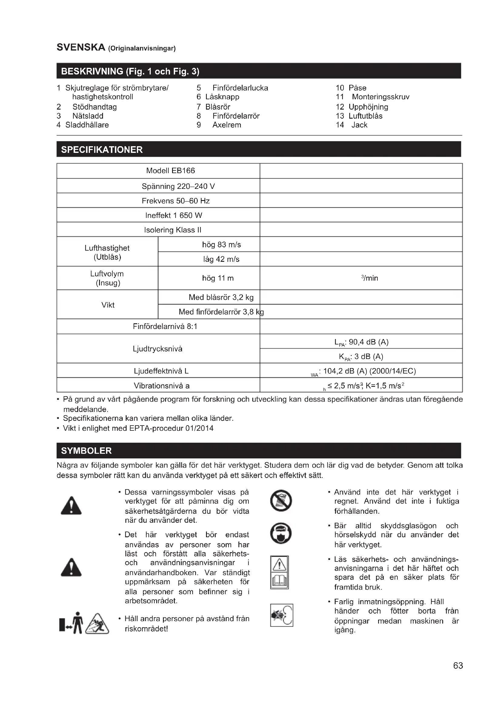 Om nätsladden måste ersättas ska uppgiften skötas av ett auktoriserat servicecenter för att undvika säkerhetsrisker. Om nätsladden är skadad måste den ersättas av ett Dolmar-servicecenter för att undvika säkerhetsrisker.68 NORSK (Originalanvisninger) BESKRIVELSE (Fig. 1 og g. 3) 1 Strøm/hastighets-glidebryter 2 Hjelpehåndtak 3 Strømledning 4 Ledningsholder 5 Støvsugerport 6 Låseknapp 7 Blåserrør 8 Støvsugerrør 9 Skulderstropp 10 Pose 11 Tommelskrue 12 Utsparingsområde 13 Luftutløp 14 Spor SPESIFIKASJON Modell EB166 Spenning 220–240 V Frekvens 50–60 Hz Inngangseffekt 1 650 W Isolasjon Klasse II Lufthastighet (Blåser) høy 83 m/s lav 42 m/s Luftmengde (Vakuum) høy 11 m