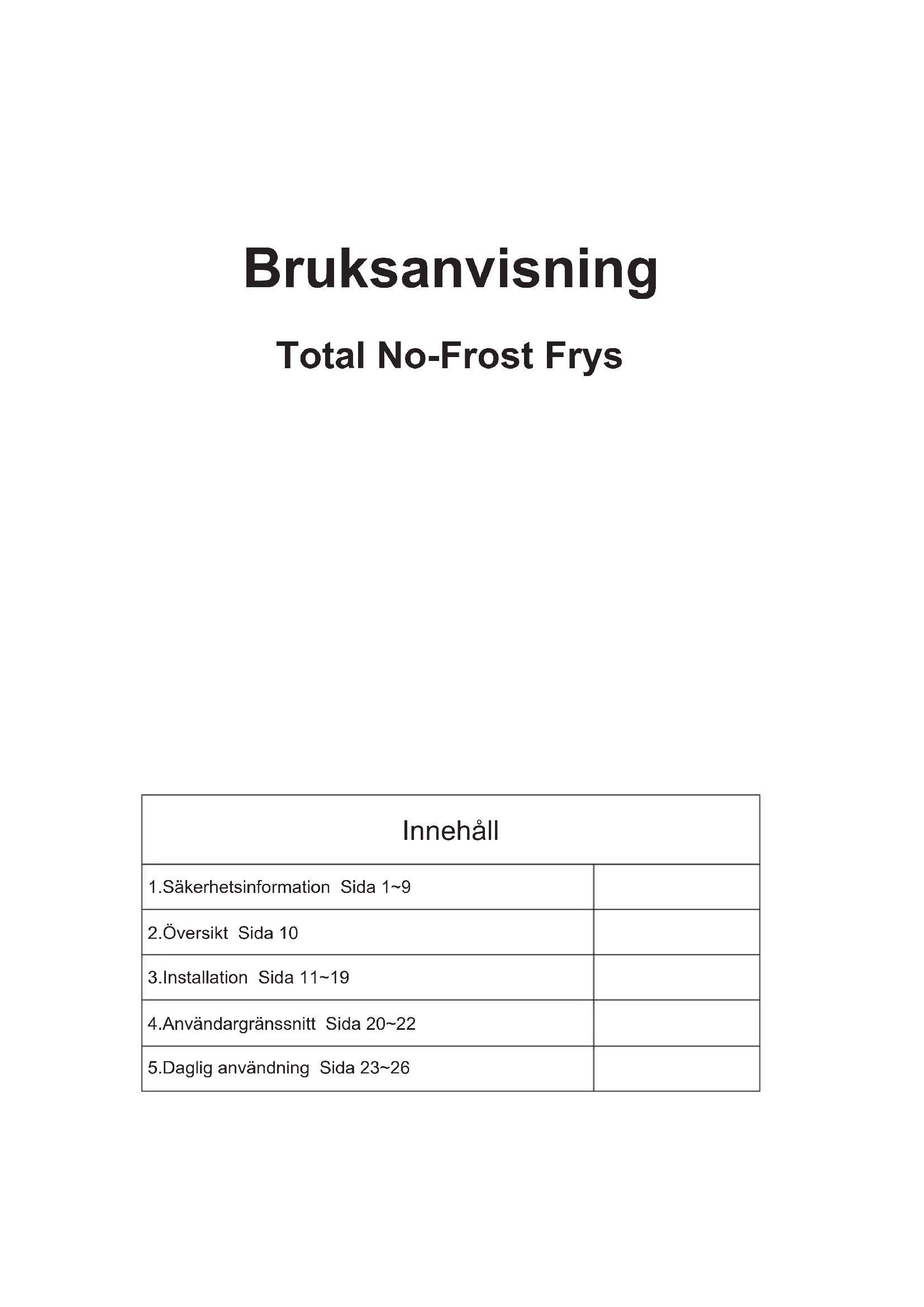 OHWSRWHPNRMHELODQDWUJGRVWDYOMHQD]DGQMDHQRWDPRGHOD ¾ .OMXþDYQLFHWHþDMLYUDWSODGQMLLQNRãDUe najmanj 7 let in tesnila vrat najmanj 10 let po WHPNRMHELODQDWUJGRVWDYOMHQD]DGQMDHQRWDPRGHOD ýHåHOLWHVWRSLWLYVWLNVWHKQLþQRSRPRþMRRELãþLWHQDãHVSOHWQRPHVWR KWWSVFRUSRUDWHKDLHU- HXURSHFRPHQ V razdelku »spletno mesto« izberite EODJRYQR]QDPNRL]GHONDLQGUåDYR3UHXVPHUMHQLERVWHQD GRORþHQRVSOHWQRPHVWRNMHUERVWHQDãOLWHOHIRQVNRãWHYLONRLQREUD]HF]DVWLNVWHKQLþQRSRPRþMR =DGRGDWQHLQIRUPDFLMHRL]GHONXRELãþLWHVSOHWQRPHVWRKWWSVHSUHOHFHXURSDHXDOLVNHQLUDMWH NRGR45QDHQHUJLMVNLQDOHSNLSULORåHQLDSDUDWX 26Bruksanvisning Total No-Frost Frys Innehåll 1.Säkerhetsinformation Sida 1~9 2.Översikt Sida 10 3.Installation Sida 11~19 4.Användargränssnitt Sida 20~22 5.Daglig användning Sida 23~26Tack för att du köpt den här produkten. Innan du använder kyl- och frysskåpet, läs noga igenom denna bruksanvisning för att få bästa möjliga funktion. Förvara all dokumentation för senare användning eller för andra ägare. Denna produkt är endast avsedd för hushållsbruk eller liknande tillämpningar såsom: - personalkök i butiker, kontor och andra arbetsmiljöer - på gårdar, hotellkundkretsar, motell och andra boendemiljöer - på bed and breakfast (B & B) - för cateringtjänster och liknande användning, inte för detaljhandel. Denna apparat får endast användas för förvaring av livsmedel. All annan användning anses vara farlig och tillverkaren ansvarar inte för eventuella förluster. Du rekommenderas också att ta del av garantivillkoren. SÄKERHETSINFORMATION Läs bruks- och installationsanvisningarna noggrant! De innehåller viktig information om hur du ska installera, använda och underhålla apparaten. Tillverkaren ansvarar inte för följder på grund av att instruktioner och varningar inte följs. Spara alla dokument för framtida behov, eller för nästa ägare. x Avlägsna förpackningen och alla transportskydd innan du ansluter apparaten till elförsörjningen. Håll allt förpackningsmaterial och dess delar utom räckhåll för barn. Material som vikbara kartonger och plastfilm utgör kvävningsrisk! x Låt stå i minst 4 timmar innan du slår på produkten, så att kompressoroljan kan sätta sig om den transporteras horisontellt. x Se till att det inte finns några transportskador. x Skada inte köldmediekretsen. 1x Täck inte över ventilationsöppningar i produktens hölje eller i den inbyggda strukturen. x Använd aldrig vatten för att tvätta kompressorns underlag, torka av det noggrant med en torr trasa efter rengöring för att förhindra rost. x Apparaten är tung och ska hanteras av minst två personer. x Installera och nivellera apparaten på en lämplig plats med hänsyn till användning och storlek. x Kontrollera att den elektriska informationen på typskylten överensstämmer med strömförsörjningen. Om den inte gör det, kontakta en elektriker. x Apparaten drivs av en strömförsörjning på
