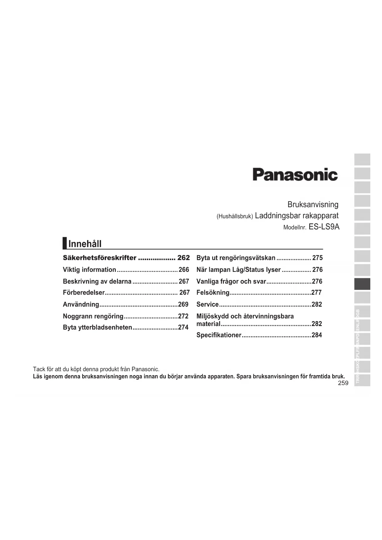 Spesikasjoner Strømkilde Se merkeplaten på vekselstrømsadapteren (automatisk spenningsomformer). Motorspenning 3,6 V Ladetid Omtrent 1 time Luftbåren akustisk støy Under barbering: 64 (dB (A) re 1 pW) Under trimming: 65 (dB (A) re 1 pW) Dette produktet er kun ment til husholdningsbruk. For mer informasjon om produktets energieffektivitet kan du gå inn på www.panasonic.com og skrive modellnummeret inn i søkefeltet.259 TR RO H SK CZ PL FIN S N P DK E NL I F D GB Tack för att du köpt denna produkt från Panasonic. Läs igenom denna bruksanvisningen noga innan du börjar använda apparaten Spara bruksanvisningen för framtida bruk Bruksanvisning (Hushållsbruk) Laddningsbar rakapparat Modellnr. ES‑LS9A Säkerhetsföreskrifter .................. 262 Viktig information 266 Beskrivning av delarna 267 Förberedelser 267 Användning 269 Noggrann rengöring 272 Byta ytterbladsenheten 274 Byta ut rengöringsvätskan 275 När lampan Låg/Status lyser 276 Vanliga frågor och svar 276 Felsökning 277 Service 282 Miljöskydd och återvinningsbara material 282 Specikationer 284 Innehåll260 VARNING