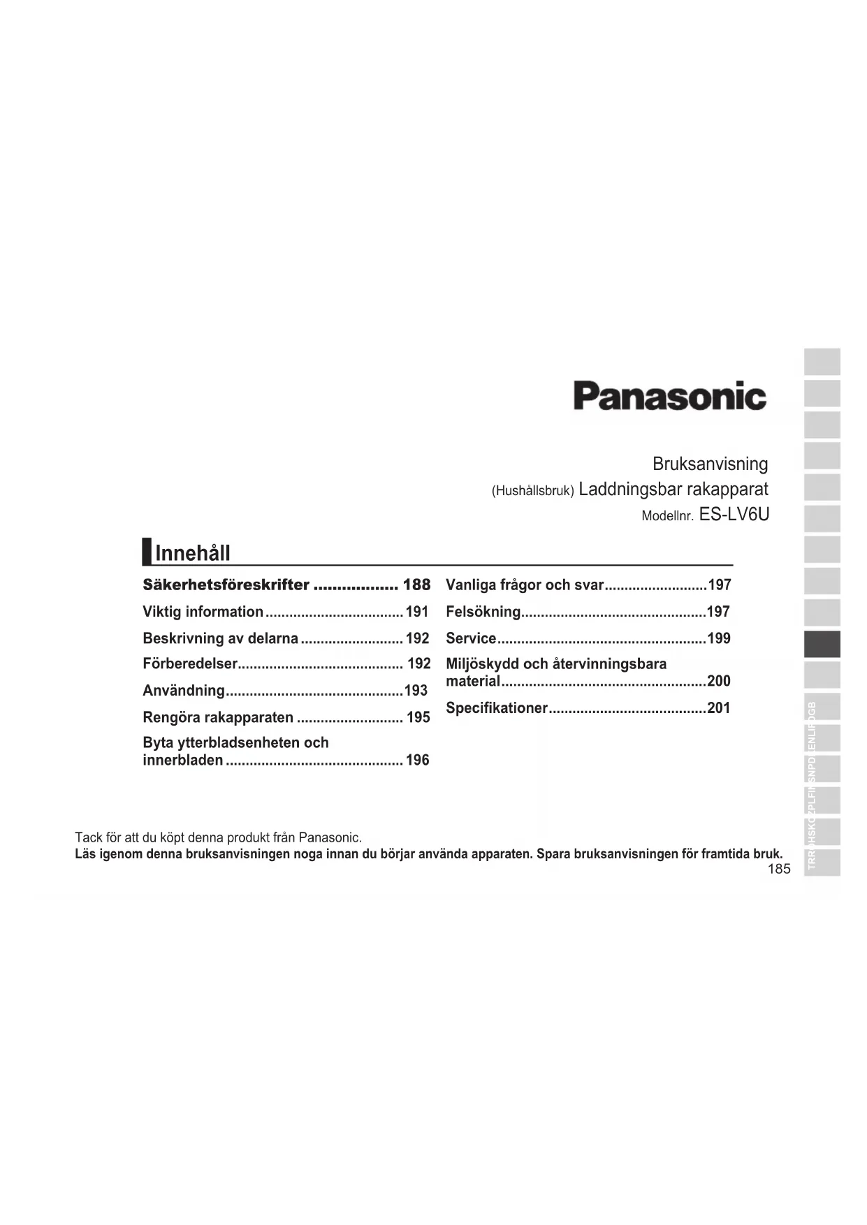 Spesikasjoner Strømkilde Se merkeplaten på vekselstrømsadapteren. (automatisk spenningsomformer) Motorspenning 3,6 V Ladetid Omtrent 1 time Luftbåren akustisk støy Under barbering: 63 (dB (A) re 1 pW) Under trimming: 64 (dB (A) re 1 pW) Dette produktet er kun ment til husholdningsbruk. For mer informasjon om produktets energieffektivitet kan du gå inn på www.panasonic.com og skrive modellnummeret inn i søkefeltet.185 TR RO H SK CZ PL FIN S N P DK E NL I F D GB Tack för att du köpt denna produkt från Panasonic. Läs igenom denna bruksanvisningen noga innan du börjar använda apparaten Spara bruksanvisningen för framtida bruk Bruksanvisning (Hushållsbruk) Laddningsbar rakapparat Modellnr. ES‑LV6U Säkerhetsföreskrifter .................. 188 Viktig information 191 Beskrivning av delarna 192 Förberedelser 192 Användning 193 Rengöra rakapparaten 195 Byta ytterbladsenheten och innerbladen 196 Vanliga frågor och svar 197 Felsökning 197 Service 199 Miljöskydd och återvinningsbara material 200 Specikationer 201 Innehåll186 VARNING