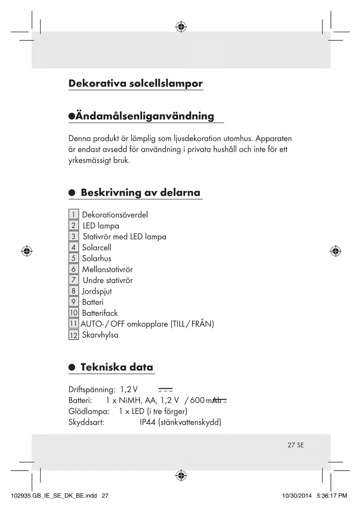 Leveransomfång Kontrollera att leveransomfånget är fullständigt omedelbart efter att du har packat upp produkten. Kontrollera även att produkten och alla dess delar är i felfritt skick. Montera aldrig produkten, om leveransomfånget inte är fullständigt komplett. 1 Dekorationsöverdel 1 Undre stativrör 1 Skarvhylsa 1 Mellanstativrör 1 Stativrör med LED lampa 1 Jordspjut 1 Batteri, NiMH, AA, 1,2 V / 600 mAh 1 Bruksanvisning Säkerhetsanvisningar Garanti gäller inte om skador uppstår, vilka kan härledas till att bruksanvisningen inte har beaktats! Vi ansvarar inte för följdskador! Vi ansvarar inte för person- och / eller materialskador som uppkom- mit genom felaktig hantering av utrustningen eller icke beaktande av säkerhetsanvisningarna! 102935 GB_IE_SE_DK_BE.indd 28 10/30/2014 5:36:18 PM29 SE