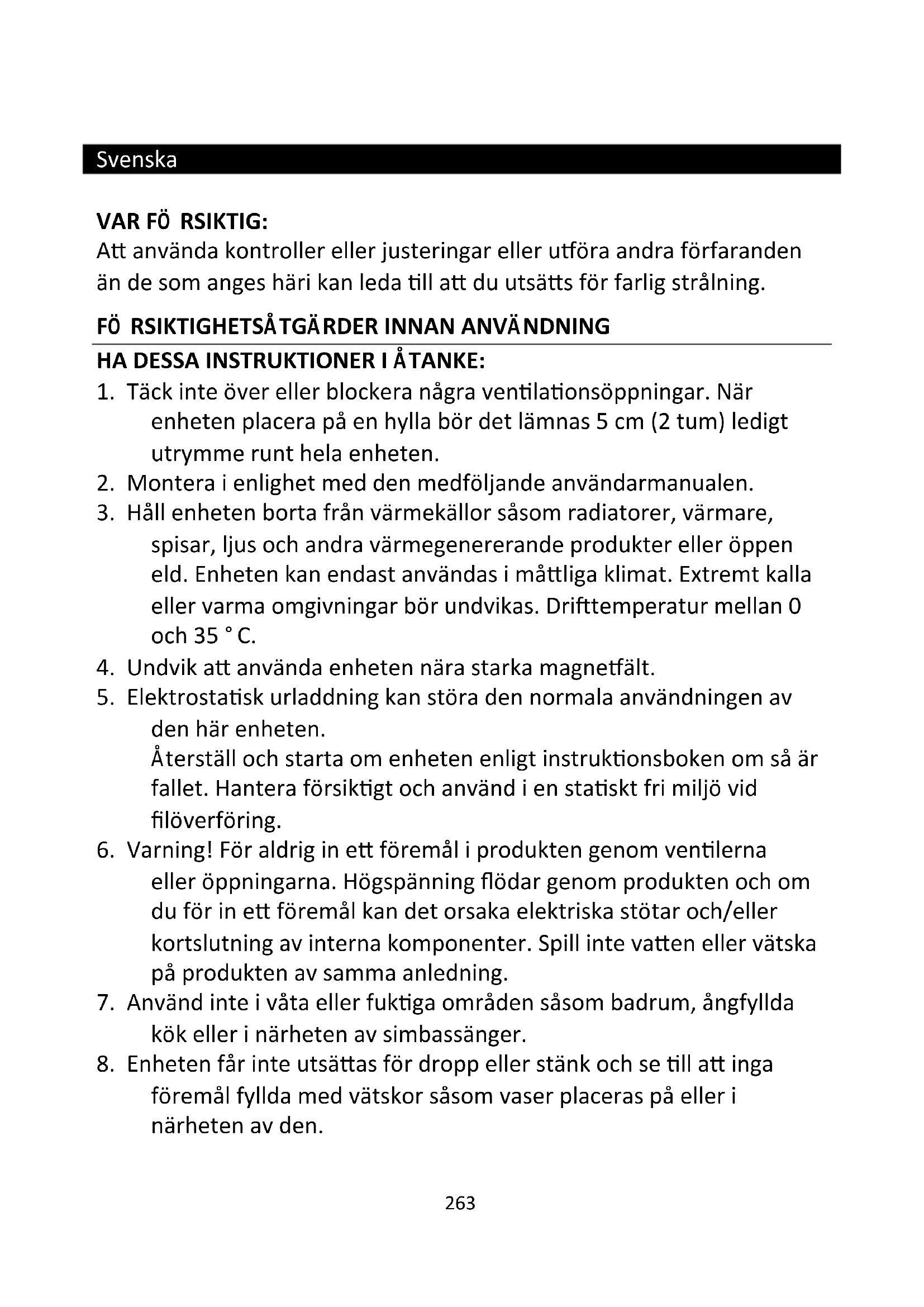 8. Enheten får inte utsättas för dropp eller stänk och se till att inga