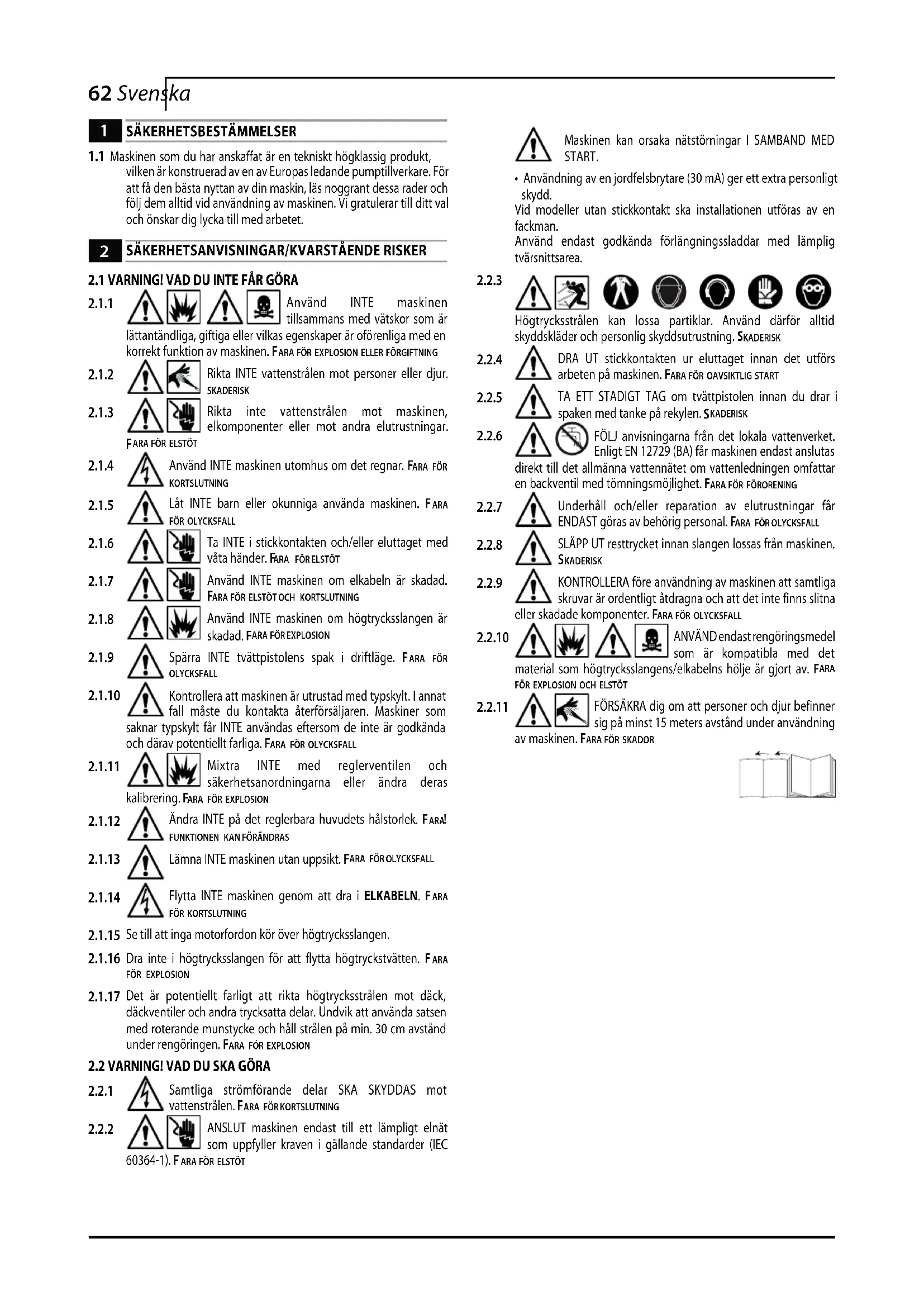 Samtliga strömförande delar SKA SKYDDAS mot vattenstrålen. F ARA FÖR KORTSLUTNING ANSLUT maskinen endast till ett lämpligt elnät som uppfyller kraven i gällande standarder (IEC 60364-1). F ARA FÖR ELSTÖTMaskinen kan orsaka nätstörningar I SAMBAND MED START.• Användning av en jordfelsbrytare (30 mA) ger ett extra personligt skydd.Vid modeller utan stickkontakt ska installationen utföras av en fackman.Använd endast godkända förlängningssladdar med lämplig tvärsnittsarea. Högtrycksstrålen kan lossa partiklar. Använd därför alltid skyddskläder och personlig skyddsutrustning. SKADERISK DRA UT stickkontakten ur eluttaget innan det utförs arbeten på maskinen. F ARA FÖR OAVSIKTLIG START TA ETT STADIGT TAG om tvättpistolen innan du drar i spaken med tanke på rekylen. KADERISK FÖLJ anvisningarna från det lokala vattenverket. Enligt EN 12729 (BA) får maskinen endast anslutas direkt till det allmänna vattennätet om vattenledningen omfattar en backventil med tömningsmöjlighet. F ARA FÖR FÖRORENING Underhåll och/eller reparation av elutrustningar får ENDAST göras av behörig personal. F ARA FÖR OLYCKSFALL SLÄPP UT resttrycket innan slangen lossas från maskinen. KADERISK KONTROLLERA före användning av maskinen att samtliga skruvar är ordentligt åtdragna och att det inte finns slitna eller skadade komponenter. F ARA FÖR OLYCKSFALL ANVÄND endast rengöringsmedel som är kompatibla med det material som högtrycksslangens/elkabelns hölje är gjort av. F ARA FÖR EXPLOSION OCH ELSTÖT FÖRSÄKRA dig om att personer och djur befinner sig på minst 15 meters avstånd under användning av maskinen. F ARA FÖR SKADOR63Svenska
