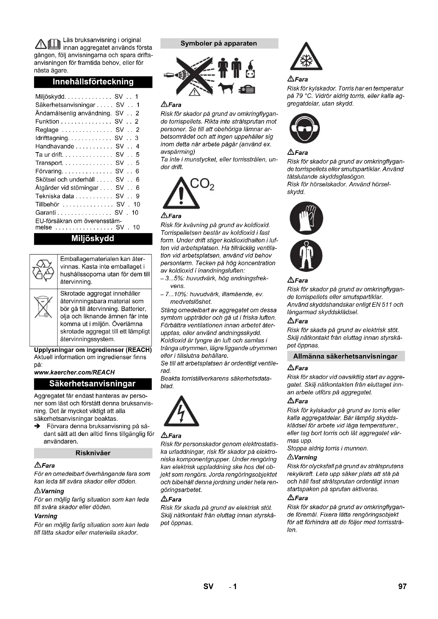 - tørr og oljefri, kompressoren skal i det minste ha en etterkjøler og en kondensavskiller Trykkluftbehov Lydtrykksnivå Lydeffektsnivå 95NO- 10 Vernebrille, duggfri, dele nr.: 6.321-208.0 Beskyttelseshansker mot frost med sklisik- ker profil, kategori III etter EN 511, dele nr.: 6.321-210.0 Hørselsvern med hodebøyle, dele nr.: 6.321-207.0 Rundstråledyse, kort Dele nr.: 4.321-236.0 Rundstråledyse, lang Dele nr.: 4.321-234.0 Flatstråledyse, kort Dele nr.: 4.321-237.0 Flatstråledyse, lang, del av leveransen Dele nr.: 4.321-235.0 Rundstråledyse, vinklet Dele nr.: 4.321-249.0 Flatstråledyse, vinklet Dele nr.: 4.321-250.0 Scrambler Dele nr.: 4.110-015.0 Dyseforlengelse, 300 mm lang Dele nr.: 5.760-001.0 Håndtak Dele nr.: 4.321-248.0 Arbeidslys Dele nr.: 2.815-421.0 Vår ansvarlige salgsorganisasjon for det enkelte land har utgitt garantibetingelsene som gjelder i det aktuelle landet. Eventuelle feil på maskinen blir reparert gratis i ga- rantitiden dersom disse kan føres tilbake til material- eller produksjonsfeil. Ved behov for garantireparasjoner, vennligst henvend deg med kjøpskvitteringen til din forhandler eller nærmeste autoriserte kundeservice. Hierbij verklaren wij dat de hierna vermelde machine door haar ontwerp en bouwwijze en in de door ons in de handel gebrachte uitvoering voldoet aan de betreffende fun- damentele veiligheids- en gezondheidsei- sen, zoals vermeld in de desbetreffende EU-richtlijnen. Deze verklaring verliest haar geldigheid wanneer zonder overleg met ons veranderingen aan de machine worden aangebracht. De ondergetekenden handelen in opdracht en met volmacht van de directie. Documentatieverantwoordelijke: S. Reiser Alfred Kärcher SE & Co. KG Alfred-Kärcher-Straße 28-40 71364 Winnenden (Germany) Tel.: +49 7195 14-0 Fax: +49 7195 14-2212 Winnenden, 2021/02/01 Tilbehør Vernedrakt Stråleinnretning Garanti EU-conformiteitsverklaring Product: Droogijsstraalapparaat Type: 1.574-xxx Van toepassing zijnde EU-richtlijnen 2011/65/EU 2006/42/EG (+2009/127/EG) 2014/30/EU 2009/125/EG + 2009/1781 Toegepaste geharmoniseerde normen EN 55014–1: 2017 + A11: 2020 EN 55014–2: 2015 EN 60204–1 EN 61000–3–2: 2014 EN 61000–3–3: 2013 EN IEC 63000: 2018 EN 62233: 2008 Toegepaste landelijke normen GS-STE-13 (in aansluiting) Chairman of the Board of Management Director Regulatory Affairs & Certification 96 NO- 1 Läs bruksanvisning i original innan aggregatet används första gången, följ anvisningarna och spara drifts- anvisningen för framtida behov, eller för nästa ägare. Upplysningar om ingredienser (REACH) Aktuell information om ingredienser finns på: www.kaercher.com/REACH Aggregatet får endast hanteras av perso- ner som läst och förstått denna bruksanvis- ning. Det är mycket viktigt att alla säkerhetsanvisningar beaktas. Förvara denna bruksanvisning på så- dant sätt att den alltid finns tillgänglig för användaren. Fara För en omedelbart överhängande fara som kan leda till svåra skador eller döden. 몇 Varning För en möjlig farlig situation som kan leda till svåra skador eller döden. Varning För en möjlig farlig situation som kan leda till lätta skador eller materiella skador. Fara Risk för skador på grund av omkringflygan- de torrispellets. Rikta inte strålsprutan mot personer. Se till att obehöriga lämnar ar- betsområdet och att ingen uppehåller sig inom detta när arbete pågår (använd ex. avspärrning) Ta inte i munstycket, eller torrisstrålen, un- der drift. Fara Risk för kvävning på grund av koldioxid. Torrispelletsen består av koldioxid i fast form. Under drift stiger koldioxidhalten i luf- ten vid arbetsplatsen. Ha tillräcklig ventila- tion vid arbetsplatsen, använd vid behov personlarm. Tecken på hög koncentration av koldioxid i inandningsluften: – 3...5%: huvudvärk, hög andningsfrek- vens. – 7...10%: huvudvärk, illamående, ev. medvetslöshet. Stäng omedelbart av aggregatet om dessa symtom uppträder och gå ut i friska luften. Förbättra ventilationen innan arbetet åter- upptas, eller använd andningsskydd. Koldioxid är tyngre än luft och samlas i trånga utrymmen, lägre liggande utrymmen eller i tillslutna behållare. Se till att arbetsplatsen är ordentligt ventile- rad. Beakta torristillverkarens säkerhetsdata- blad. Fara Risk för personskador genom elektrostatis- ka urladdningar, risk för skador på elektro- niska komponentgrupper. Under rengöring kan elektrisk uppladdning ske hos det ob- jekt som rengörs. Jorda rengöringsobjektet och bibehåll denna jordning under hela ren- göringsarbetet. Fara Risk för skada på grund av elektrisk stöt. Skilj nätkontakt från eluttag innan styrskå- pet öppnas. Fara Risk för kylskador. Torris har en temperatur på 79 °C. Vidrör aldrig torris, eller kalla ag- gregatdelar, utan skydd. Fara Risk för skador på grund av omkringflygan- de torrispellets eller smutspartiklar. Använd tätslutande skyddsglasögon. Risk för hörselskador. Använd hörsel- skydd. Fara Risk för skador på grund av omkringflygan- de torrispellets eller smutspartiklar. Använd skyddshandskar enligt EN 511 och långarmad skyddsklädsel. Fara Risk för skada på grund av elektrisk stöt. Skilj nätkontakt från eluttag innan styrskå- pet öppnas. Fara Risk för skador vid oavsiktlig start av aggre- gatet. Skilj nätkontakten från eluttaget inn- an arbete utförs på aggregatet. Fara Risk för kylskador på grund av torris eller kalla aggregatdelar. Bär lämplig skydds- klädsel för arbete vid låga temperaturer., eller tag bort torris och låt aggregatet vär- mas upp. Stoppa aldrig torris i munnen. 몇 Varning Risk för olycksfall på grund av strålsprutans rekylkraft. Leta upp säker plats att stå på och håll fast strålsprutan ordentligt innan startspaken på sprutan aktiveras. Fara Risk för skador på grund av omkringflygan- de föremål. Fixera lätta rengöringsobjekt för att förhindra att de följer med torrisstrå- len. Innehållsförteckn
