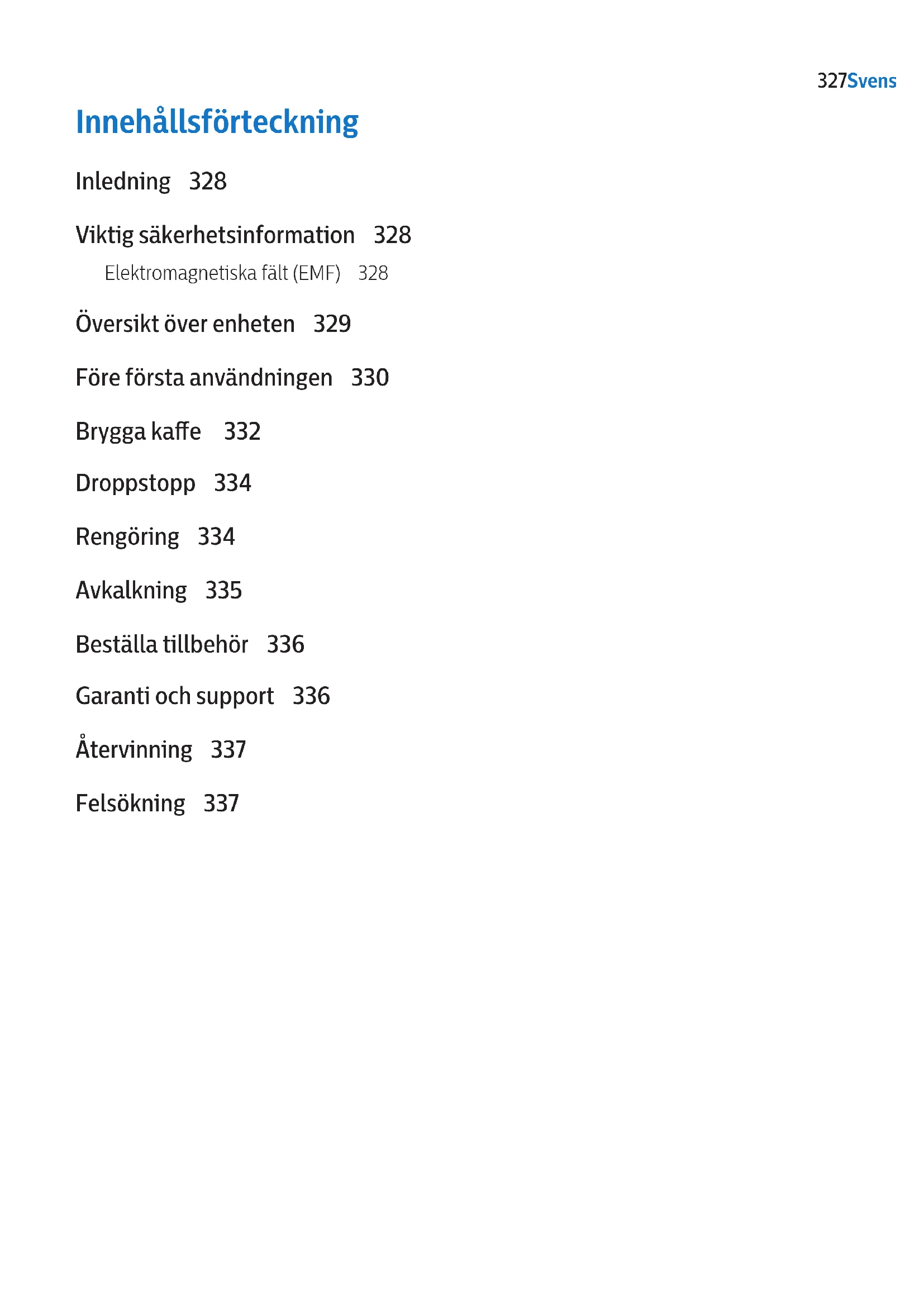 - Ako bokal uklonite iz aparata na više od 20 sekundi tokom kuvanja, lter će početi da se prepunjava. 326 SrpskiInnehållsförteckning Inledning 328 Viktig säkerhetsinformation 328 Elektromagnetiska fält (EMF) 328 Översikt över enheten 329 Före första användningen 330 Brygga kae 332 Droppstopp 334 Rengöring 334 Avkalkning 335 Beställa tillbehör 336 Garanti och support 336 Återvinning 337 Felsökning 337 327SvenskaInledning Grattis till ditt inköp och välkommen till Philips! För att dra maximal nytta av den support som Philips erbjuder kan du registrera din produkt på www.philips.com/welcome. Viktig säkerhetsinformation Läs den här viktiga informationen noggrant innan du använder apparaten och spara sedan informationen för framtida bruk. Fara - Sänk aldrig ned apparaten i vatten eller någon annan vätska. Varning - Kontrollera att den spänning som anges på apparaten överensstämmer med den lokala nätspänningen innan du ansluter apparaten. - Anslut apparaten till ett jordat vägguttag. - Använd inte apparaten om stickkontakten, nätsladden eller själva apparaten är skadad. - Om nätsladden är skadad måste den alltid bytas ut av Philips, något av Philips auktoriserade serviceombud eller liknande behöriga personer för att undvika olyckor. - Den här apparaten kan användas av barn som är 8 år eller äldre och av personer med olika funktionsnedsättningar eller som inte har kunskap om hur apparaten används, så länge de övervakas och får instruktioner angående säker användning och förstår riskerna som medföljer. Rengöring och underhåll får inte utföras av barn om de inte är över åtta år och övervakas av en vuxen person. Se till att apparaten och dess sladd är utom räckhåll för barn under 8 år. - Barn ska inte leka med apparaten. - Se till att nätsladden inte hänger över kanten på bordet eller arbetsbänken där apparaten står. - Använd endast apparaten för avsett ändamål för att undvika potentiell fara eller skada. Försiktighet - Skölj alltid apparaten med rent vatten före första användningen. - Placera inte apparaten på en varm yta och låt inte nätsladden komma i kontakt med varma ytor. - Placera inte apparaten i ett skåp medan den används. - Dra ur nätsladden innan du rengör apparaten och om problem uppstår när du brygger. - När du brygger kae och till dess att du stänger av apparaten är lterhållaren, apparatens nederdel, värmeplattan och den kaefyllda kannan varma. - Ställ inte kannan på en spis eller i en mikrovågsugn för att värma upp kaet. - Den här apparaten är avsedd att användas i hushåll och liknande miljöer, som till exempel bondgårdar, bed and breakfast-miljöer, personalkök i aärer, på kontor och i andra arbetsmiljöer, av gäster på hotell, motell och andra typer av boendemiljöer. - Lämna alltid in apparaten till ett serviceombud auktoriserat av Philips för undersökning och reparation. Försök inte öppna eller reparera apparaten själv. Elektromagnetiska fält (EMF) Den här Philips-produkten uppfyller alla tillämpliga standarder och regler gällande exponering för elektromagnetiska fält. 328 SvenskaÖversikt över enheten 1 Filterhållare 2 Filterkropp 3 Lock till kannan 4 Glaskanna 5 Värmeplatta 6 På/av-knapp 7 Vattentank 8 Lock till lterhållaren 9 Lock till vattentanken