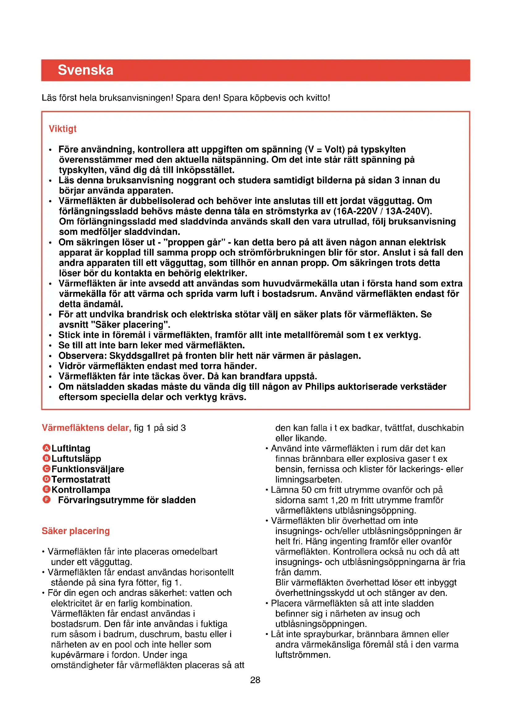 - Om nätsladden skadas måste du vända dig till någon av Philips auktoriserade verkstäder eftersom speciella delar och verktyg krävs. Svenska Läs först hela bruksanvisningen! Spara den! Spara köpbevis och kvitto!y = Antifrostläge. Det här läget motsvarar termostatens minimiläge (ungefär +5°C / 41°F) och kan användas för att hålla temperaturen i värmefläktens omedelbara närhet frostfri. Ställ värmefläkten nära den plats där temperaturen måste hållas över fryspunkten till exempel nära ett rör som kan frysa. Observera att termostatratten skall stå i sitt högsta läge när du valt kalluftläget >. Kontrollampan - Kontrollampan (E) lyser när värmefläkten är ansluten till ett eluttag och funktionsomkopplaren står i >, 1 eller 2. - Kontrollampan lyser tills värmefläkten stängs av genom att funktionsväljaren (C) ställs i läge O eller om stickproppen dras ut ur vägguttaget. - Kontrollampan lyser så länge värmefläkten är ansluten till ett eluttag och funktionsomkopplaren står i >, 1 eller 2 även om den inställda temperaturen har uppnåtts och termostaten stängt av värmefläkten. Av samma skäl kommer kontrollampan att lysa även om överhettningsskyddet löst ut och värmefläkten stannat. Överhettningsskydd Värmefläkten är skyddad mot överhettning med ett inbyggt överhettningsskydd som löser ut och stänger av om värmeslingorna skulle bli för varma. Gör så här om det händer: - Kontrollera först att det inte var termostaten som stoppade värmefläkten. Vrid termostatratten till max läget. Om inte värmefläkten startar har överhettningsskyddet löst ut. - Dra ut stickproppen ur vägguttaget. - Låt värmefläkten stå och kallna i 30 minuter. - Kontrollera att värmefläkten är placerad på rätt sätt. - Kontrollera om damm eller något annat hindrar luftströmmen. Om nödvändigt rengör skyddsgallren med dammsugare, se avsnittet "Rengöring" - Sätt stickproppen i vägguttaget och starta värmefläkten igen.