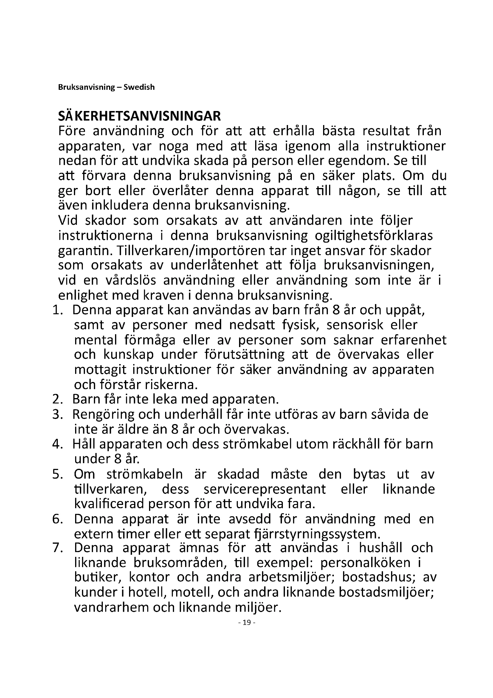 19. Använd inte apparaten för något annat ändamål än den är