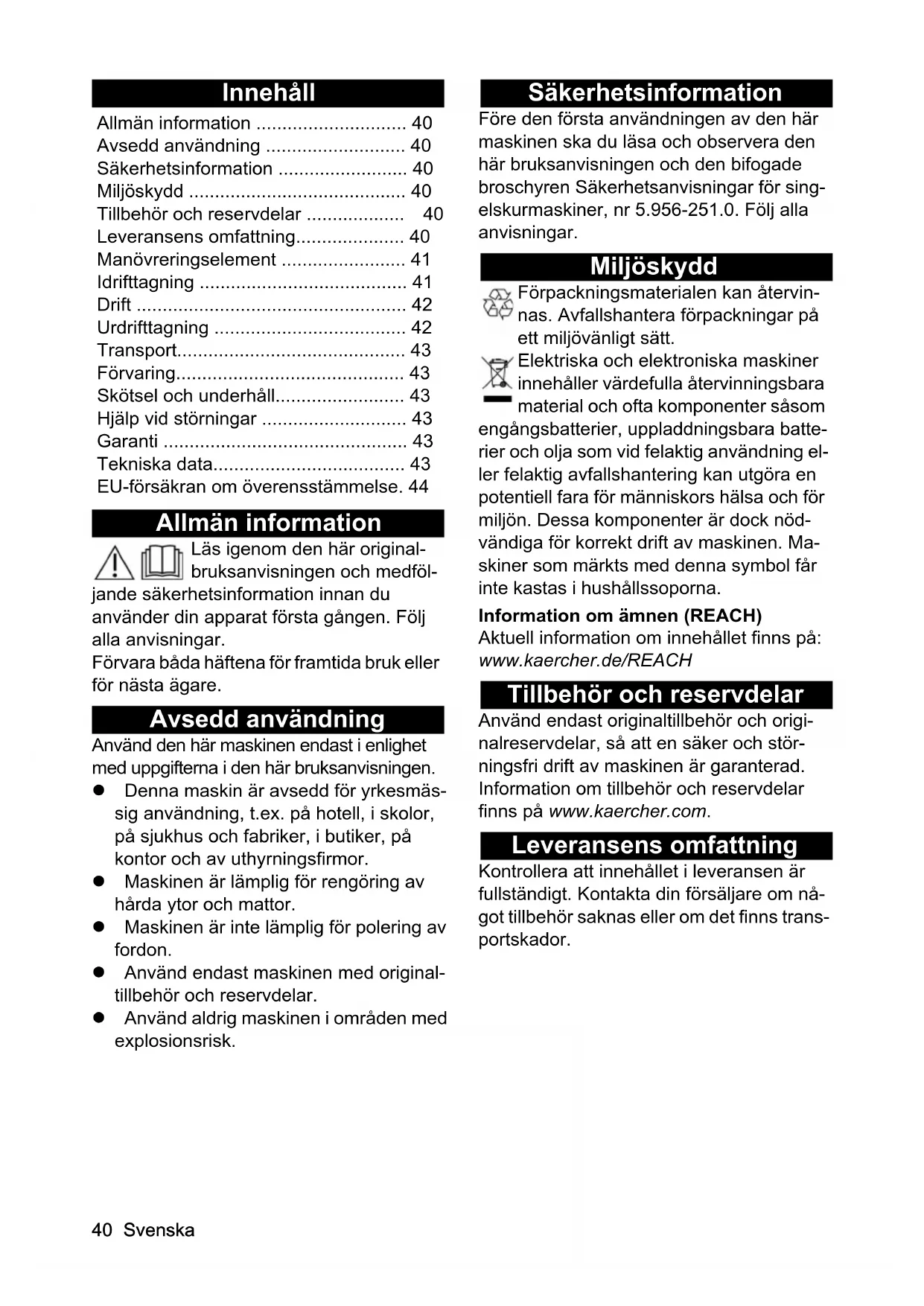 • dB(A) 77,240 Svenska Innehåll Allmän information Läs igenom den här original- bruksanvisningen och medföl- jande säkerhetsinformation innan du använder din apparat första gången. Följ alla anvisningar. Förvara båda häftena för framtida bruk eller för nästa ägare. Avsedd användning Använd den här maskinen endast i enlighet med uppgifterna i den här bruksanvisningen. Denna maskin är avsedd för yrkesmäs- sig användning, t.ex. på hotell, i skolor, på sjukhus och fabriker, i butiker, på kontor och av uthyrningsfirmor. Maskinen är lämplig för rengöring av hårda ytor och mattor. Maskinen är inte lämplig för polering av fordon. Använd endast maskinen med original- tillbehör och reservdelar. Använd aldrig maskinen i områden med explosionsrisk. Säkerhetsinformation Före den första användningen av den här maskinen ska du läsa och observera den här bruksanvisningen och den bifogade broschyren Säkerhetsanvisningar för sing- elskurmaskiner, nr 5.956-251.0. Följ alla anvisningar. Miljöskydd Förpackningsmaterialen kan återvin- nas. Avfallshantera förpackningar på ett miljövänligt sätt. Elektriska och elektroniska maskiner innehåller värdefulla återvinningsbara material och ofta komponenter såsom engångsbatterier, uppladdningsbara batte- rier och olja som vid felaktig användning el- ler felaktig avfallshantering kan utgöra en potentiell fara för människors hälsa och för miljön. Dessa komponenter är dock nöd- vändiga för korrekt drift av maskinen. Ma- skiner som märkts med denna symbol får inte kastas i hushållssoporna. Information om ämnen (REACH) Aktuell information om innehållet finns på: www.kaercher.de/REACH Tillbehör och reservdelar Använd endast originaltillbehör och origi- nalreservdelar, så att en säker och stör- ningsfri drift av maskinen är garanterad. Information om tillbehör och reservdelar finns på www.kaercher.com. Leveransens omfattning Kontrollera att innehållet i leveransen är fullständigt. Kontakta din försäljare om nå- got tillbehör saknas eller om det finns trans- portskador. Allmän information p. 40