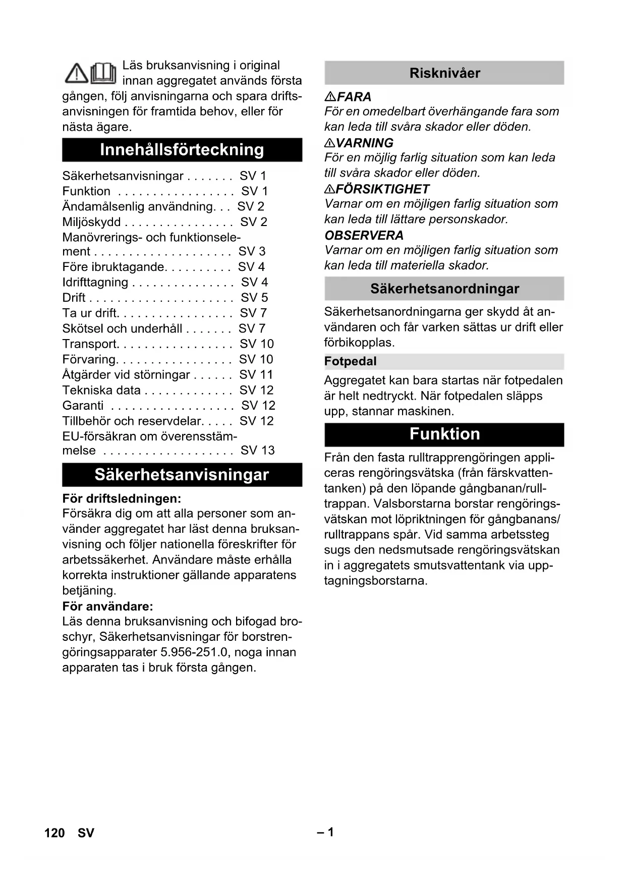 Chairman of the Board of Management Director Regulatory Affairs & Certification 119NO– 1 Läs bruksanvisning i original innan aggregatet används första gången, följ anvisningarna och spara drifts- anvisningen för framtida behov, eller för nästa ägare. För driftsledningen: Försäkra dig om att alla personer som an- vänder aggregatet har läst denna bruksan- visning och följer nationella föreskrifter för arbetssäkerhet. Användare måste erhålla korrekta instruktioner gällande apparatens betjäning. För användare: Läs denna bruksanvisning och bifogad bro- schyr, Säkerhetsanvisningar för borstren- göringsapparater 5.956-251.0, noga innan apparaten tas i bruk första gången. FARA För en omedelbart överhängande fara som kan leda till svåra skador eller döden. 몇 VARNING För en möjlig farlig situation som kan leda till svåra skador eller döden. 몇 FÖRSIKTIGHET Varnar om en möjligen farlig situation som kan leda till lättare personskador. OBSERVERA Varnar om en möjligen farlig situation som kan leda till materiella skador. Säkerhetsanordningarna ger skydd åt an- vändaren och får varken sättas ur drift eller förbikopplas. Aggregatet kan bara startas när fotpedalen är helt nedtryckt. När fotpedalen släpps upp, stannar maskinen. Från den fasta rulltrapprengöringen appli- ceras rengöringsvätska (från färskvatten- tanken) på den löpande gångbanan/rull- trappan. Valsborstarna borstar rengörings- vätskan mot löpriktningen för gångbanans/ rulltrappans spår. Vid samma arbetssteg sugs den nedsmutsade rengöringsvätskan in i aggregatets smutsvattentank via upp- tagningsborstarna. Innehållsförteckning Säkerhetsanvisningar . . . . . . . SV 1 Funktion . . . . . . . . . . . . . . . . . SV 1 Ändamålsenlig användning. . . SV 2 Miljöskydd . . . . . . . . . . . . . . . . SV 2 Manövrerings- och funktionsele- ment . . . . . . . . . . . . . . . . . . . . SV 3 Före ibruktagande. . . . . . . . . . SV 4 Idrifttagning . . . . . . . . . . . . . . . SV 4 Drift . . . . . . . . . . . . . . . . . . . . . SV 5 Ta ur drift. . . . . . . . . . . . . . . . . SV 7 Skötsel och underhåll . . . . . . . SV 7 Transport. . . . . . . . . . . . . . . . . SV 10 Förvaring. . . . . . . . . . . . . . . . . SV 10 Åtgärder vid störningar . . . . . . SV 11 Tekniska data . . . . . . . . . . . . . SV 12 Garanti . . . . . . . . . . . . . . . . . . SV 12 Tillbehör och reservdelar. . . . . SV 12 EU-försäkran om överensstäm- melse . . . . . . . . . . . . . . . . . . . SV 13 Säkerhetsanvisningar Risknivåer Säkerhetsanordningar Fotpedal Funktion 120 SV– 2 Denna maskin är lämplig för yrkesmässig och industriell användning, t.ex. på hotell, i skolor, på sjukhus, på fabriker, i butiker, på kontor och hos uthyrningsfirmor. Använd maskinen enbart för de ändamål som beskrivs i denna bruksanvisning. – Aggregatet får bara användas för ren- göring av ståytor på gångbanor och rull- trappor. – Denna maskin är endast avsedd för an- vändning inomhus. – Anläggningens löpriktning måste vara inställd så att gångbanan/rulltrappan rör sig bort från aggregatet. – Vid rengöring av rulltrappaor får aggre- gatet bara användas vid rulltrappans undre del. – Maskinen får endast utrustas med till- behör och reservdelar i originalutföran- de. Upplysningar om ingredienser (REACH) Aktuell information om ingredienser finns på: www.kaercher.com/REACH Ändamålsenlig användning Miljöskydd Emballagematerialen kan åter- vinnas. Kasta inte emballaget i hushållssoporna utan lämna det till återvinning. Kasserade apparater innehåller återvinningsbart material som bör gå till återvinning. Batterier, olja och liknande ämnen får inte komma ut i miljön. Överlämna skrotade aggregat till ett lämpligt återvinningssystem. 121SV– 3 1 Skjuthandtag 2 Avloppsslang färskvatten 3 Tömningsslang smutsvatten 4 Nätkontakt 5 Dragavlastningshakar 6 Fotpedal 7 Bakhjul med stoppspak 8 Skydd smutsvattentank 9Framhjul 10 Smutsvattentank 11 Påfyllningsöppning färskvattentank 12 Pedal för sänkning/lyftning av borsthu- vudet 13 Spak för att spärra borsthuvudet 1 Räkneverk för driftstimmar 2 Indikering pumptryck 3 Huvudreglage 4 Kontrollampa "smutsvattentank full" 5 Kontrollampa "överbelastning borste" Manövrerings- och funktionselement Manöverpult 122 SV– 4 Ta bort all förpackning förutom träpal- len. Sätt i skjutbygeln i aggregatets urtag. Montera skjutbygelnmed de 4 medföl- jande skruvarna. Montera täckkåporna. Häng i dragavlastningshakarna på skjutbygeln. Ställ fast bakhjulen, ta bort träklossarna från hjulen. Fyra märkta plankor på pallen har fästs fast med skruvar. Skruva ur dessa plankor. Lägg plankorna på pallens kant. Rikta plankorna så att de ligger framför ma- skinens hjul. Skruva fast plankorna med skruvarna. För långsamt ner aggregatet från rampen. Hänvisning: Vid tillverkningen har maskinen spolats med frostskyddsmedel. För första idrifttag- ning måste frostskyddsmedlet avlägsnas. Fyll på 10 liter färskvatten i färskvatten- tanken. Trampa på fotpedalen. Ställ in omkopplaren till grundrengöring. Låt aggregatet vara igång tills trycket på manometern sjunker. FARA Risk för personskador! Maskinen kan bli hängande och dras med av gångbanan/ rulltrappan. Se efter om de finns deforme- ringar eller inklämda föremål på ståytor och i spår innan rengöring påbörjas. Ta för sä- kerhets skull reda på var rullbandets/rull- trappans nödstoppsknapp befinner sig. Spärra av gångbanan/rulltrappan så länge som rengöring pågår och gåytor- na fortfarande är fuktiga. Symboler på aggregatet Tömning smutsvatten Tömning färskvatten Påfyllningsöppning färskvat- tentank Parkeringsbroms Fotpedal Töm färsk- och smutsv- attentanken innan maski- nen tippas. Före ibruktagande Montera skjutbygeln