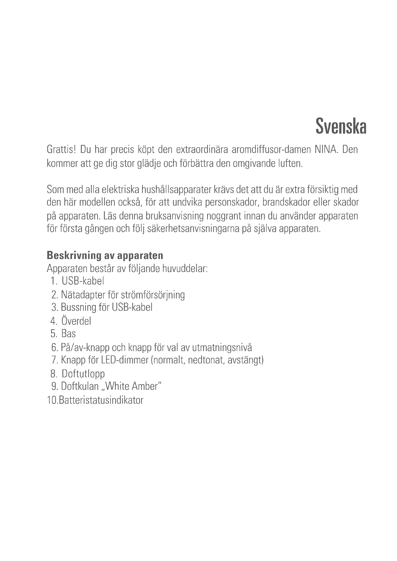 - Om apparaten inte går att reparera, gör den obrukbar omedelbart och lämna in den på en lämplig återvinningsstation. Kassering Det europeiska direktivet 2012 / 19 / CE om avfall från elektrisk och elektronisk utrustning (WEEE), kräver att gammal hushållselektronik INTE kastas i det nor- mala osorterade avfallet. Förbrukad utrustning måste samlas in separat för att optimera återanvändning och återvinning av det material som de innehåller och för minska påverkan på människors hälsa och på miljön. Symbolen med den över-korsade ”soptunnan” på produkten påminner dig om din skyldighet att apparaten måste samlas in separat när det kasseras. Du kan kontakta din lokala myndighet eller återförsäljare för information om korrekt kassering av förbrukad elektronisk utrustning. Doftkulan består av en klorfri plast och kan kastas i hus- hållssoporna. Batteriernas avfallshantering: Släng dem inte i pappers- korgen, elektroden är insvept i isolerande papper och kan återvinnas och återanvändas. Specifikationer Märkspänning 100–240 V / 50/60 Hz Utgående effekt 3.5 W Drifttiden upp till 50 h Mått 100 x 160 mm (diameter x höjd) Vikt 360 g Ljudnivå < 26 dB(A) Batteriladdningens temperaturområde 0–45 °C Batterimodell PN103040 Uppfyller direktiven CE / RoHS / EAC Alla rättigheter för tekniska ändringar förbehållesРусский Поздравляем! Вы приобрели необыкновенный ароматический диффузор NINA. Использование этого устройства позволит улучшить воздух в поме- щении, а эксплуатация доставит несомненное удовольствие. При эксплуатации ароматизатора воздуха, а также иных электроприбо- ров, следует обращать особое внимание на меры безопасности. Прежде, чем использовать этот электроприбор, внимательно прочтите инструк- цию. Во избежание травм или повреждений имущества, строго следуйте приведенным в данной инструкции рекомендациями. Описание устройства Устройство состоит из следующих компонентов: