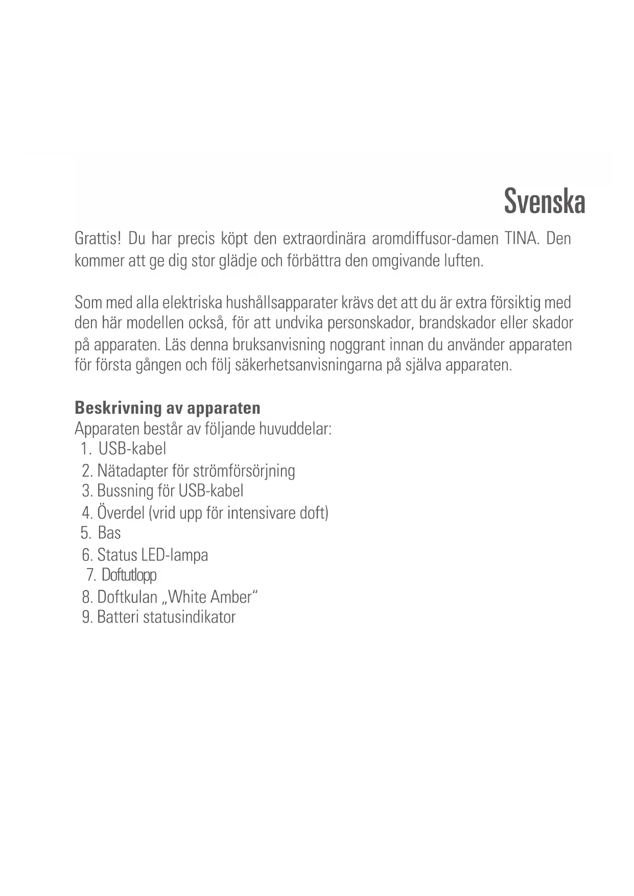Din aromdiffusor fungerar enligt den naturliga avdunstningsprincipen. En fläkt blåser luft över doftkulans doftoljefyllda små kulor och avger därigenom doft till rumsluften. Viktiga säkerhetsanvisningar Läs igenom bruksanvisningen noga innan du använder apparaten för första gång- en och håll den i säkert förvar för framtida referens, vid behov ger du den vidare till nästa ägare.