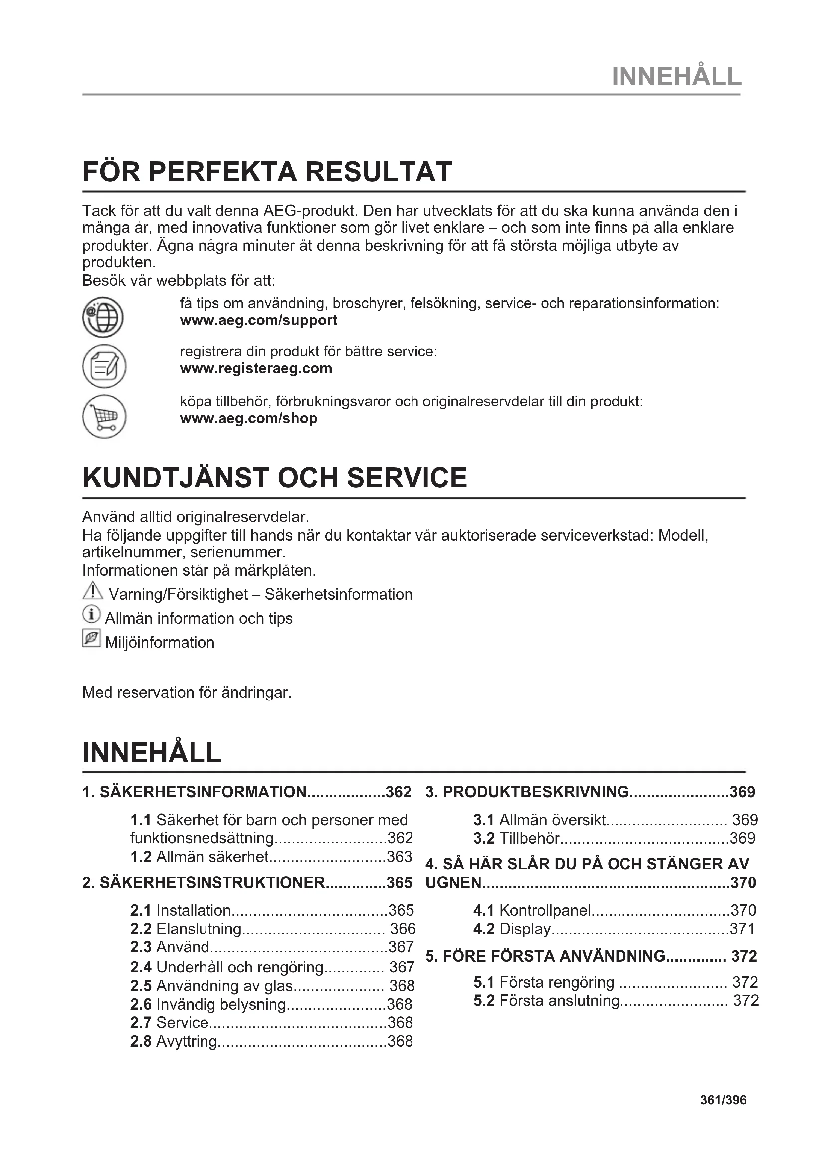 Recicle los materiales con el símbolo . Coloque el material de embalaje en los contenedores adecuados para su reciclaje. Ayude a proteger el medio ambiente y la salud pública, así como a reciclar residuos de aparatos eléctricos y electrónicos. No deseche los aparatos marcados con el símbolo junto con los residuos domésticos. Lleve el producto a su centro de reciclaje local o póngase en contacto con su oficina municipal. 360/396 ¡TOME UN ATAJO!FÖR PERFEKTA RESULTAT Tack för att du valt denna AEG-produkt. Den har utvecklats för att du ska kunna använda den i många år, med innovativa funktioner som gör livet enklare – och som inte finns på alla enklare produkter. Ägna några minuter åt denna beskrivning för att få största möjliga utbyte av produkten. Besök vår webbplats för att: få tips om användning, broschyrer, felsökning, service- och reparationsinformation: www.aeg.com/support registrera din produkt för bättre service: www.registeraeg.com köpa tillbehör, förbrukningsvaror och originalreservdelar till din produkt: www.aeg.com/shop