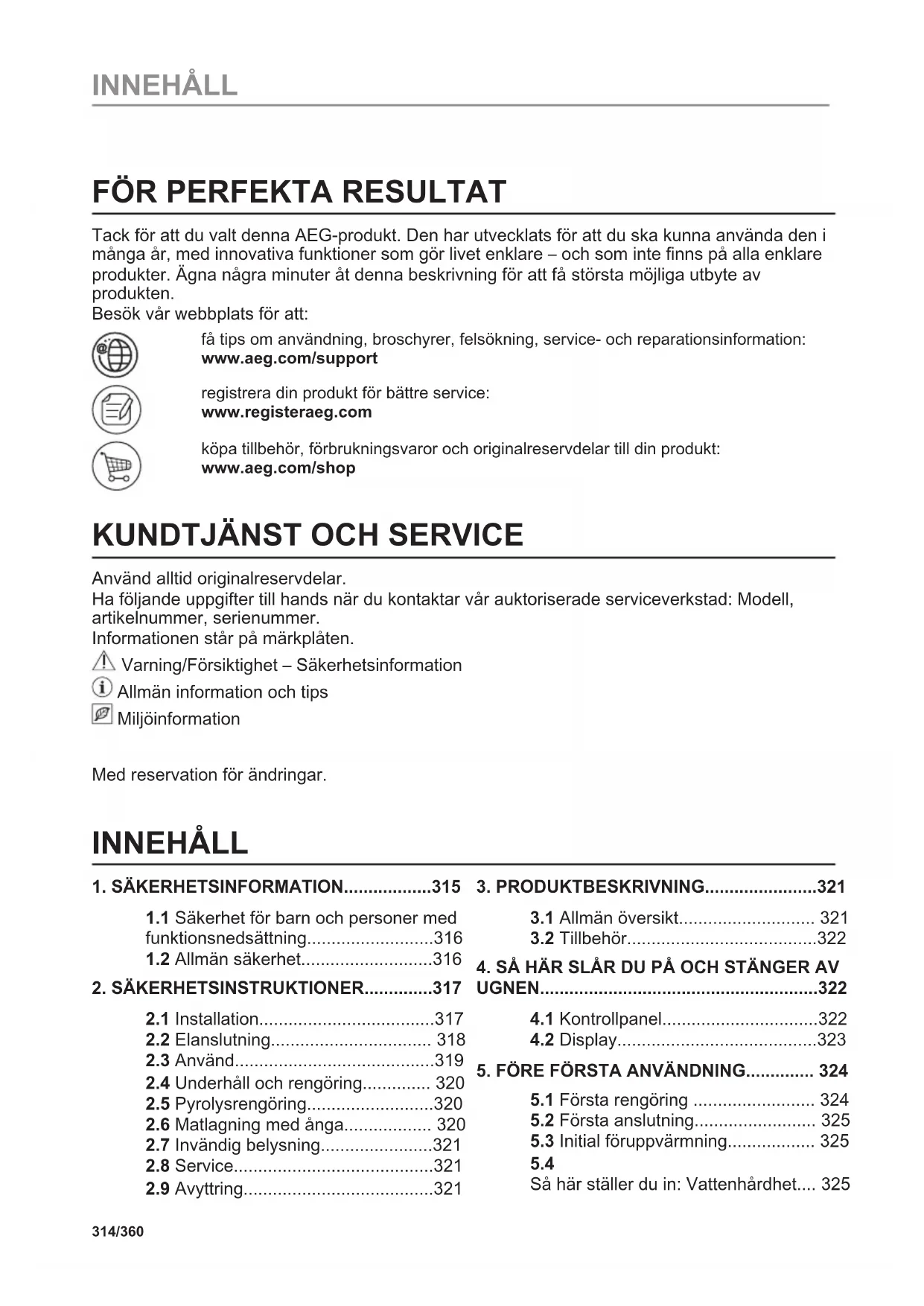 Recicle los materiales con el símbolo . Coloque el material de embalaje en los contenedores adecuados para su reciclaje. Ayude a proteger el medio ambiente y la salud pública, así como a reciclar residuos de aparatos eléctricos y electrónicos. No deseche los aparatos marcados con el símbolo junto con los residuos domésticos. Lleve el producto a su centro de reciclaje local o póngase en contacto con su oficina municipal. 313/360 ¡TOME UN ATAJO!FÖR PERFEKTA RESULTAT Tack för att du valt denna AEG-produkt. Den har utvecklats för att du ska kunna använda den i många år, med innovativa funktioner som gör livet enklare – och som inte finns på alla enklare produkter. Ägna några minuter åt denna beskrivning för att få största möjliga utbyte av produkten. Besök vår webbplats för att: få tips om användning, broschyrer, felsökning, service- och reparationsinformation: www.aeg.com/support registrera din produkt för bättre service: www.registeraeg.com köpa tillbehör, förbrukningsvaror och originalreservdelar till din produkt: www.aeg.com/shop