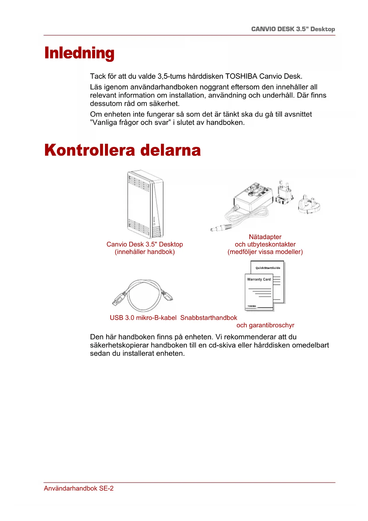 - Bestämmelser Användarhandbok SE-2 CANVIO DESK 3.5" Desktop Inledning Tack för att du valde 3,5-tums hårddisken TOSHIBA Canvio Desk. Läs igenom användarhandboken noggrant eftersom den innehåller all relevant information om installation, användning och underhåll. Där finns dessutom råd om säkerhet. Om enheten inte fungerar så som det är tänkt ska du gå till avsnittet ”Vanliga frågor och svar” i slutet av handboken. Kontrollera delarna Den här handboken finns på enheten. Vi rekommenderar att du säkerhetskopierar handboken till en cd-skiva eller hårddisken omedelbart sedan du installerat enheten. Warranty Card Canvio Desk 3.5" Desktop (innehåller handbok) Nätadapter och utbyteskontakter (medföljer vissa modeller) USB 3.0 mikro-B-kabel Snabbstarthandbok och garantibroschyrAnvändarhandbok SE-3 CANVIO DESK 3.5" Desktop Säkerhetsanvisningar Följ anvisningarna nedan för att undvika störningar och att enheten skadas. ■ Säkerhetskopiera alla data eftersom Toshiba inte ansvarar för skadade eller förlorade data. Toshiba ersätter inte eventuella kostnader för återställning av data. ■ Du ska inte ■ öppna inneslutningen eller enheten ■ montera isär enheten eller delar därav ■ placera vätskor på eller i närheten av enheten eftersom de kan skada enheten, orsaka personskada samt resultera i elstötar och eldsvåda ■ slå på, tappa eller skaka enheten ■ flytta enheten medan den arbetar eftersom dina data kan skadas ■ använda annat än USB-anslutningar ■ använda andra nätadaptrar än den som medföljer enheten eftersom den annars riskeras att skadas. ■ koppla från kablar medan den används. Koppla från enheten först! ■ utsätta enheten för temperaturer utanför intervallet 5° – 35°C när den används och -20° – 60°C när den är avstängd ■ utsätta enheten för väta eller fuktiga miljöer ■ täcka över enheten medan den arbetar eftersom den kan överhettas ■ placera enheten i närheten av värmekällor. ■ Och ■ kontrollera att kontakterna är ordentligt isatta. ■ tryck inte så hårt när du sätter fast kablarna. ■ kontrollera polariteten innan du gör anslutningarna ■ Ta bort enheten från strömkällan och värddatorn om ■ rök eller ovanlig lukt tränger ut ur inneslutningen ■ vatten har kommit in i inneslutningen eller om den blivit våt ■ ett föremål har kommit in i inneslutningen ■ kabeln har blivit skadad (ersätt då den skadade kabeln med en ny) Kontakta Toshiba-support eller återförsäljaren omedelbart om enheten inte fungerar normalt eller om du är tveksam när det gäller elsäkerheten. VARNINGAnvändarhandbok SE-4 CANVIO DESK 3.5" Desktop Systemkrav ■ Windows Vista p. 9