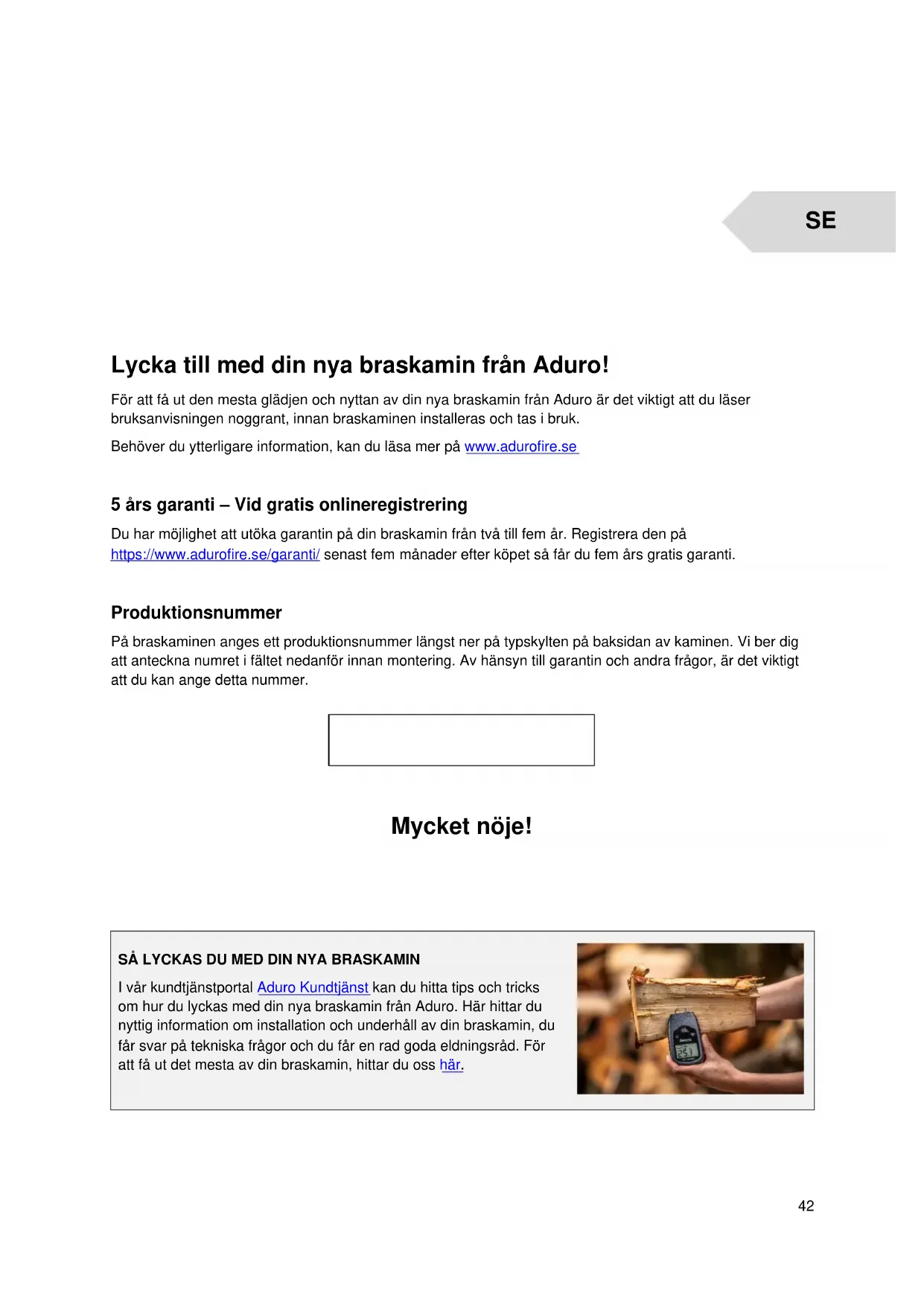 Lycka till med din nya braskamin från Aduro! För att få ut den mesta glädjen och nyttan av din nya braskamin från Aduro är det viktigt att du läser bruksanvisningen noggrant, innan braskaminen installeras och tas i bruk. Behöver du ytterligare information, kan du läsa mer på www.adurofire.se 5 års garanti – Vid gratis onlineregistrering Du har möjlighet att utöka garantin på din braskamin från två till fem år. Registrera den på https://www.adurofire.se/garanti/ senast fem månader efter köpet så får du fem års gratis garanti. Produktionsnummer På braskaminen anges ett produktionsnummer längst ner på typskylten på baksidan av kaminen. Vi ber dig att anteckna numret i fältet nedanför innan montering. Av hänsyn till garantin och andra frågor, är det viktigt att du kan ange detta nummer.