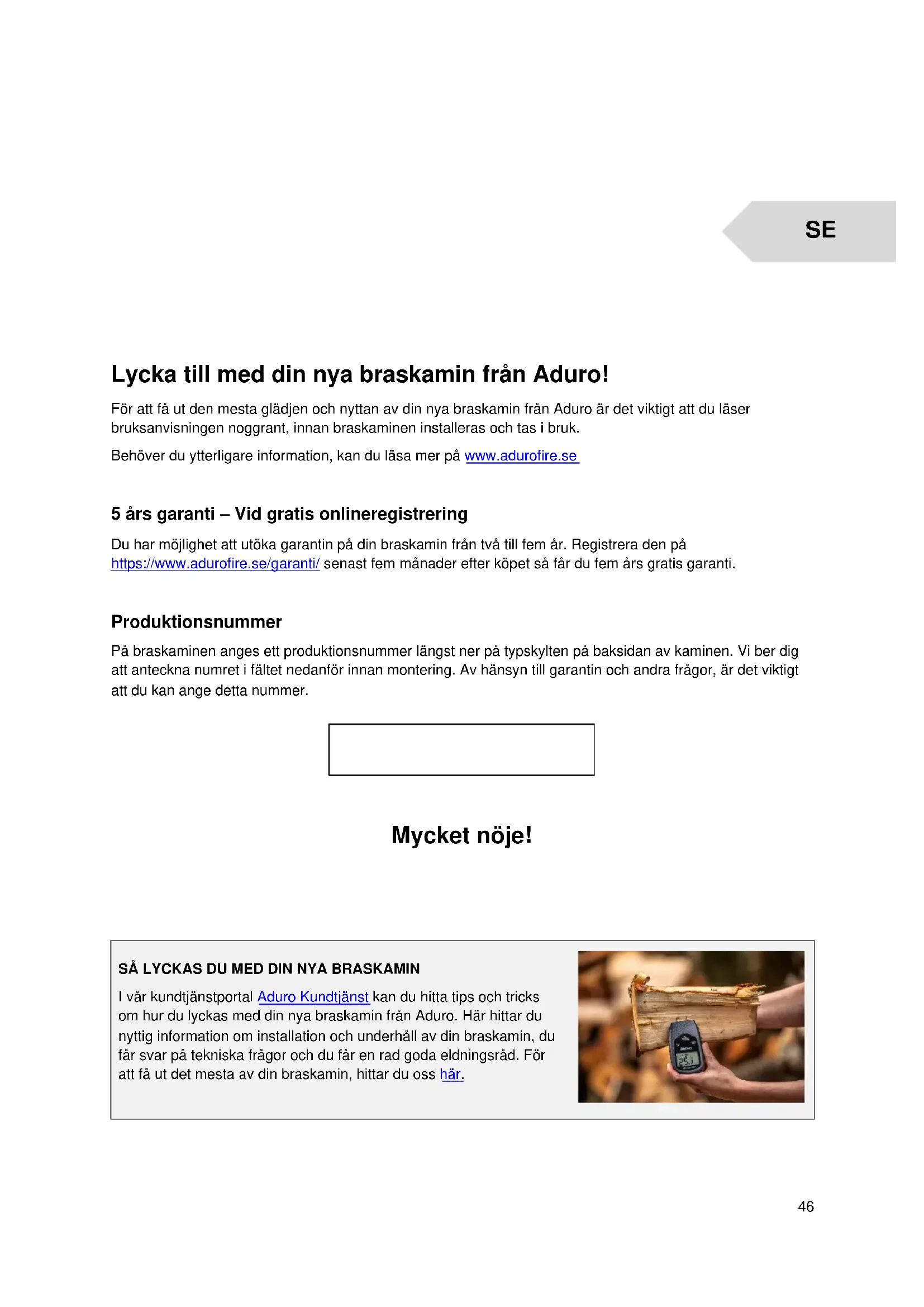 Lycka till med din nya braskamin från Aduro! För att få ut den mesta glädjen och nyttan av din nya braskamin från Aduro är det viktigt att du läser bruksanvisningen noggrant, innan braskaminen installeras och tas i bruk. Behöver du ytterligare information, kan du läsa mer på www.adurofire.se 5 års garanti – Vid gratis onlineregistrering Du har möjlighet att utöka garantin på din braskamin från två till fem år. Registrera den på https://www.adurofire.se/garanti/ senast fem månader efter köpet så får du fem års gratis garanti. Produktionsnummer På braskaminen anges ett produktionsnummer längst ner på typskylten på baksidan av kaminen. Vi ber dig att anteckna numret i fältet nedanför innan montering. Av hänsyn till garantin och andra frågor, är det viktigt att du kan ange detta nummer.