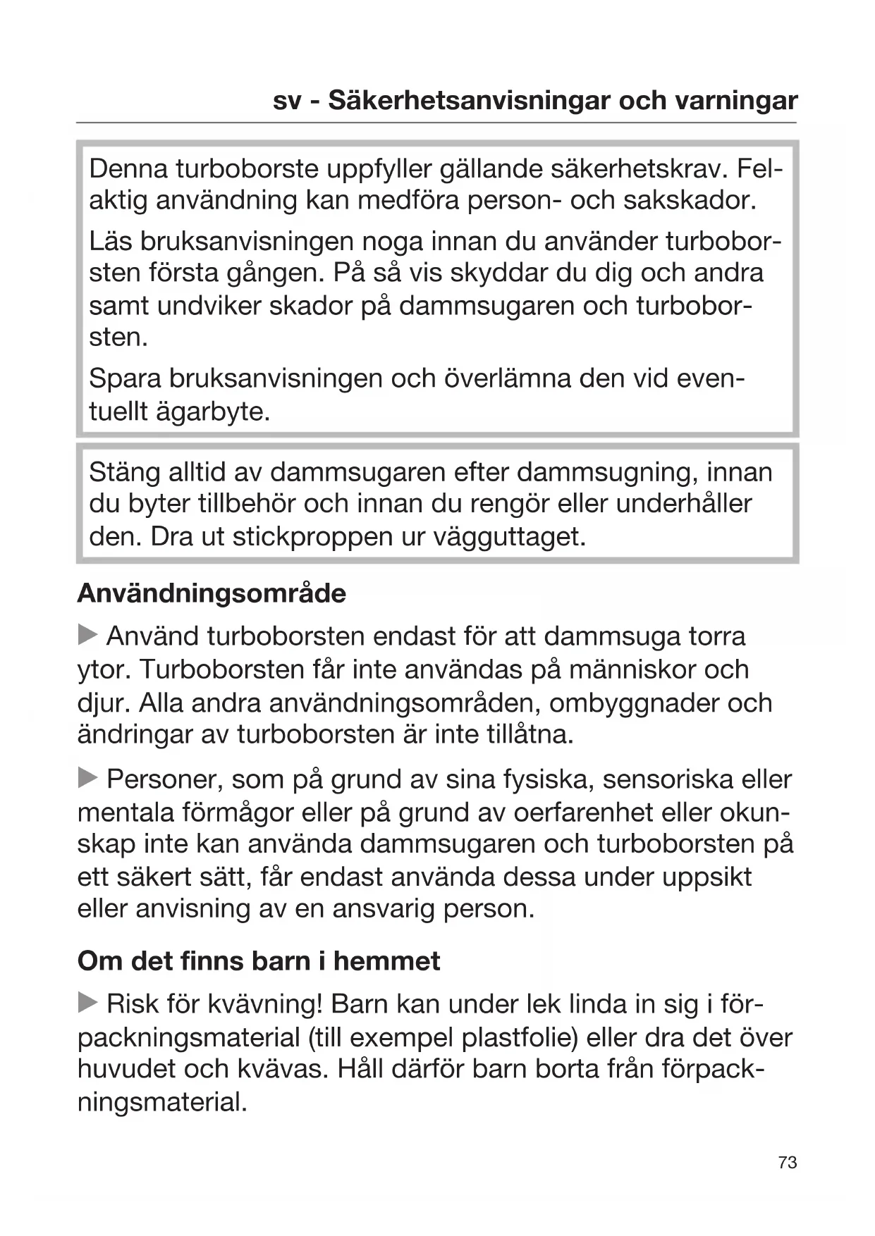 Denna turboborste uppfyller gällande säkerhetskrav. Fel- aktig användning kan medföra person- och sakskador. Läs bruksanvisningen noga innan du använder turbobor- sten första gången. På så vis skyddar du dig och andra samt undviker skador på dammsugaren och turbobor- sten. Spara bruksanvisningen och överlämna den vid even- tuellt ägarbyte. Stäng alltid av dammsugaren efter dammsugning, innan du byter tillbehör och innan du rengör eller underhåller den. Dra ut stickproppen ur vägguttaget. Användningsområde Använd turboborsten endast för att dammsuga torra ytor. Turboborsten får inte användas på människor och djur. Alla andra användningsområden, ombyggnader och ändringar av turboborsten är inte tillåtna. Personer, som på grund av sina fysiska, sensoriska eller mentala förmågor eller på grund av oerfarenhet eller okun- skap inte kan använda dammsugaren och turboborsten på ett säkert sätt, får endast använda dessa under uppsikt eller anvisning av en ansvarig person. Om det finns barn i hemmet Risk för kvävning! Barn kan under lek linda in sig i för- packningsmaterial (till exempel plastfolie) eller dra det över huvudet och kvävas. Håll därför barn borta från förpack- ningsmaterial.sv - Säkerhetsanvisningar och varningar