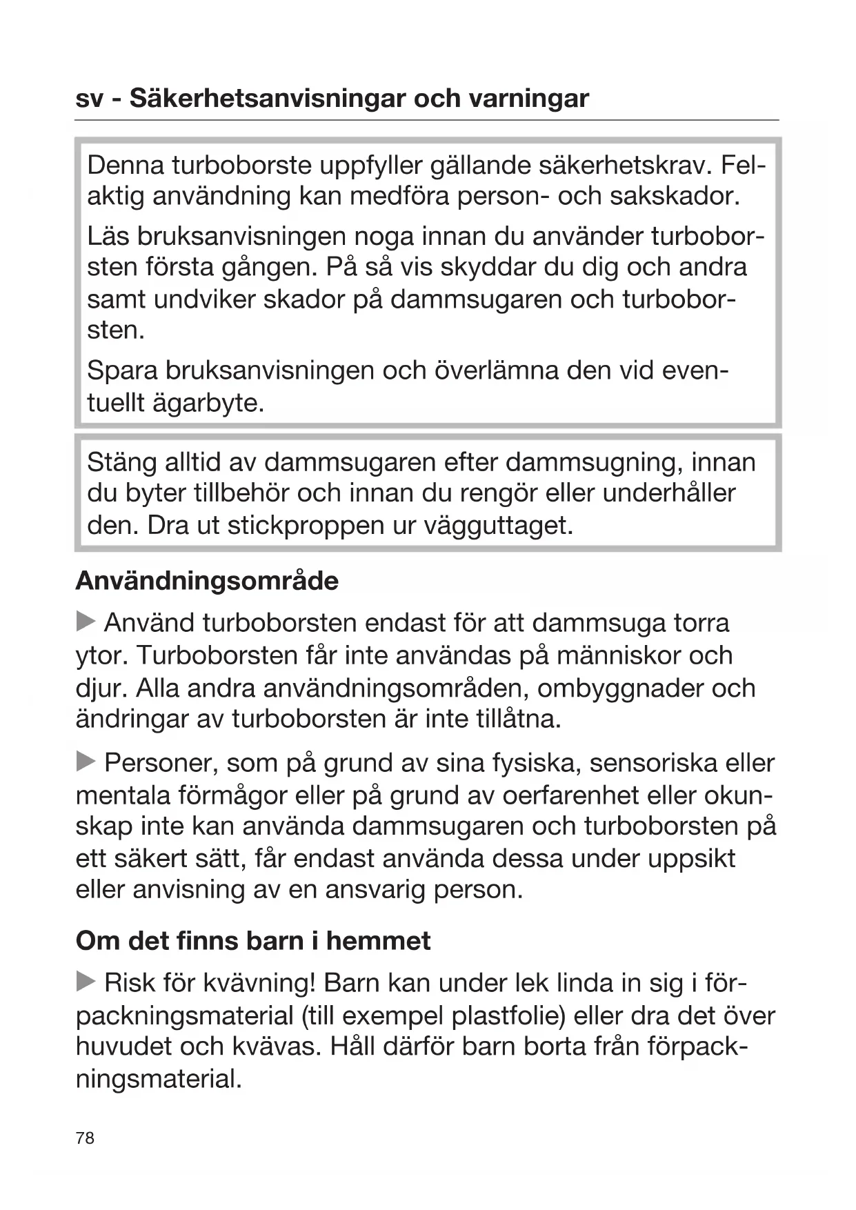 Barn frän Åtta ar och uppåt fär endast använda dammsugaren och turboborstenutan uppsikt under forutsättning att de känner till hur man använder dem på ett sakert satt. Barn måste kunna se och Förstå riskerna med en felaktig användning.