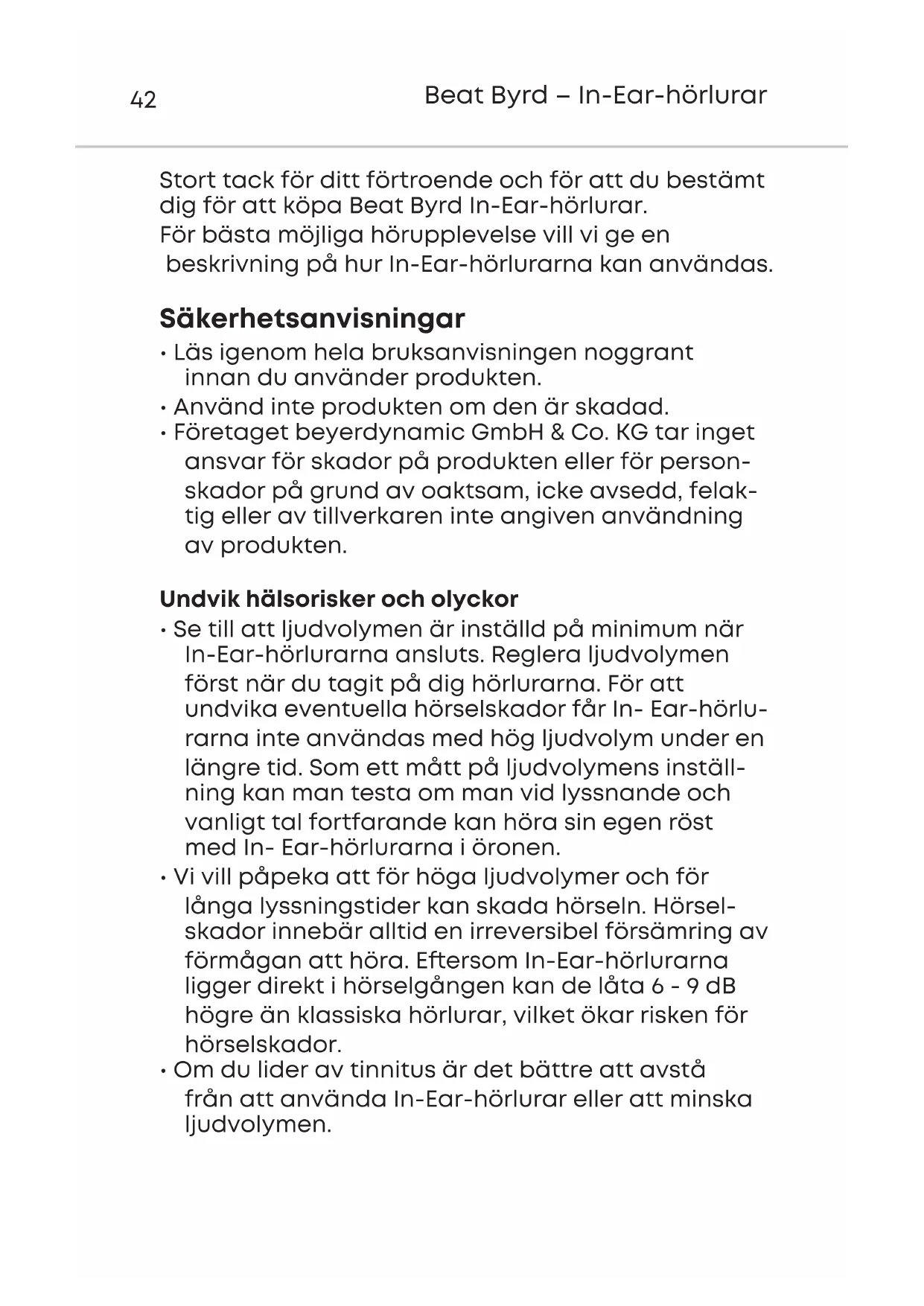 - Använd inte produkten annat än enligt beskriv- ningen i denna bruksanvisning. beyerdynamic tar inget ansvar för felaktig användning av produk- ten och dess tillbehör.svenska Beat Byrd – In-Ear-hörlurar