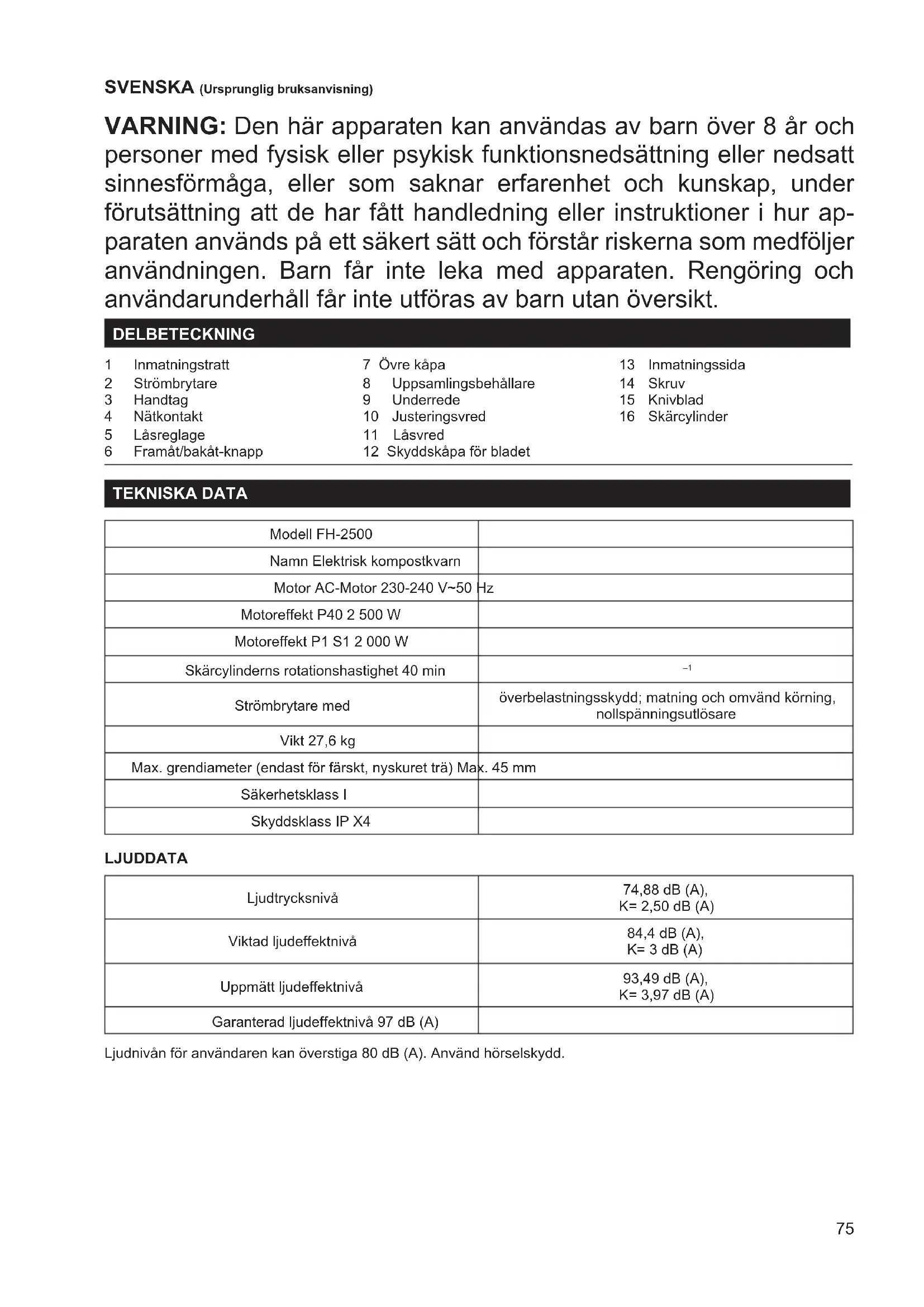 Sadece Avrupa ülkeleri için AT uygunluk beyanı bu kullanım kılavuzuna Ek A olarak eklenmiştir.75 SVENSKA (Ursprunglig bruksanvisning) VARNING: Den här apparaten kan användas av barn över 8 år och personer med fysisk eller psykisk funktionsnedsättning eller nedsatt sinnesförmåga, eller som saknar erfarenhet och kunskap, under förutsättning att de har fått handledning eller instruktioner i hur ap- paraten används på ett säkert sätt och förstår riskerna som medföljer användningen. Barn får inte leka med apparaten. Rengöring och användarunderhåll får inte utföras av barn utan översikt. DELBETECKNING 1 Inmatningstratt 2 Strömbrytare 3 Handtag 4 Nätkontakt 5 Låsreglage 6 Framåt/bakåt-knapp 7 Övre kåpa 8 Uppsamlingsbehållare 9 Underrede 10 Justeringsvred 11 Låsvred 12 Skyddskåpa för bladet 13 Inmatningssida 14 Skruv 15 Knivblad 16 Skärcylinder TEKNISKA DATA Modell FH-2500 Namn Elektrisk kompostkvarn Motor AC-Motor 230-240 V~50 Hz Motoreffekt P40 2 500 W Motoreffekt P1 S1 2 000 W Skärcylinderns rotationshastighet 40 min