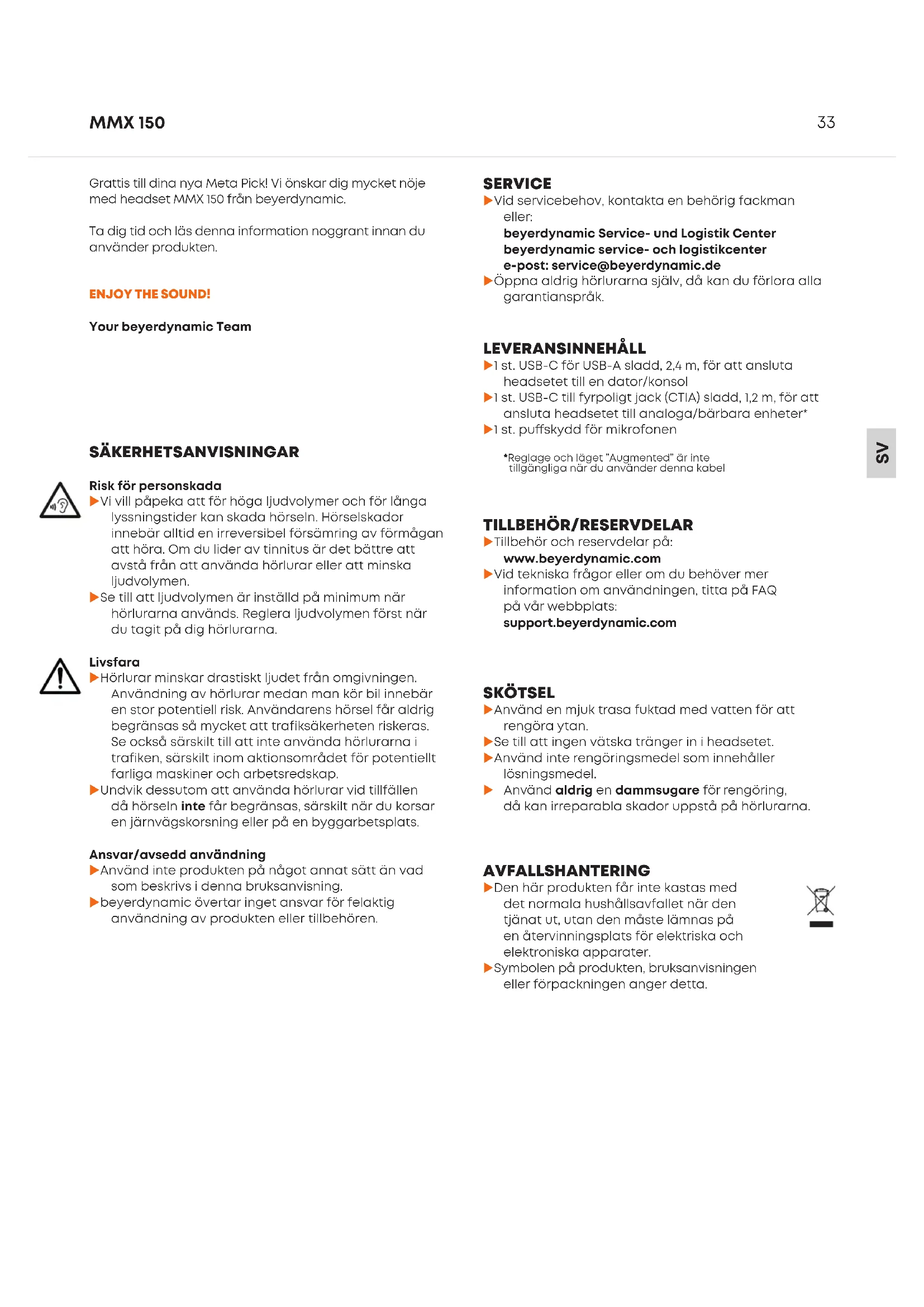 Grattis till dina nya Meta Pick! Vi önskar dig mycket nöje med headset MMX 150 från beyerdynamic. Ta dig tid och läs denna information noggrant innan du använder produkten.