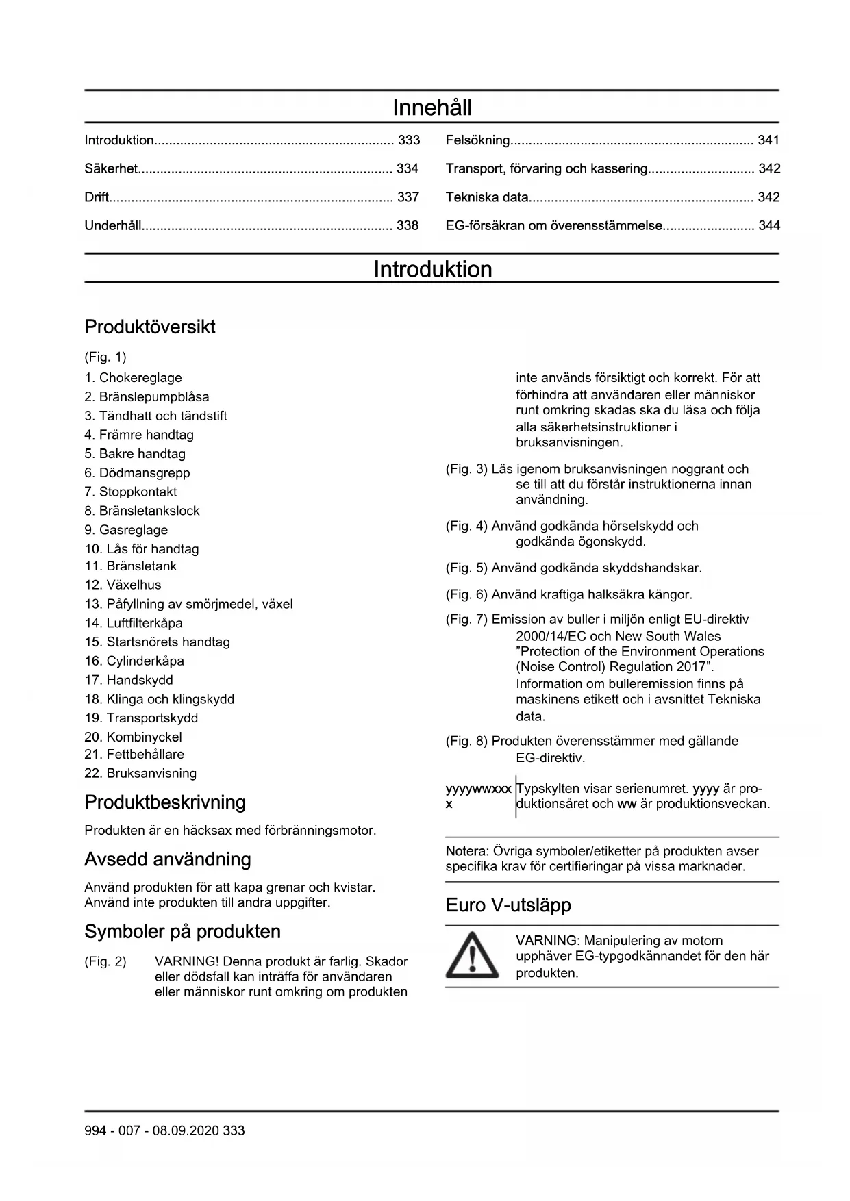 Produktbeskrivning Produkten är en häcksax med förbränningsmotor. Avsedd användning Använd produkten för att kapa grenar och kvistar. Använd inte produkten till andra uppgifter. Symboler på produkten (Fig. 2) VARNING! Denna produkt är farlig. Skador eller dödsfall kan inträffa för användaren eller människor runt omkring om produkten inte används försiktigt och korrekt. För att förhindra att användaren eller människor runt omkring skadas ska du läsa och följa alla säkerhetsinstruktioner i bruksanvisningen. (Fig. 3) Läs igenom bruksanvisningen noggrant och se till att du förstår instruktionerna innan användning. (Fig. 4) Använd godkända hörselskydd och godkända ögonskydd. (Fig. 5) Använd godkända skyddshandskar. (Fig. 6) Använd kraftiga halksäkra kängor. (Fig. 7) Emission av buller i miljön enligt EU-direktiv 2000/14/EC och New South Wales ”Protection of the Environment Operations (Noise Control) Regulation 2017”. Information om bulleremission finns på maskinens etikett och i avsnittet Tekniska data. (Fig. 8) Produkten överensstämmer med gällande EG-direktiv. yyyywwxxx