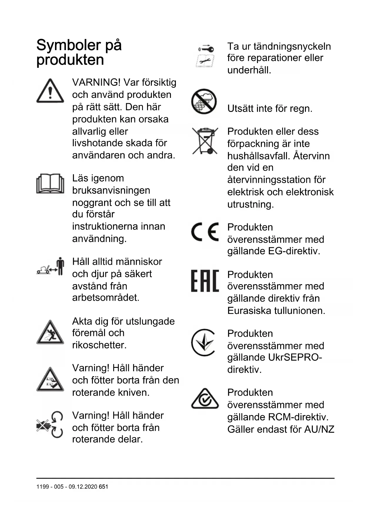 650 1199 - 005 - 09.12.2020Symboler på produkten VARNING! Var försiktig och använd produkten på rätt sätt. Den här produkten kan orsaka allvarlig eller livshotande skada för användaren och andra. Läs igenom bruksanvisningen noggrant och se till att du förstår instruktionerna innan användning. Håll alltid människor och djur på säkert avstånd från arbetsområdet. Akta dig för utslungade föremål och rikoschetter. Varning! Håll händer och fötter borta från den roterande kniven. Varning! Håll händer och fötter borta från roterande delar. Ta ur tändningsnyckeln före reparationer eller underhåll. Utsätt inte för regn. Produkten eller dess förpackning är inte hushållsavfall. Återvinn den vid en återvinningsstation för elektrisk och elektronisk utrustning. Produkten överensstämmer med gällande EG-direktiv. Produkten överensstämmer med gällande direktiv från Eurasiska tullunionen. Produkten överensstämmer med gällande UkrSEPRO- direktiv. Produkten överensstämmer med gällande RCM-direktiv. Gäller endast för AU/NZ 1199 - 005 - 09.12.2020 651Emission av buller i miljön enligt EU-direktiv 2000/14/EG och New South Wales ”Protection of the Environment Operations (Noise Control) Regulation 2017”. Information om bulleremission finns på maskinens etikett och i avsnittet Tekniska data. Produkten har droppskydd. Startprocedur: Tryck på knappen PÅ/AV, lyft på startspärren och tryck ned motorbromsbygeln. Stoppa genom att släppa motorbromsbygeln. Långsamt Snabb Kod som kan skannas Notera: Övriga symboler/etiketter på produkten avser specifika krav för certifieringar på vissa marknader. Märkning på produkten Håll händer och fötter borta från de roterande knivarna. Produktansvar Enligt lagstiftningen för produktansvar ansvarar vi inte för skador som vår produkt orsakar om: