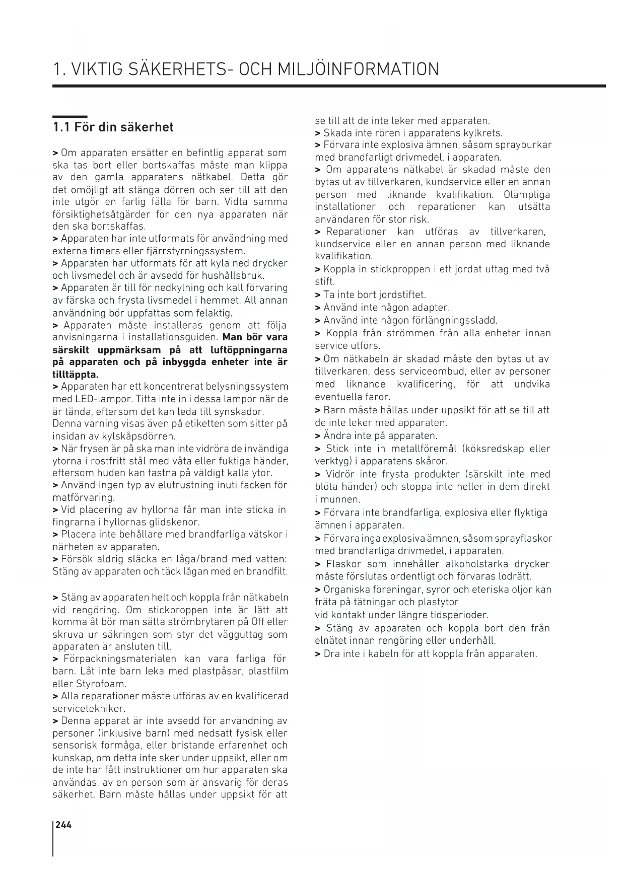 2431.1 För din säkerhet > Om apparaten ersätter en befintlig apparat som ska tas bort eller bortskaas måste man klippa av den gamla apparatens nätkabel. Detta gör det omöjligt att stänga dörren och ser till att den inte utgör en farlig fälla för barn. Vidta samma försiktighetsåtgärder för den nya apparaten när den ska bortskaas. > Apparaten har inte utformats för användning med externa timers eller fjärrstyrningssystem. > Apparaten har utformats för att kyla ned drycker och livsmedel och är avsedd för hushållsbruk. > Apparaten är till för nedkylning och kall förvaring av färska och frysta livsmedel i hemmet. All annan användning bör uppfattas som felaktig. > Apparaten måste installeras genom att följa anvisningarna i installationsguiden. Man bör vara särskilt uppmärksam på att luftöppningarna på apparaten och på inbyggda enheter inte är tilltäppta. > Apparaten har ett koncentrerat belysningssystem med LED-lampor. Titta inte in i dessa lampor när de är tända, eftersom det kan leda till synskador. Denna varning visas även på etiketten som sitter på insidan av kylskåpsdörren. > När frysen är på ska man inte vidröra de invändiga ytorna i rostfritt stål med våta eller fuktiga händer, eftersom huden kan fastna på väldigt kalla ytor. > Använd ingen typ av elutrustning inuti facken för matförvaring. > Vid placering av hyllorna får man inte sticka in fingrarna i hyllornas glidskenor. > Placera inte behållare med brandfarliga vätskor i närheten av apparaten. > Försök aldrig släcka en låga/brand med vatten: Stäng av apparaten och täck lågan med en brandfilt. > Stäng av apparaten helt och koppla från nätkabeln vid rengöring. Om stickproppen inte är lätt att komma åt bör man sätta strömbrytaren på O eller skruva ur säkringen som styr det vägguttag som apparaten är ansluten till. > Förpackningsmaterialen kan vara farliga för barn. Låt inte barn leka med plastpåsar, plastfilm eller Styrofoam. > Alla reparationer måste utföras av en kvalificerad servicetekniker. > Denna apparat är inte avsedd för användning av personer (inklusive barn) med nedsatt fysisk eller sensorisk förmåga, eller bristande erfarenhet och kunskap, om detta inte sker under uppsikt, eller om de inte har fått instruktioner om hur apparaten ska användas, av en person som är ansvarig för deras säkerhet. Barn måste hållas under uppsikt för att se till att de inte leker med apparaten. > Skada inte rören i apparatens kylkrets. > Förvara inte explosiva ämnen, såsom sprayburkar med brandfarligt drivmedel, i apparaten. > Om apparatens nätkabel är skadad måste den bytas ut av tillverkaren, kundservice eller en annan person med liknande kvalifikation. Olämpliga installationer och reparationer kan utsätta användaren för stor risk. > Reparationer kan utföras av tillverkaren, kundservice eller en annan person med liknande kvalifikation. > Koppla in stickproppen i ett jordat uttag med två stift. > Ta inte bort jordstiftet. > Använd inte någon adapter. > Använd inte någon förlängningssladd. > Koppla från strömmen från alla enheter innan service utförs. > Om nätkabeln är skadad måste den bytas ut av tillverkaren, dess serviceombud, eller av personer med liknande kvalificering, för att undvika eventuella faror. > Barn måste hållas under uppsikt för att se till att de inte leker med apparaten. > Ändra inte på apparaten. > Stick inte in metallföremål (köksredskap eller verktyg) i apparatens skåror. > Vidrör inte frysta produkter (särskilt inte med blöta händer) och stoppa inte heller in dem direkt i munnen. > Förvara inte brandfarliga, explosiva eller flyktiga ämnen i apparaten. > Förvara inga explosiva ämnen, såsom sprayflaskor med brandfarliga drivmedel, i apparaten. > Flaskor som innehåller alkoholstarka drycker måste förslutas ordentligt och förvaras lodrätt. > Organiska föreningar, syror och eteriska oljor kan fräta på tätningar och plastytor vid kontakt under längre tidsperioder. > Stäng av apparaten och koppla bort den från elnätet innan rengöring eller underhåll. > Dra inte i kabeln för att koppla från apparaten.