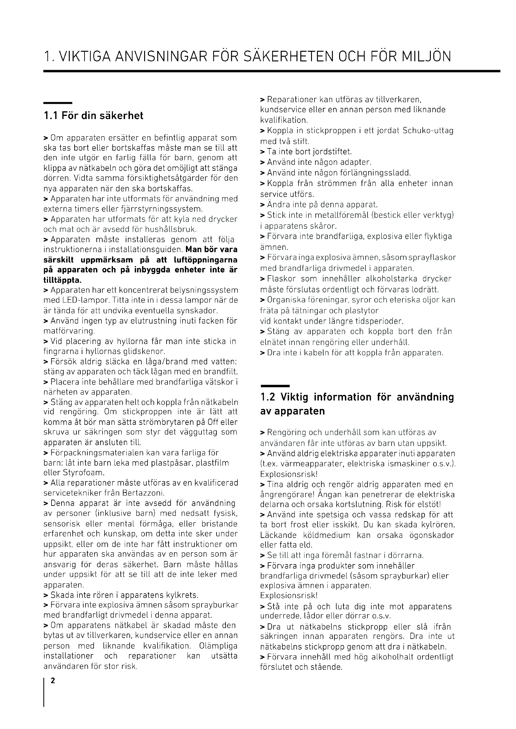 > Om apparaten ersätter en befintlig apparat som ska tas bort eller bortskaas måste man se till att den inte utgör en farlig fälla för barn, genom att klippa av nätkabeln och göra det omöjligt att stänga dörren. Vidta samma försiktighetsåtgärder för den nya apparaten när den ska bortskaas. > Apparaten har inte utformats för användning med externa timers eller fjärrstyrningssystem. > Apparaten har utformats för att kyla ned drycker och mat och är avsedd för hushållsbruk. > Apparaten måste installeras genom att följa instruktionerna i installationsguiden. Man bör vara särskilt uppmärksam på att luftöppningarna på apparaten och på inbyggda enheter inte är tilltäppta. > Apparaten har ett koncentrerat belysningssystem med LED-lampor. Titta inte in i dessa lampor när de är tända för att undvika eventuella synskador. > Använd ingen typ av elutrustning inuti facken för matförvaring. > Vid placering av hyllorna får man inte sticka in fingrarna i hyllornas glidskenor. > Försök aldrig släcka en låga/brand med vatten: stäng av apparaten och täck lågan med en brandfilt. > Placera inte behållare med brandfarliga vätskor i närheten av apparaten. > Stäng av apparaten helt och koppla från nätkabeln vid rengöring. Om stickproppen inte är lätt att komma åt bör man sätta strömbrytaren på O eller skruva ur säkringen som styr det vägguttag som apparaten är ansluten till. > Förpackningsmaterialen kan vara farliga för barn: låt inte barn leka med plastpåsar, plastfilm eller Styrofoam. > Alla reparationer måste utföras av en kvalificerad servicetekniker från Bertazzoni. > Denna apparat är inte avsedd för användning av personer (inklusive barn) med nedsatt fysisk, sensorisk eller mental förmåga, eller bristande erfarenhet och kunskap, om detta inte sker under uppsikt, eller om de inte har fått instruktioner om hur apparaten ska användas av en person som är ansvarig för deras säkerhet. Barn måste hållas under uppsikt för att se till att de inte leker med apparaten. > Skada inte rören i apparatens kylkrets. > Förvara inte explosiva ämnen såsom sprayburkar med brandfarligt drivmedel i denna apparat. > Om apparatens nätkabel är skadad måste den bytas ut av tillverkaren, kundservice eller en annan person med liknande kvalifikation. Olämpliga installationer och reparationer kan utsätta användaren för stor risk. > Reparationer kan utföras av tillverkaren, kundservice eller en annan person med liknande kvalifikation. > Koppla in stickproppen i ett jordat Schuko-uttag med två stift. > Ta inte bort jordstiftet. > Använd inte någon adapter. > Använd inte någon förlängningssladd. > Koppla från strömmen från alla enheter innan service utförs. > Ändra inte på denna apparat. > Stick inte in metallföremål (bestick eller verktyg) i apparatens skåror. > Förvara inte brandfarliga, explosiva eller flyktiga ämnen. > Förvara inga explosiva ämnen, såsom sprayflaskor med brandfarliga drivmedel i apparaten. > Flaskor som innehåller alkoholstarka drycker måste förslutas ordentligt och förvaras lodrätt. > Organiska föreningar, syror och eteriska oljor kan fräta på tätningar och plastytor vid kontakt under längre tidsperioder. > Stäng av apparaten och koppla bort den från elnätet innan rengöring eller underhåll. > Dra inte i kabeln för att koppla från apparaten.