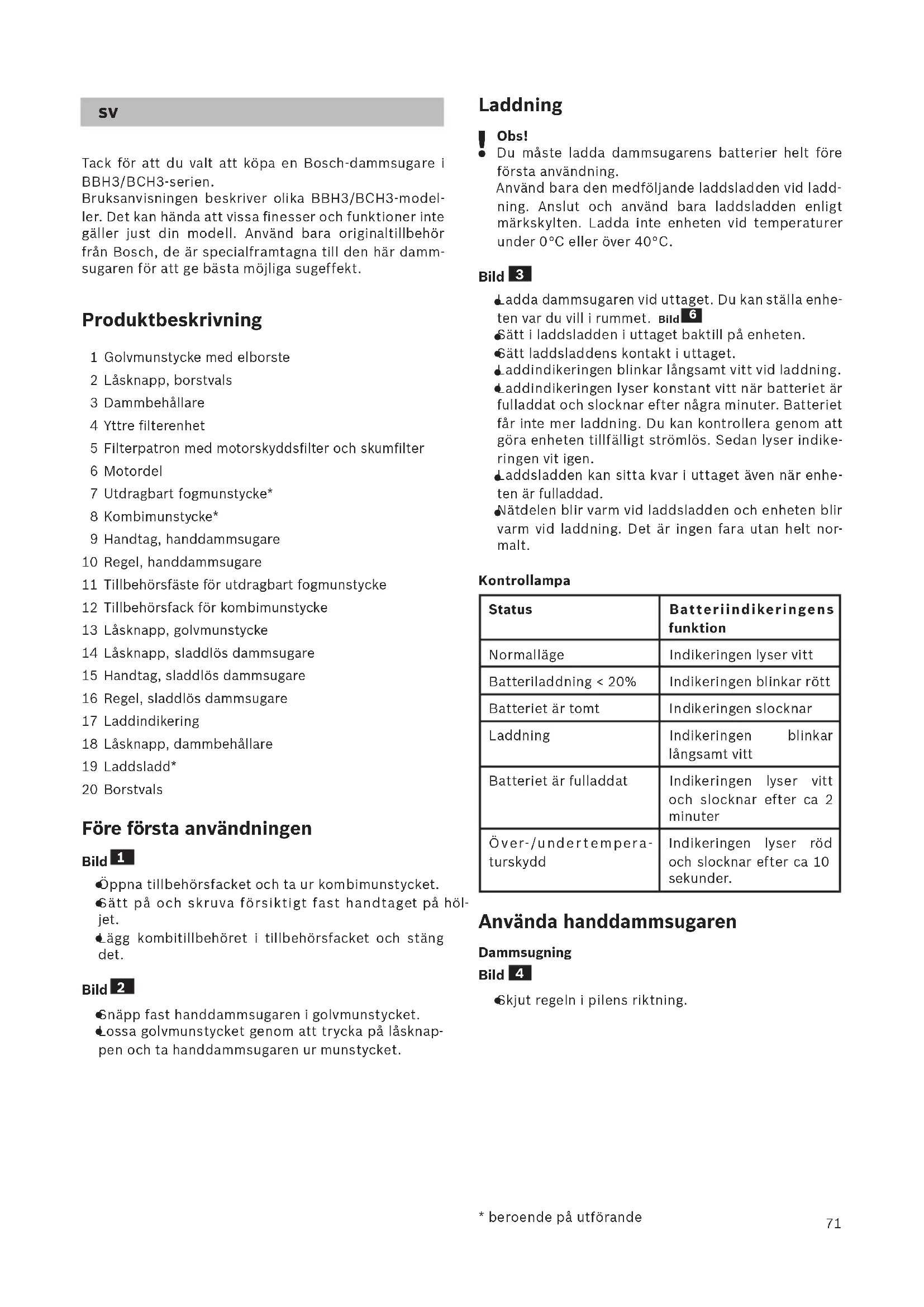 Tack för att du valt att köpa en Bosch-dammsugare i BBH3/BCH3-serien. Bruksanvisningen beskriver olika BBH3/BCH3-model- ler. Det kan hända att vissa finesser och funktioner inte gäller just din modell. Använd bara originaltillbehör från Bosch, de är specialframtagna till den här damm- sugaren för att ge bästa möjliga sugeffekt. Produktbeskrivning 1 Golvmunstycke med elborste 2 Låsknapp, borstvals 3 Dammbehållare 4 Yttre filterenhet 5 Filterpatron med motorskyddsfilter och skumfilter 6 Motordel 7 Utdragbart fogmunstycke* 8 Kombimunstycke* 9 Handtag, handdammsugare 10 Regel, handdammsugare 11 Tillbehörsfäste för utdragbart fogmunstycke 12 Tillbehörsfack för kombimunstycke 13 Låsknapp, golvmunstycke 14 Låsknapp, sladdlös dammsugare 15 Handtag, sladdlös dammsugare 16 Regel, sladdlös dammsugare 17 Laddindikering 18 Låsknapp, dammbehållare 19 Laddsladd* 20 Borstvals Före första användningen Bild
