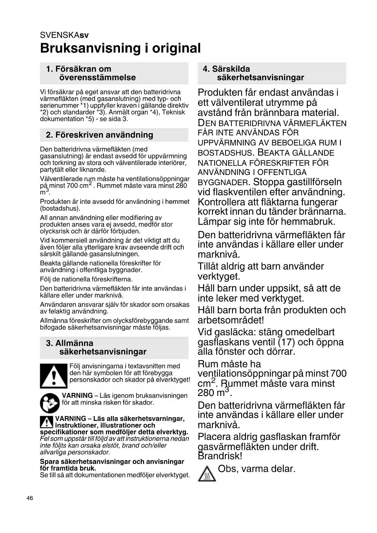 Produkten är inte avsedd för användning i hemmet (bostadshus). All annan användning eller modifiering av produkten anses vara ej avsedd, medför stor olycksrisk och är därför förbjuden. Vid kommersiell användning är det viktigt att du även följer alla ytterligare krav avseende drift och särskilt gällande gasanslutningen. Beakta gällande nationella föreskrifter för användning i offentliga byggnader. Följ de nationella föreskrifterna. Den batteridrivna värmefläkten får inte användas i källare eller under marknivå. Användaren ansvarar själv för skador som orsakas av felaktig användning. Allmänna föreskrifter om olycksförebyggande samt bifogade säkerhetsanvisningar måste följas. Följ anvisningarna i textavsnitten med den här symbolen för att förebygga personskador och skador på elverktyget! VARNING – Läs igenom bruksanvisningen för att minska risken för skador. VARNING – Läs alla säkerhetsvarningar, instruktioner, illustrationer och specifikationer som medföljer detta elverktyg. Fel som uppstår till följd av att instruktionerna nedan inte följts kan orsaka elstöt, brand och/eller allvarliga personskador. Spara säkerhetsanvisningar och anvisningar för framtida bruk. Se till så att dokumentationen medföljer elverktyget. Produkten får endast användas i ett välventilerat utrymme på avstånd från brännbara material.