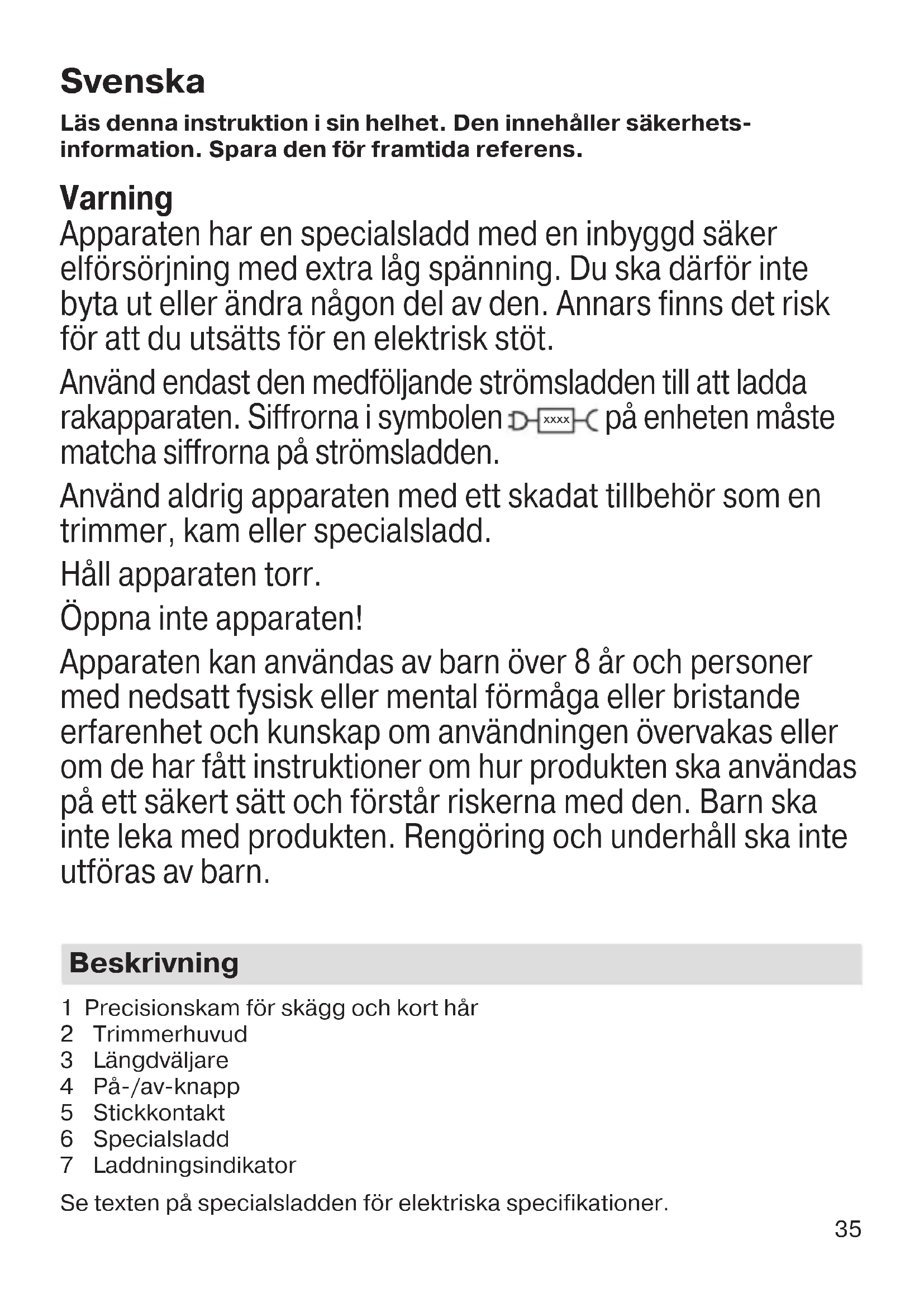 For varer kjøpt i Norge har kunden garanti i henhold til NEL’s Leveringsbe- tingelser. 90618446_Type5516_BT_3222_3221_3220_MN_ANZ.indd 3490618446_Type5516_BT_3222_3221_3220_MN_ANZ.indd 34 17.06.19 13:4217.06.19 13:42 Business Use - P&G AUTHORIZED POA-00141023 Rev 001 Effective Date 2019-06-24 Printed 2022-01-12 Page 34 of 4435 Svenska Läs denna instruktion i sin helhet. Den innehåller säkerhets- information. Spara den för framtida referens. Varning Apparaten har en specialsladd med en inbyggd säker elförsörjning med extra låg spänning. Du ska därför inte byta ut eller ändra någon del av den. Annars finns det risk för att du utsätts för en elektrisk stöt. Använd endast den medföljande strömsladden till att ladda rakapparaten. Siffrorna i symbolen xxxx på enheten måste matcha siffrorna på strömsladden. Använd aldrig apparaten med ett skadat tillbehör som en trimmer, kam eller specialsladd. Håll apparaten torr. Öppna inte apparaten! Apparaten kan användas av barn över 8 år och personer med nedsatt fysisk eller mental förmåga eller bristande erfarenhet och kunskap om användningen övervakas eller om de har fått instruktioner om hur produkten ska användas på ett säkert sätt och förstår riskerna med den. Barn ska inte leka med produkten. Rengöring och underhåll ska inte utföras av barn. Beskrivning 1 Precisionskam för skägg och kort hår 2 Trimmerhuvud 3 Längdväljare 4 På-/av-knapp 5 Stickkontakt 6 Specialsladd 7 Laddningsindikator Se texten på specialsladden för elektriska specifikationer. 90618446_Type5516_BT_3222_3221_3220_MN_ANZ.indd 3590618446_Type5516_BT_3222_3221_3220_MN_ANZ.indd 35 17.06.19 13:4217.06.19 13:42 Business Use - P&G AUTHORIZED POA-00141023 Rev 001 Effective Date 2019-06-24 Printed 2022-01-12 Page 35 of 4436 Laddning Rekommenderad omgivningstemperatur vid laddning är 5 °C till 35 °C. Vid extremt låga eller höga temperaturer kan det hända att batteriet inte laddas ordentligt eller inte laddas alls. Rekommenderad omgivningstempe- ratur för trimning är 15°C till 35°C. Rakapparaten får inte utsättas för tempe- raturer överstigande 50°C under en längre tid.