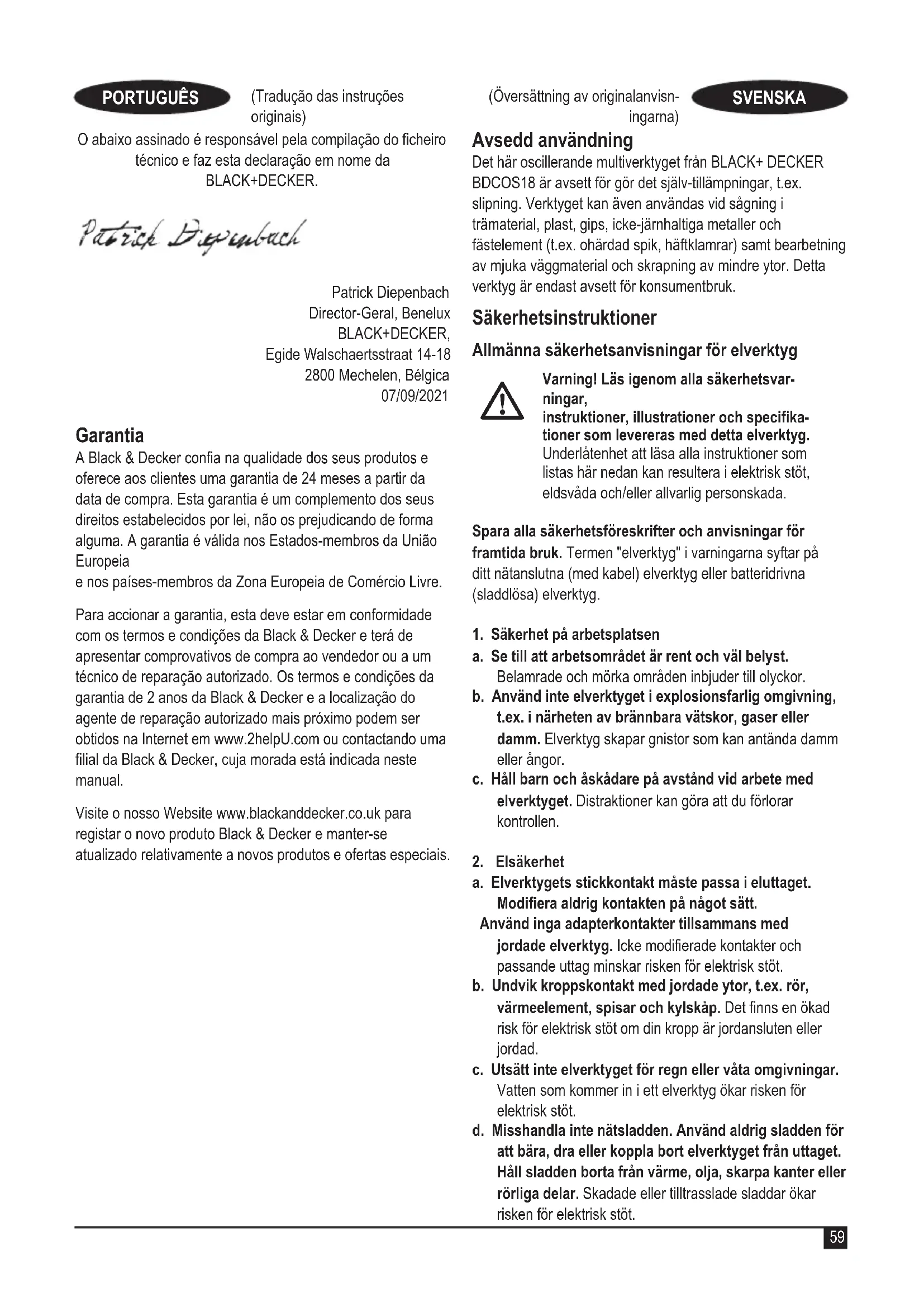 Sladdlöst oscillerande verktyg - BDCOS1866 (Översättning av originalanvis- ningarna) SVENSKA (Oversettelse av de opprinnelige instruksjonene) NORSK BLACK+DECKER garanterar att produkterna som beskrivs under ”Tekniska data” uppfyller: 2006/42/EC, EN 62841-1:2015, EN 62841-2-4:2014 De här produkterna överensstämmer även med direktiven 2014/30/EU och 2011/65/EU. Mer information får du genom att kontakta BLACK+DECKER på följande address eller titta i slutet av bruksanvisningen. Undertecknad är ansvarig för sammanställningen av den tekniska len och lämnar denna deklaration på uppdrag av BLACK+DECKER. Patrick Diepenbach General Manager, Benelux BLACK+DECKER, Egide Walschaertsstraat 14-18 2800 Mechelen, Belgien 07/09/2021 Garanti Black & Decker är säker på kvaliteten hos denna produkt och erbjuder kunder 24 månaders garanti från inköpsdatumet. Denna garanti är ett tillägg till dina lagstadgade rättigheter och påverkar inte dessa på något sätt. Garantin är giltig i de territorier som tillhör medlemsstaterna i Europeiska unionen och det europeiska frihandelsområdet. För yrkande under garantin måste yrkandet vara in enlighet med Black & Deckers villkor och du kommer att behöva skicka in bevis på köpet till försäljaren eller en auktoriserad reparatör. Villkoren för Black & Deckers tvååriga garanti och var du hittar din närmaste auktoriserade reparatör kan erhållas på Internet på www.2helpU.com, eller genom att kontakta ditt lokal Black & Decker kontor på adressen som angetts i denna bruksanvisning. Besök vår webbplats www.blackanddecker.co.uk för att registrera din nya Black & Decker-produkt samt för att få information om nya produkter och specialerbjudanden. Tiltenkt bruk Dette oscillerende verktøyet fra BLACK+DECKER BDCOS18 er konstruert for gjør det selv-oppgaver, for eksempel sliping. Det er også egnet for kutting av tre, plast, gips, metaller og festeelementer som ikke inneholder jern (f.eks. uherdede spiker og stifter), bearbeiding av myke veggiser og skraping av små overater. Dette verktøyet er bare ment som et forbrukerverktøy. Sikkerhetsinstruksjoner Generelle sikkerhetsadvarsler for elektroverktøy