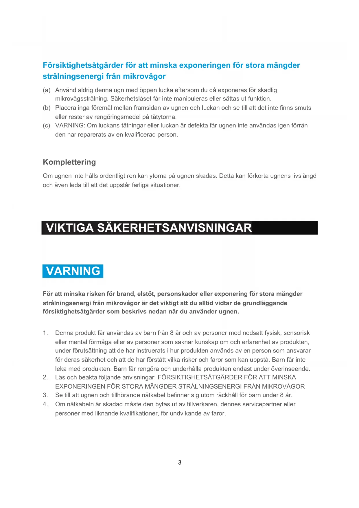 33 Spara energi 33 Miljövänlig avfallshantering3 Försiktighetsåtgärder för att minska exponeringen för stora mängder strålningsenergi från mikrovågor (a) Använd aldrig denna ugn med öppen lucka eftersom du då exponeras för skadlig mikrovågsstrålning. Säkerhetslåset får inte manipuleras eller sättas ut funktion. (b) Placera inga föremål mellan framsidan av ugnen och luckan och se till att det inte finns smuts eller rester av rengöringsmedel på tätytorna. (c) VARNING: Om luckans tätningar eller luckan är defekta får ugnen inte användas igen förrän den har reparerats av en kvalificerad person.