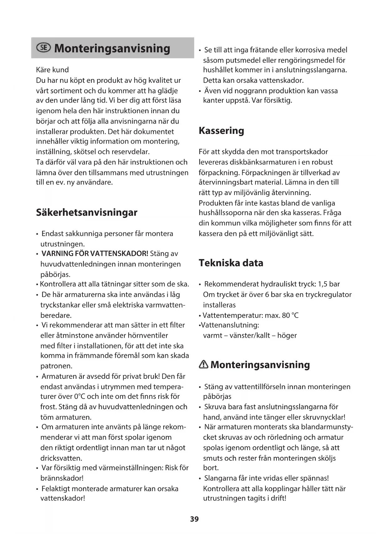 - Även vid noggrann produktion kan vassa kanter uppstå. Var försiktig. Kassering För att skydda den mot transportskador levereras diskbänksarmaturen i en robust förpackning. Förpackningen är tillverkad av återvinningsbart material. Lämna in den till rätt typ av miljövänlig återvinning. Produkten får inte kastas bland de vanliga hushållssoporna när den ska kasseras. Fråga din kommun vilka möjligheter som nns för att kassera den på ett miljövänligt sätt. Tekniska data