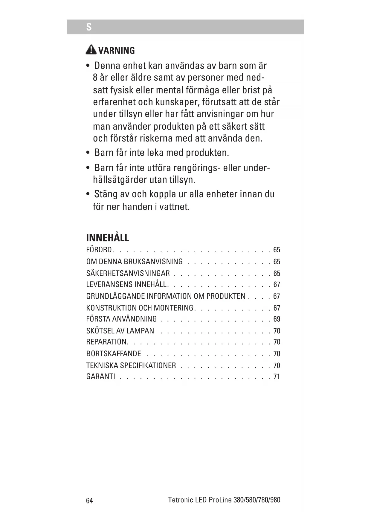 - Stäng av och koppla ur alla enheter innan du för ner handen i vattnet. INNEHÅLL FÖRORD . . . . . . . . . . . . . . . . . . . . . . . . 65