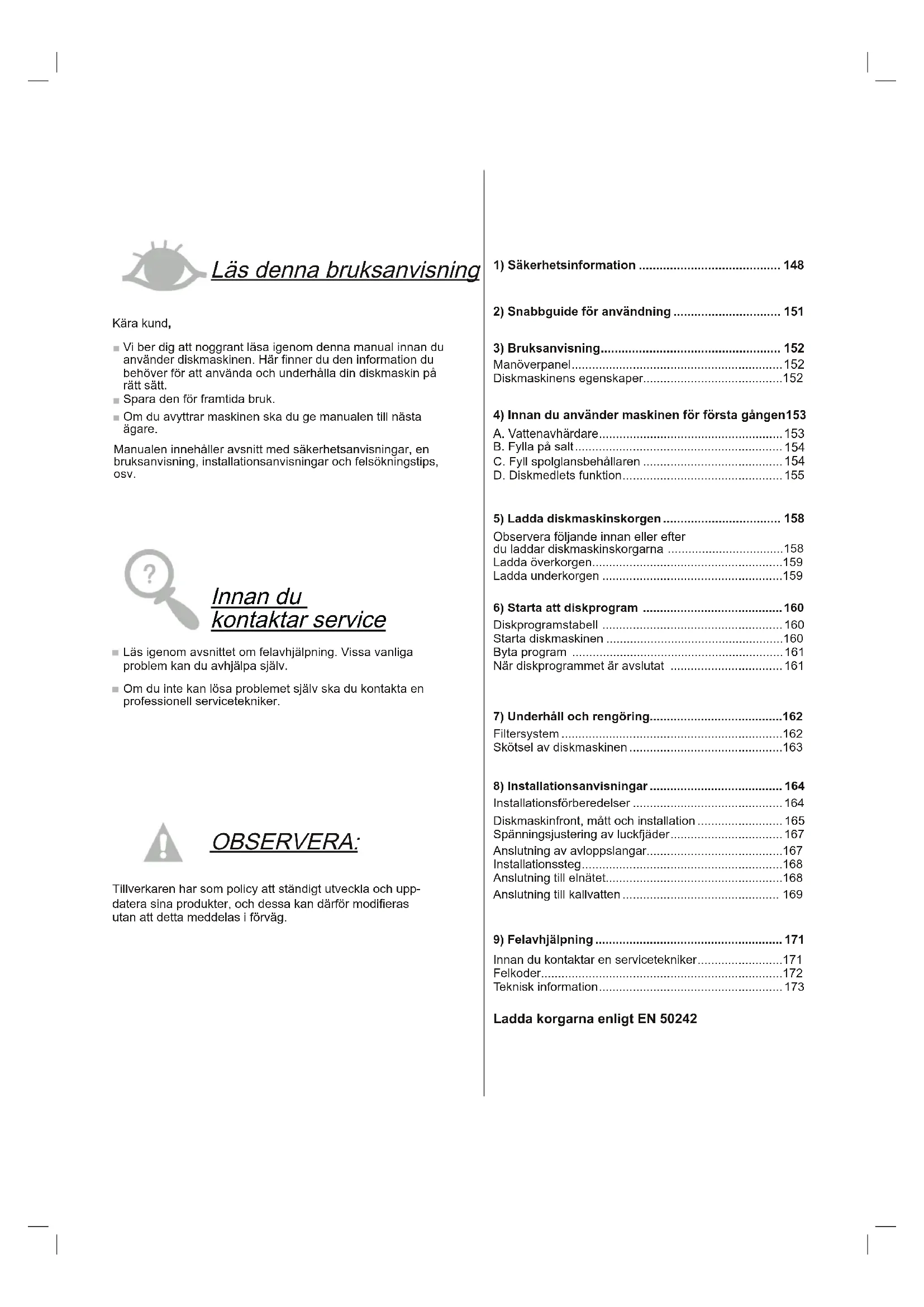 1) Säkerhetsinformation ......................................... 148
