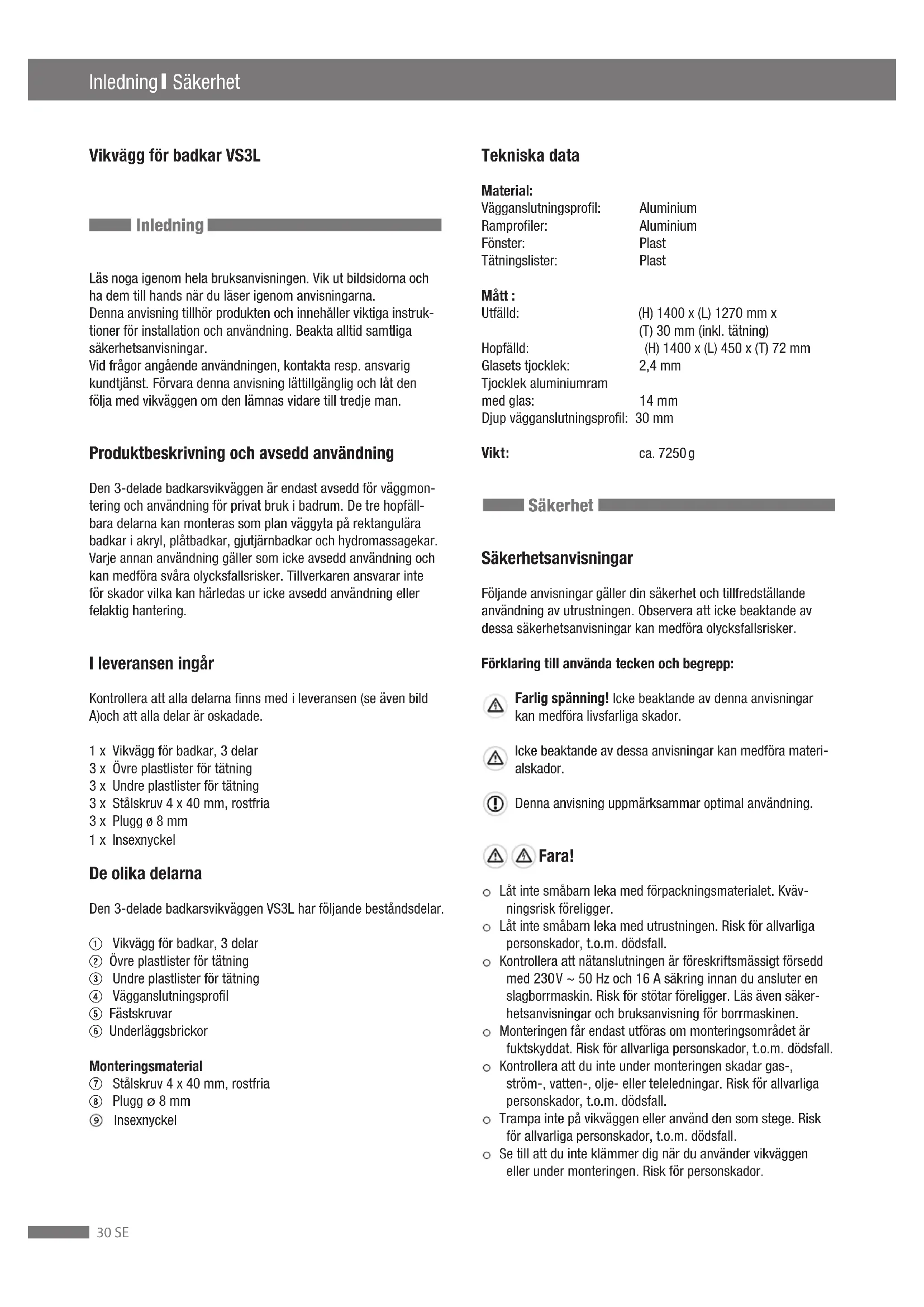 med 3 underläggsbrickor Säkerhet Montering BA_Faltw_Kö469_content.indd 55 23.09.2005 15:50:58 Uhr Välj passande plasttätning enligt milimeteruppgifterna i bild 54 S Vikvägg för badkar VS3L Inledning Läs noga igenom hela bruksanvisningen. Vik ut bildsidorna och ha dem till hands när du läser igenom anvisningarna. Denna anvisning tillhör produkten och innehåller viktiga instruk- tioner för installation och användning. Beakta alltid samtliga säkerhetsanvisningar. Vid frågor angående användningen, kontakta resp. ansvarig kundtjänst. Förvara denna anvisning lättillgänglig och låt den följa med vikväggen om den lämnas vidare till tredje man. Produktbeskrivning och avsedd användning Den 3-delade badkarsvikväggen är endast avsedd för väggmon- tering och användning för privat bruk i badrum. De tre hopfäll- bara delarna kan monteras som plan väggyta på rektangulära badkar i akryl, plåtbadkar, gjutjärnbadkar och hydromassagekar. Varje annan användning gäller som icke avsedd användning och kan medföra svåra olycksfallsrisker. Tillverkaren ansvarar inte för skador vilka kan härledas ur icke avsedd användning eller felaktig hantering. I leveransen ingår Kontrollera att alla delarna finns med i leveransen (se även bild A)och att alla delar är oskadade. 1 x Vikvägg för badkar, 3 delar 3 x Övre plastlister för tätning 3 x Undre plastlister för tätning 3 x Stålskruv 4 x 40 mm, rostfria 3 x Plugg ø 8 mm De olika delarna Den 3-delade badkarsvikväggen VS3L har följande beståndsdelar.
