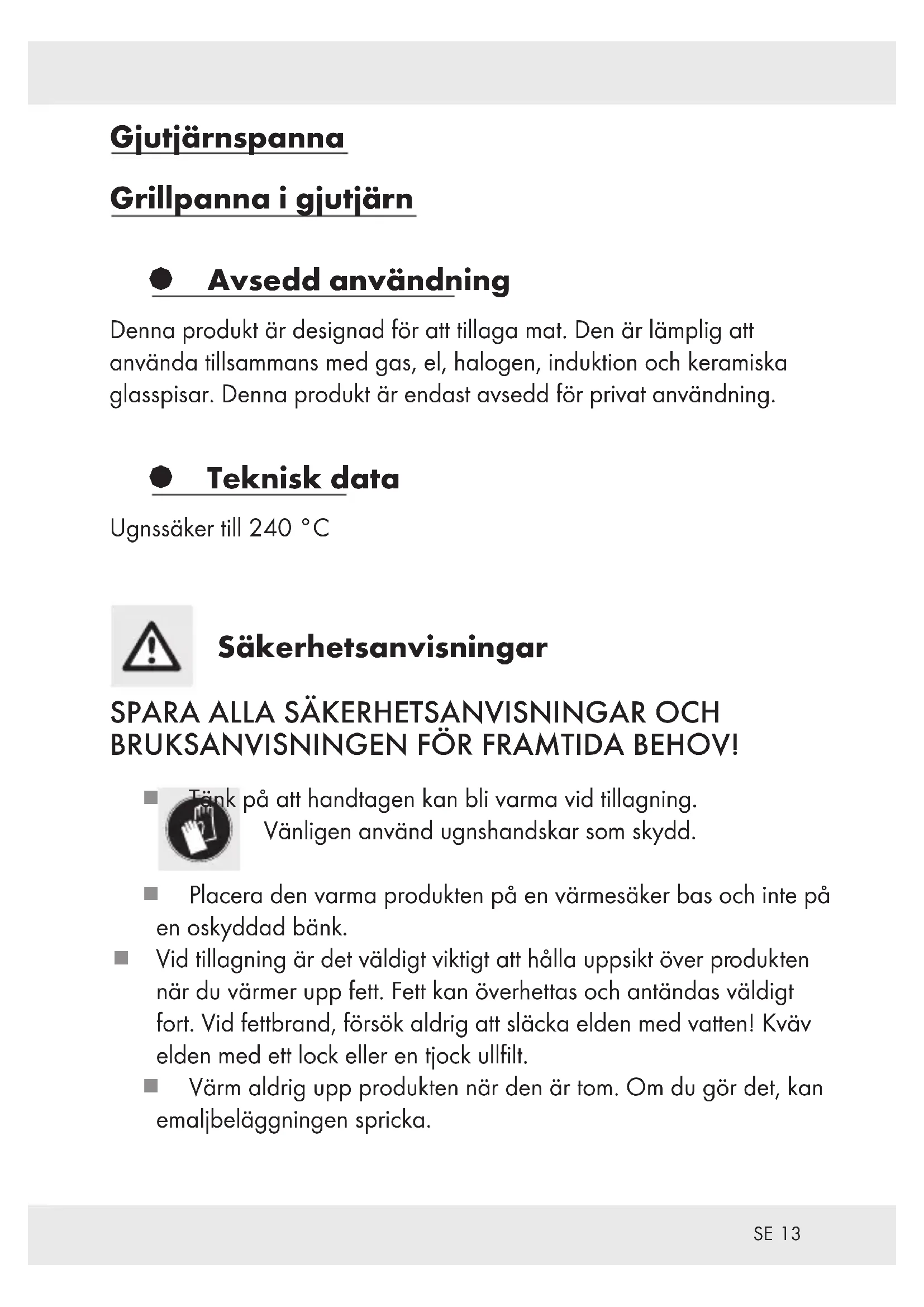 Gjutjärnspanna Grillpanna i gjutjärn § Avsedd användning Denna produkt är designad för att tillaga mat. Den är lämplig att använda tillsammans med gas, el, halogen, induktion och keramiska glasspisar. Denna produkt är endast avsedd för privat användning. § Teknisk data Ugnssäker till 240 °C Säkerhetsanvisningar